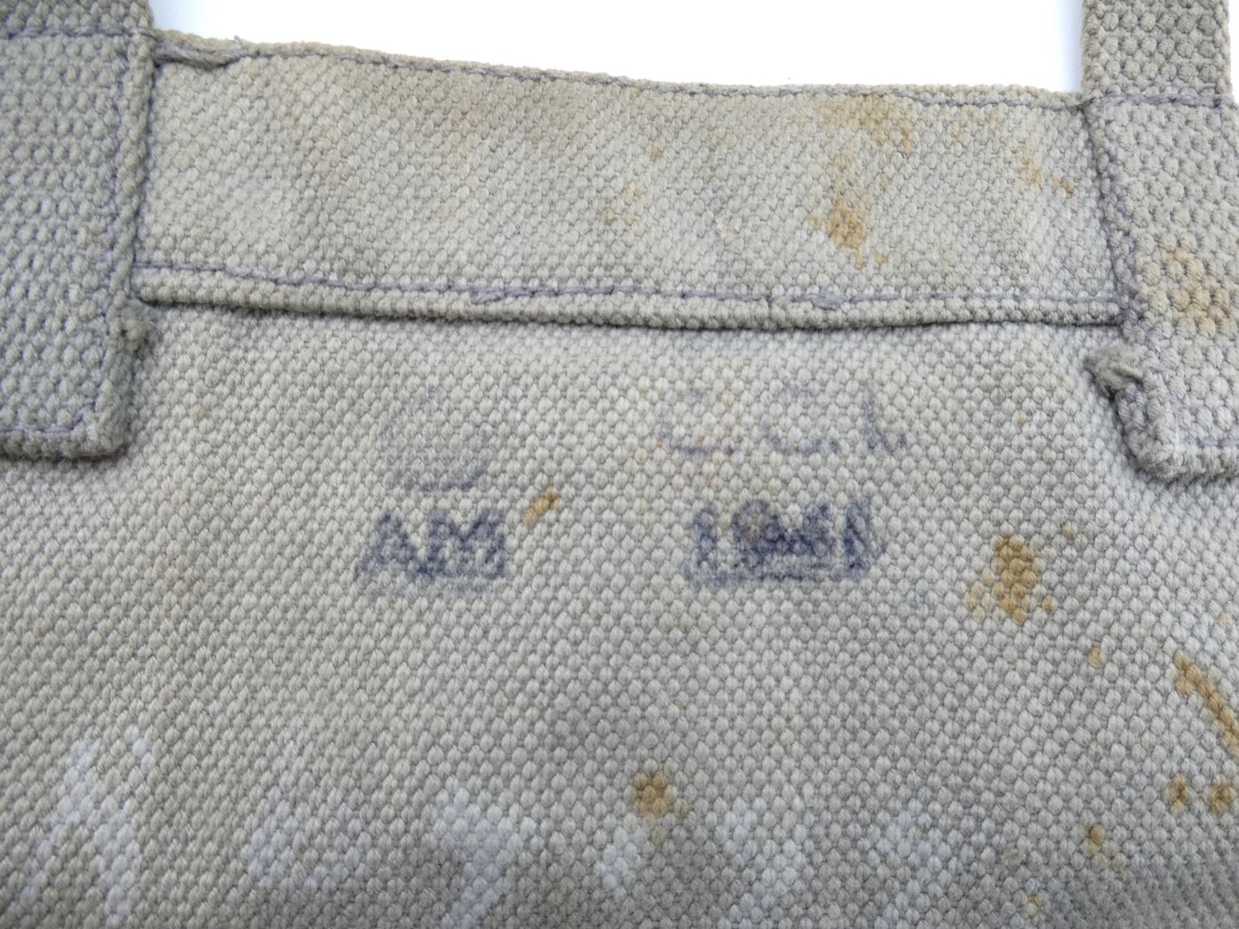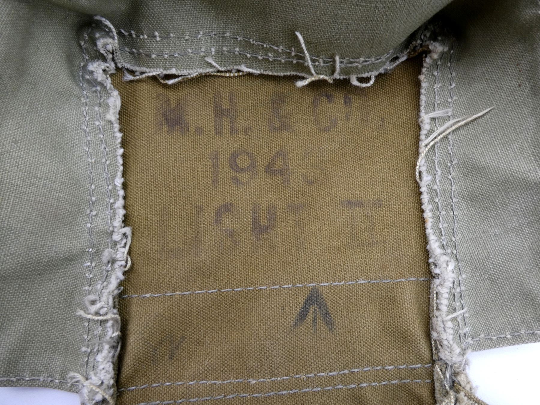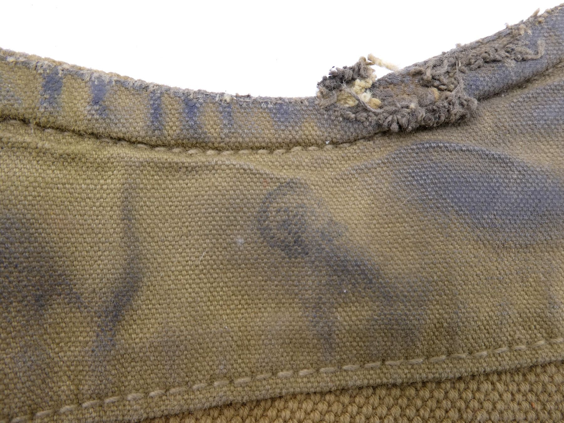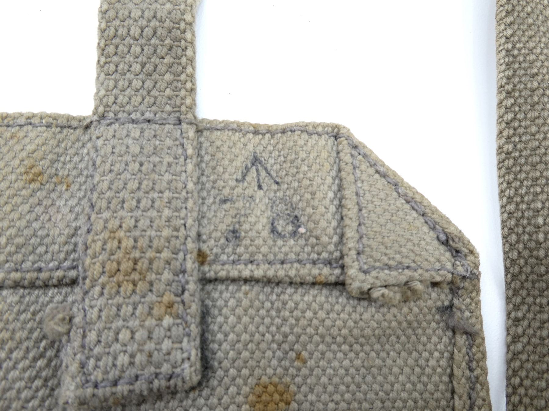 LOT INCLUDES; (1) WWII CANADIAN GREY / BLUE P37 WEB CANVAS SMALL FIELD PACK, MARKED: "C.C.L., AM 1941" WITH FAINT C-BROAD ARROW, BROAD ARROW OVER "78", VARIOUS HAND-WRITTEN MARKINGS, WITH SHOULDER STRAP, SHOWS AGE / WEAR, (1) WWII CANADIAN GAS MASK BAG, FAINTLY MARKED: "VII", "1943" WITH C-BROAD ARROW, VARIOUS OTHER FAINT / UN-CLEAR MARKINGS, VARIOUS POCKETS, TAN CANVAS SHOULDER STRAP, SHOWS AGE / WEAR, (1) TAN CANVAS DRAWSTRING BAG, MARKED: "CANADIAN RED CROSS, SOCIETY" WITH RED CROSS SYMBOL, SHOWS AGE / WEAR, (1) WWII BRITISH LIGHT GAS MASK CARRY BAG, MARKED: "M.H. & CO., 1943, LIGHT II" WITH BROAD ARROW, GREEN CANVAS SHOULDER STRAP, SHOWS AGE / WEAR, (2) TAN P37 WEB SHOULDER STRAPS, ONE MARKED WITH FAINT C-BROAD ARROW, HAND-WRITTEN: "SF31873", OTHER MARKED WITH BROAD ARROW OVER "115", VARIOUS OTHER FAINT / UN-CLEAR MARKINGS, OALS APPROX. 46.25" & (1) PAIR OF GAITERS, TAN P37 WEB, MARKED WITH C-BROAD ARROWS, SHOWS AGE / WEAR. SEE PHOTOS.