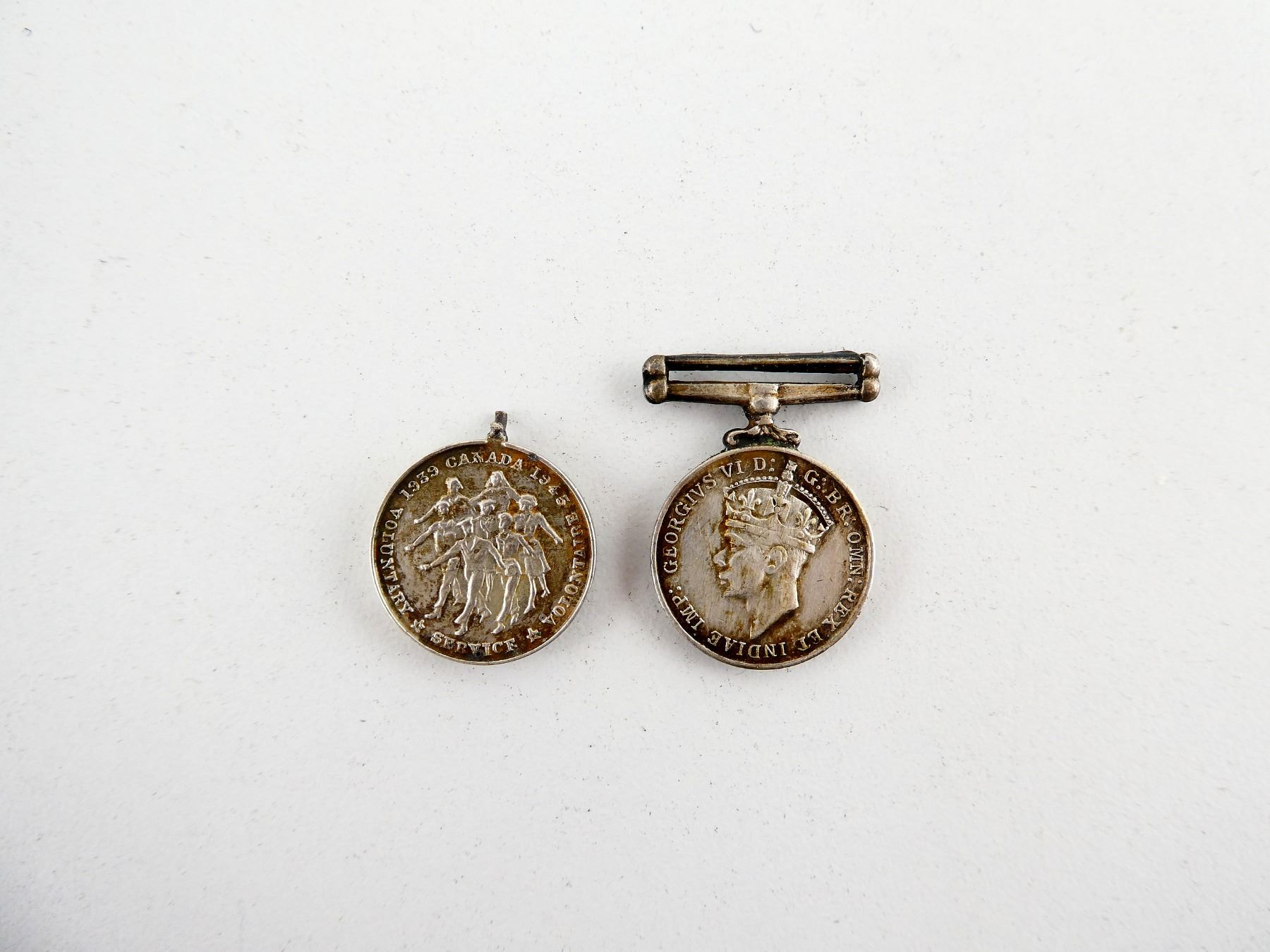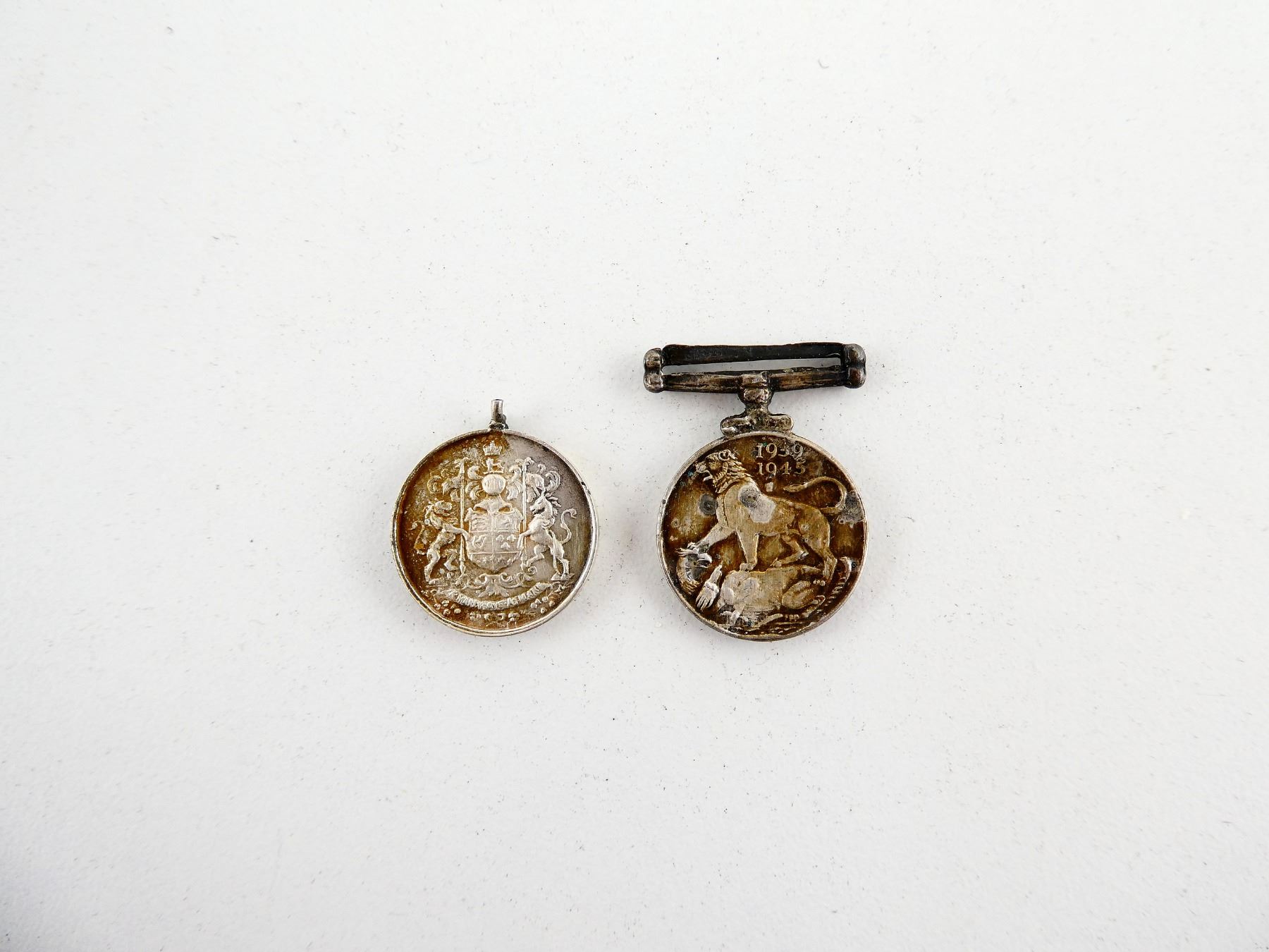 LOT INCLUDES; (1) MINIATURE WWII CANADIAN VOLUNTARY SERVICE MEDAL, MISSING SUSPENSION RING / RIBBON & (1) MINIATURE WWII CANADIAN 1939-1945 WAR MEDAL WITH SUSPENSION RING, RIBBON IS MISSING. SEE PHOTOS.
