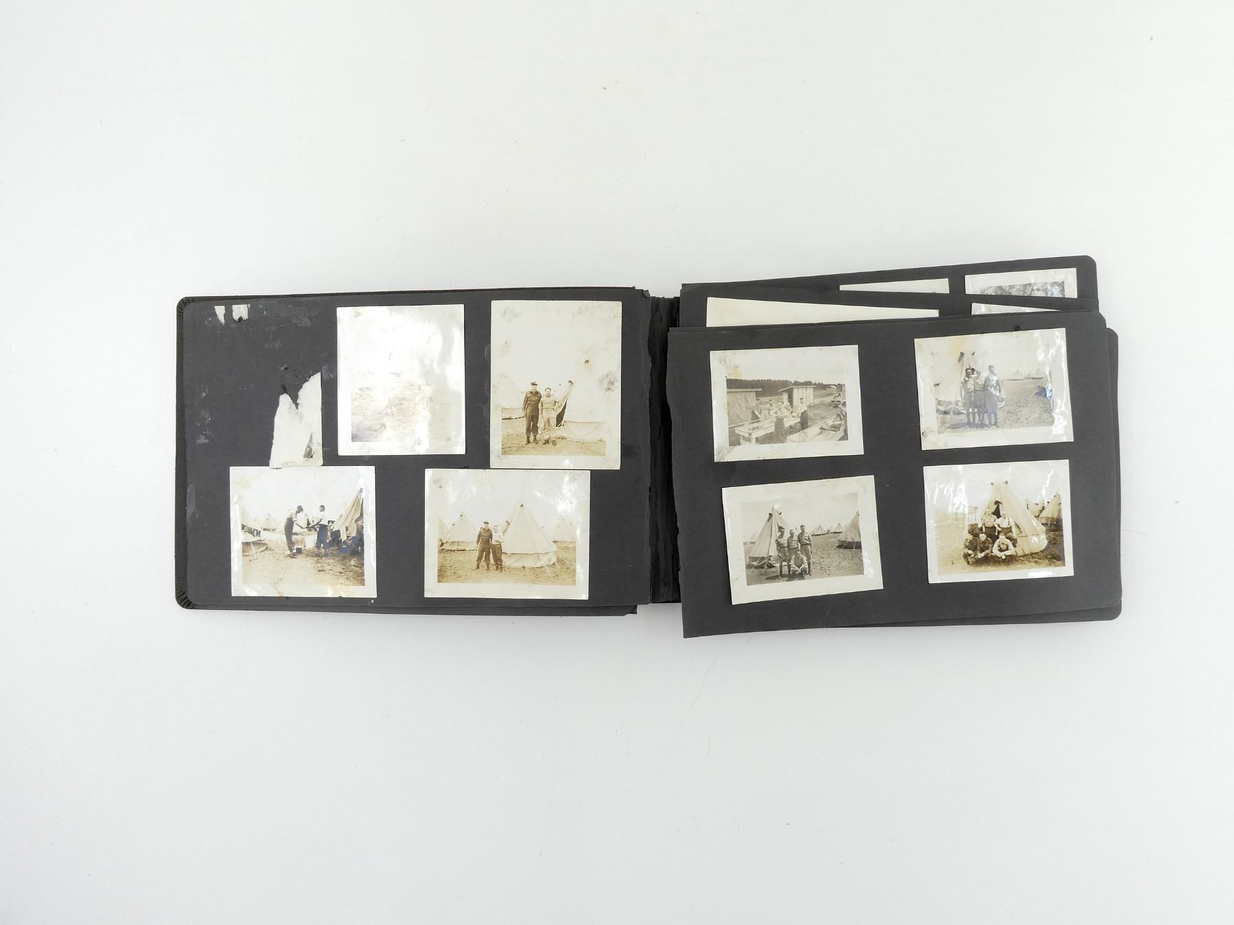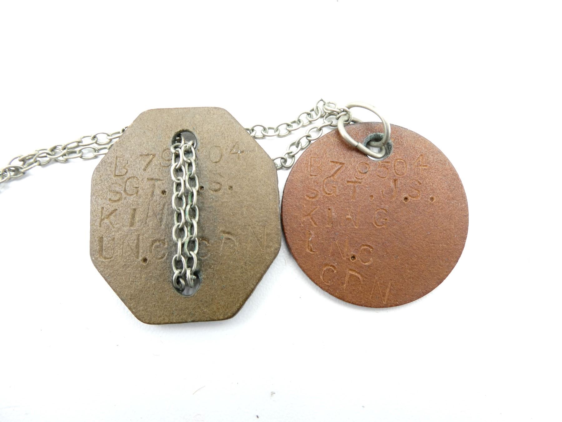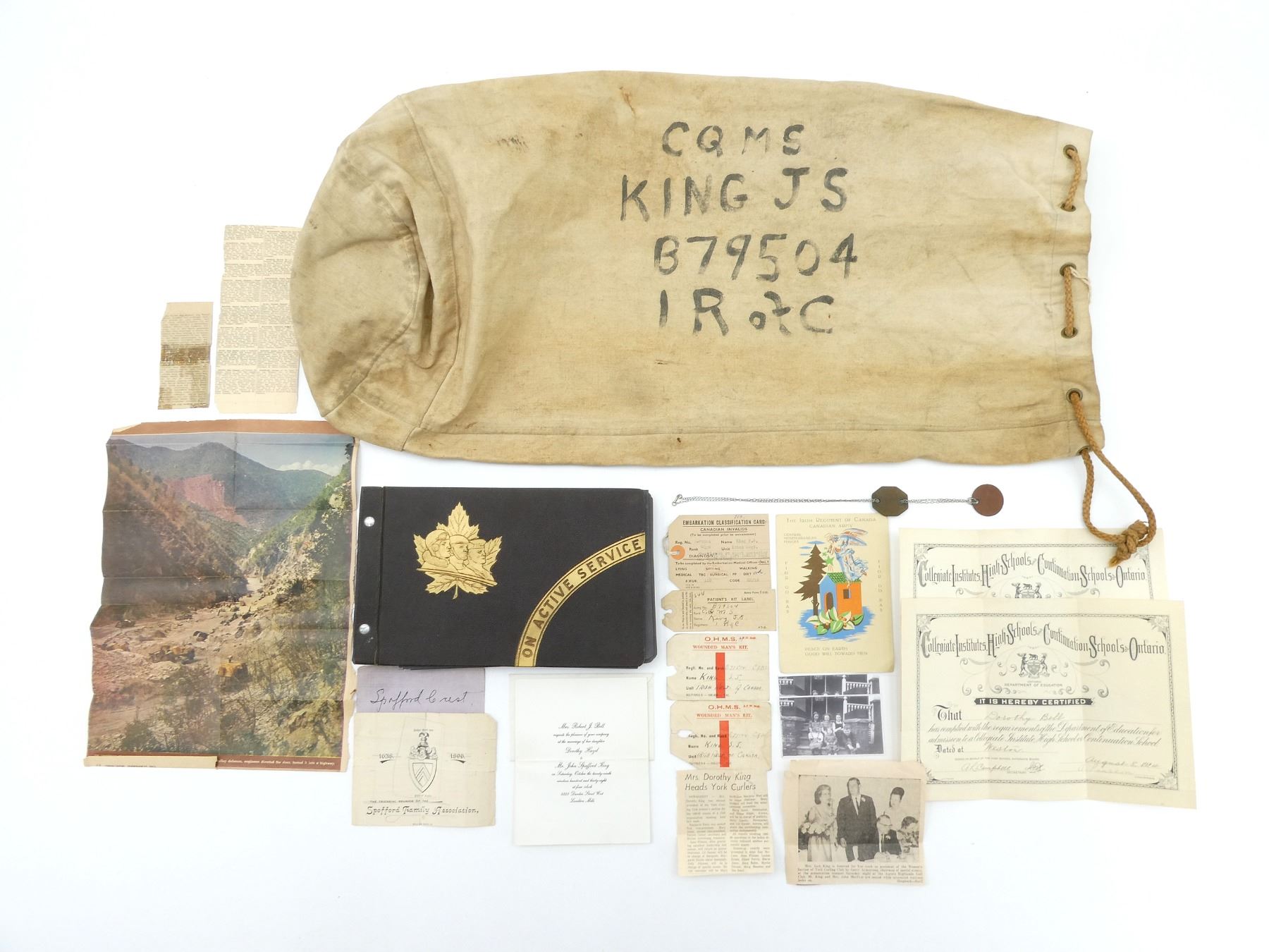 ITEMS NAMED TO JOHN SPAFFORD "JACK" KING OF THE IRISH REGIMENT OF CANADA & FAMILY, LOT INCLUDES; (1) PHOTO ALBUM MARKED: "ON ACTIVE SERVICE" WITH APPROX. (70) BLACK / WHITE PHOTOS OF MEMBERS OF THE IRISH REGIMENT OF CANADA, MEN ON PARADE, IN TENT ENCAMPMENTS, GROUP PHOTOS, ETC., (1) SET OF DOG TAGS NAMED TO: "B79504, SGT. J.S. KING, UNC CND", ONE ROUND, OTHER OCTAGONAL WITH ORIGINAL CHAIN NECKLACE AS ISSUED, (1) THE IRISH REGIMENT OF CANADA CENTRAL MEDITERRANEAN FORCES CHRISTMAS / NEW YEARS CARD, MARKED: "WARRANT OFFICERS & SERGEANTS' MESS, ITALY 1944", (4) WWII OFFICIAL MILITARY TAGS, O.H.M.S. WOUNDED MAN'S KIT TAGS, PATIENT'S KIT LABEL TAG, EMBARKATION CLASSIFICATION CARD CANADIAN INVALIDS TAG, ALL NAMED TO "B79504, KING. S.J." / "B79504, KING. J.S.", (5) NEWSPAPER CLIPPINGS ON VARIOUS MEMBERS OF JACK'S FAMILY, DEATH NOTICE, ARTICLES ON WIFE / MOTHER-IN-LAW, ETC., SEE PHOTOS.