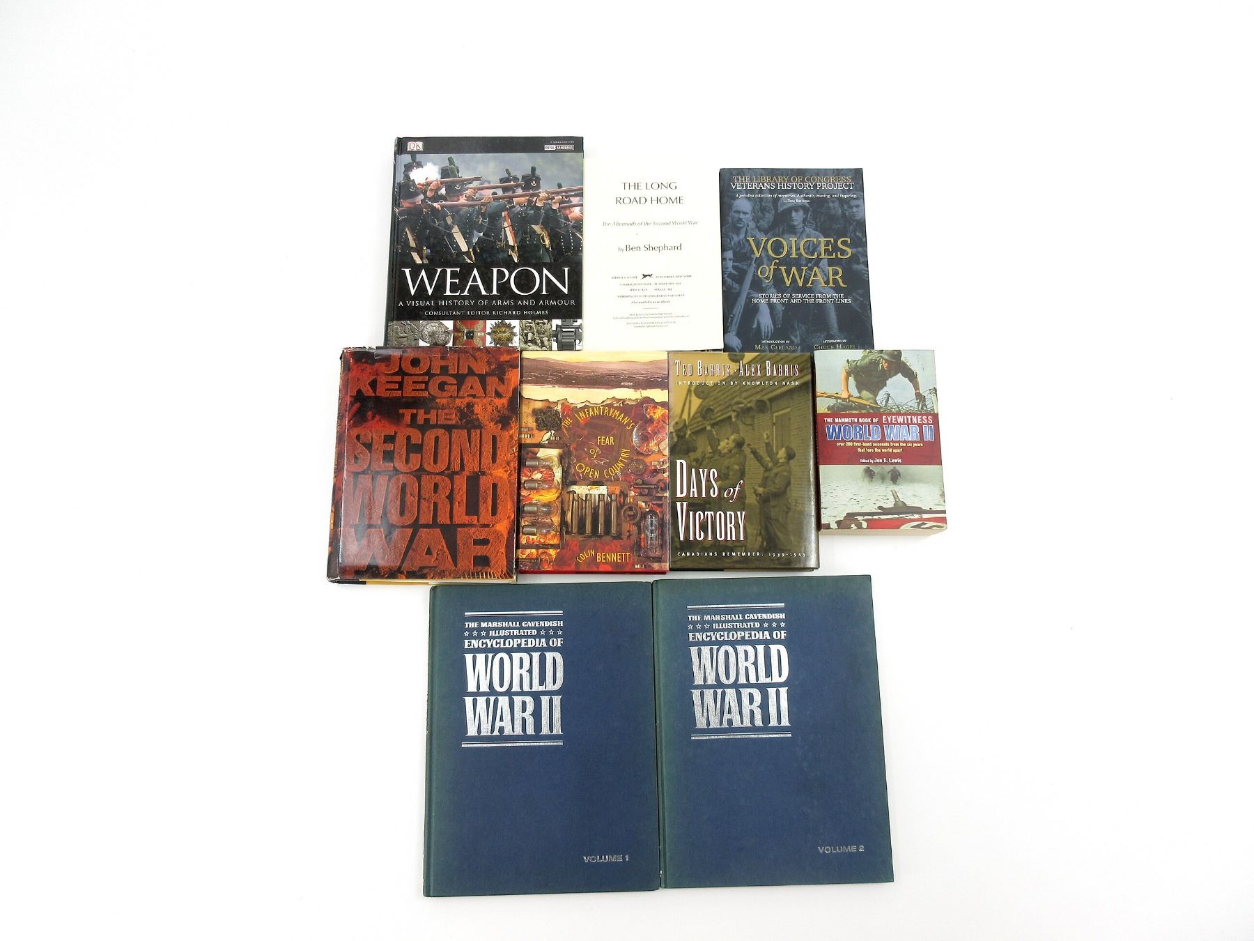 LOT INCLUDES; (1) "THE MAMMOTH BOOK OF EYEWITNESS WORLD WAR II" BOOK EDITED BY JON E. LEWIS, SOFT COVER, ISBN: 978-0-7867-1071-3, (1) "THE SECOND WORLD WAR" BOOK BY JOHN KEEGAN, HARD COVER WITH DUST COVER, ISBN: 0-670-82359-7, (1) "WEAPON, A VISUAL HISTORY OF ARMS AND ARMOR" BOOK, HARD COVER, ISBN: 978-1-4053-6329-7, (1) "THE MARSHALL CAVENDISH ILLUSTRATED ENCYCLOPEDIA OF WORLD WAR II, VOLUME 1, 1936-1939" BOOK, HARD COVER, COPYRIGHT 1972, (1) "THE MARSHALL CAVENDISH ILLUSTRATED ENCYCLOPEDIA OF WORLD WAR II, VOLUME 2, 1940" BOOK, HARD COVER, COPYRIGHT 1972, (1) "VOICES FROM D-DAY" BOOK EDITED BY JON E. LEWIS, SOFT COVER, ISBN: 978-1-4721-0398-7, (1) "THE DIEPPE RAID" BOOK BY ROBIN NEILLANDS, SOFT COVER, ISBN: 978-1-84513-166-1, (1) "I WAS A STRANGER" BOOK BY GEN. SIR JOHN HACKETT, SOFT COVER, ISBN: 0-7012-0802-3, (1) "THE BATTLE OF HURTGEN FOREST" BOOK BY CHARLES WHITING, SOFT COVER, ISBN: 978-1-86227-396-2, (1) "RANGERS IN WORLD WAR II" BOOK BY ROBERT W. BLACK, SOFT COVER, ISBN: 0-8041-0565-0, (1) "COMBAT OFFICER, A MEMOIR OF WAR IN THE SOUTH PACIFIC" BOOK BY CHARLES H. WALKER, SOFT COVER, ISBN: 0-345-46385-4 & (1) "FLAGS OF OUR FATHERS" BOOK BY JAMES BRADLEY, SOFT COVER, ISBN: 0-553-58934-2. SEE PHOTOS.