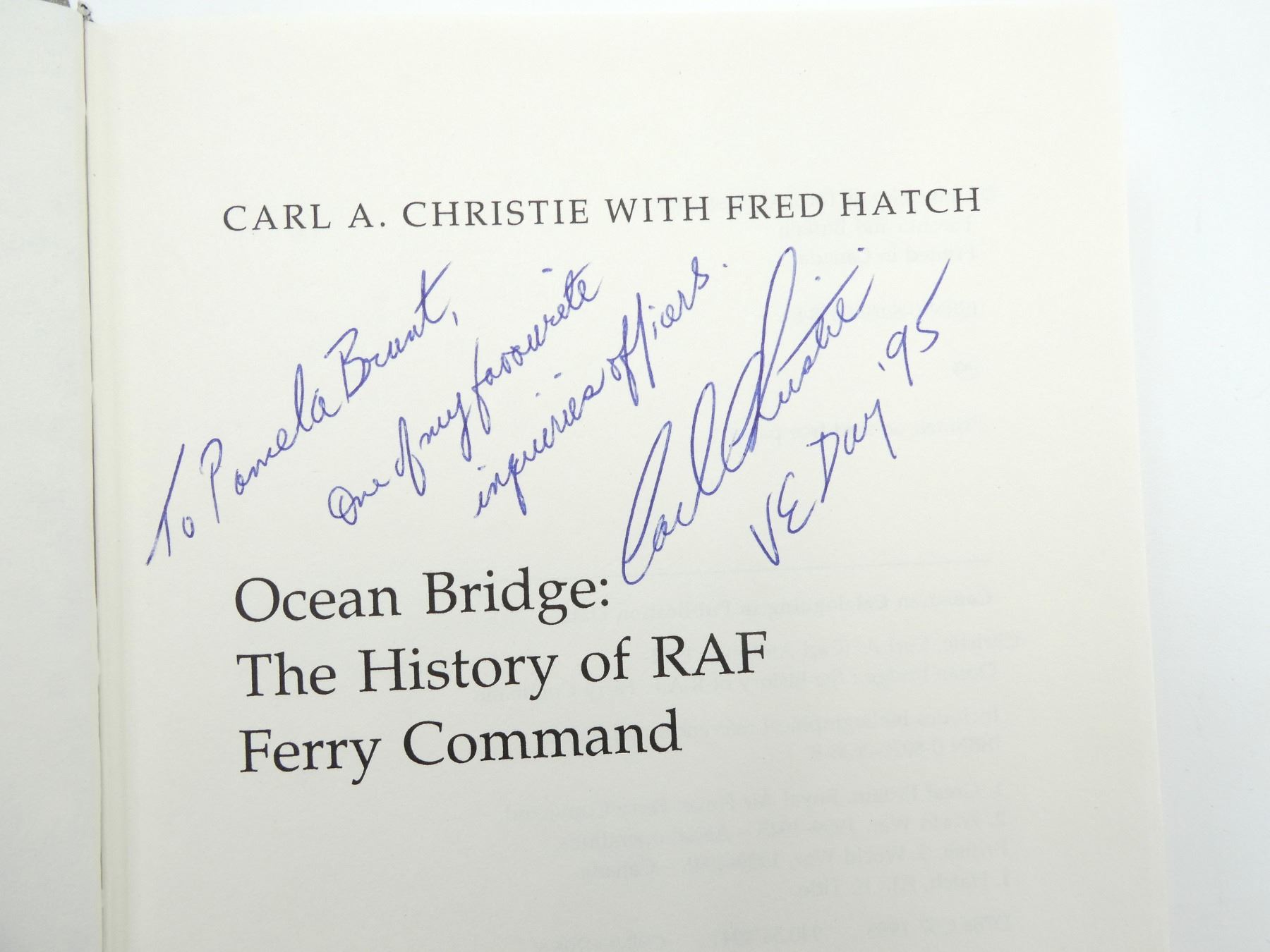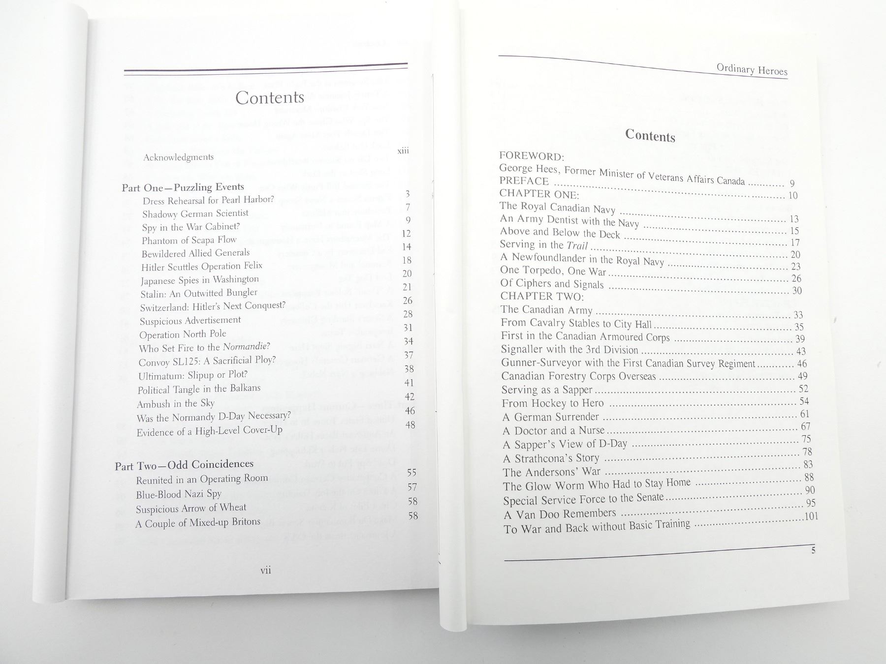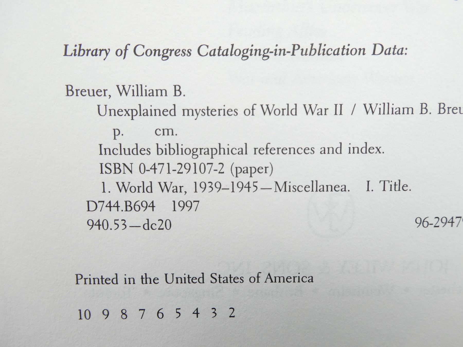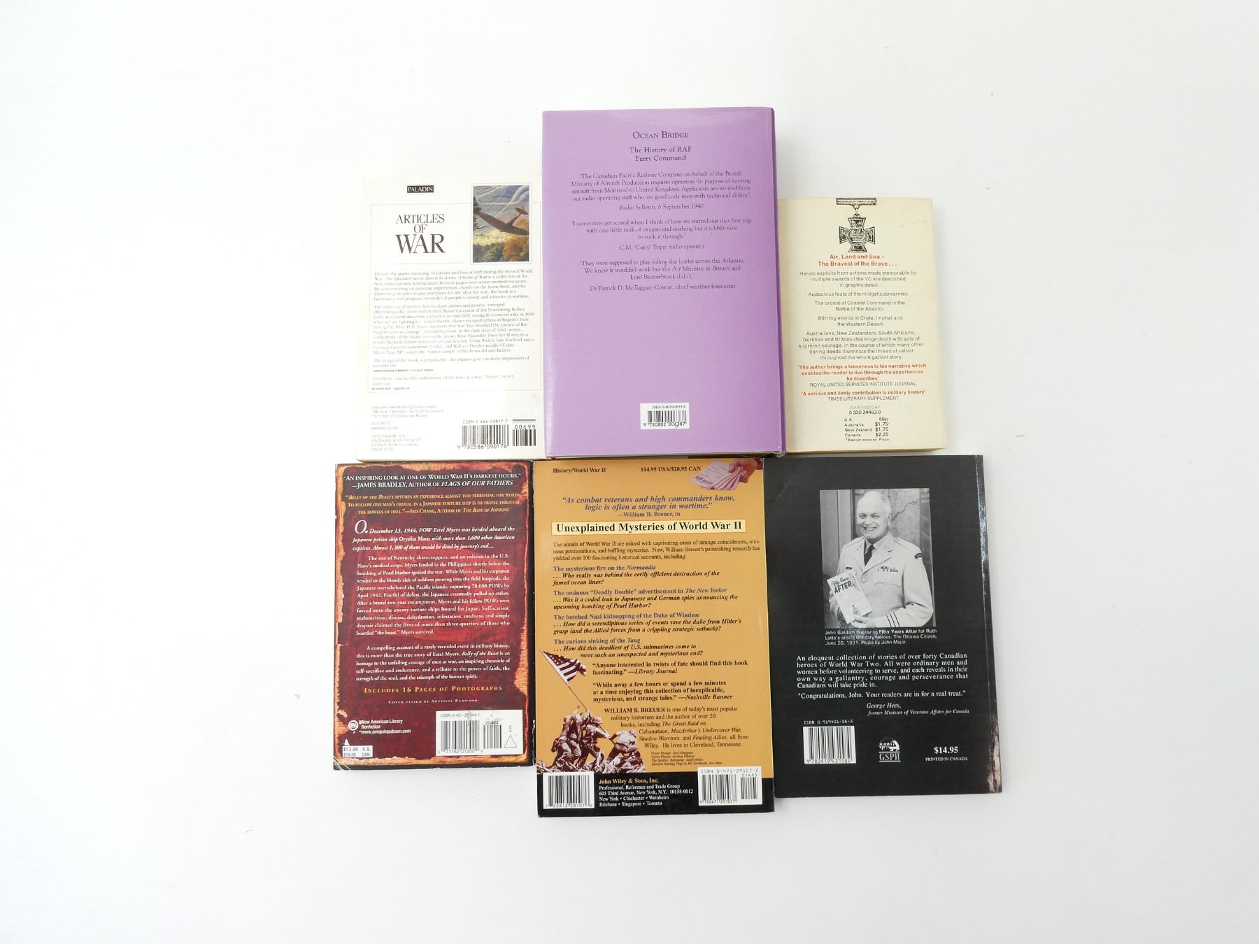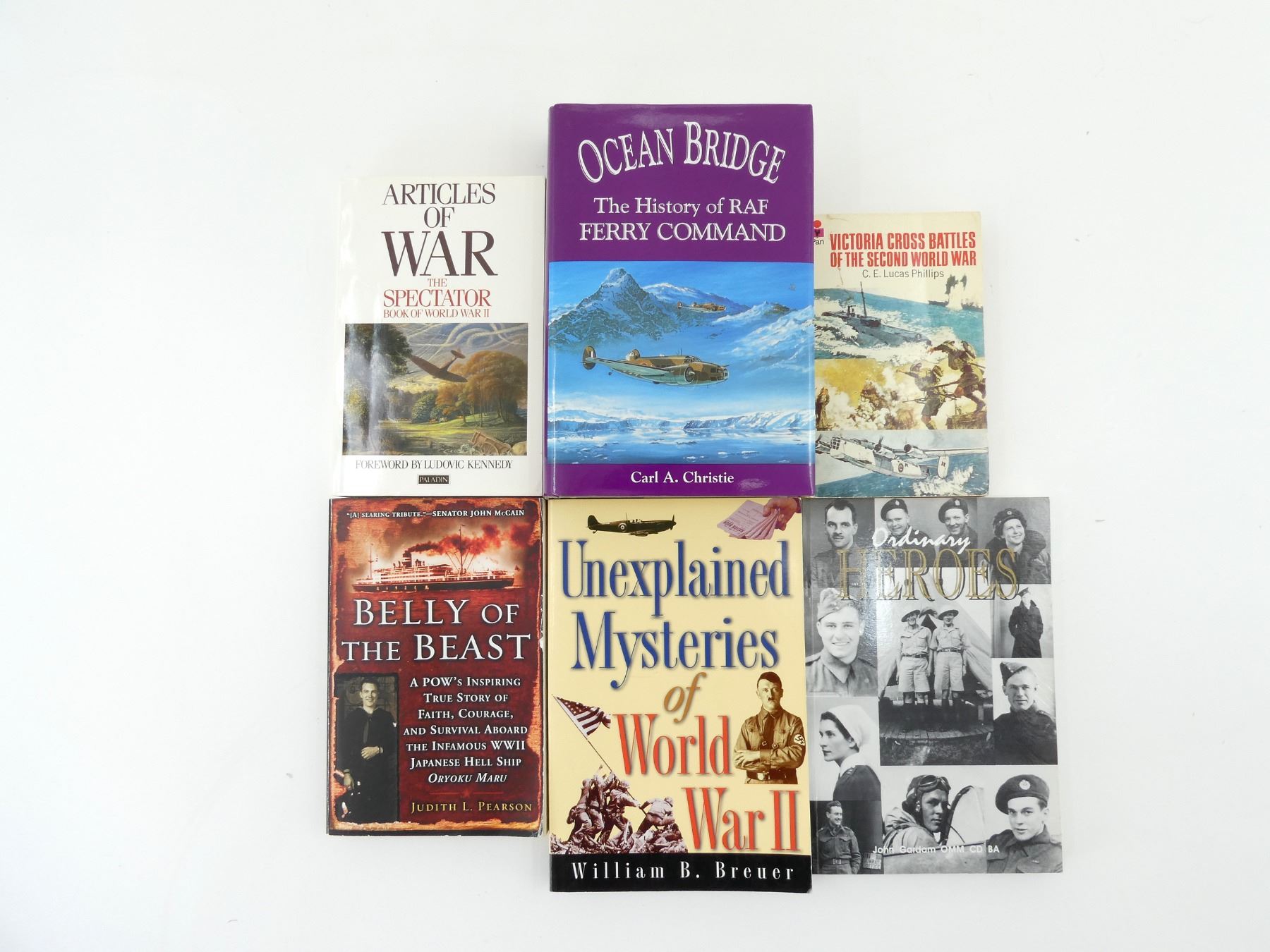 LOT INCLUDES; (1) "OCEAN BRIDGE, THE HISTORY OF RAF FERRY COMMAND" BOOK BY CARL A. CHRISTIE, HARD COVER WITH DUST COVER, ISBN: 0-8020-0638-8, (1) "UNEXPLAINED MYSTERIES OF WORLD WAR II" BOOK BY WILLIAM B. BREUER, SOFT COVER, ISBN: 0-471-29107-2, (1) "ORDINARY HEROES" BOOK BY JOHN GARDAM OMM CD BA, SOFT COVER, ISBN: 0-919431-58-5, (1) "BELLY OF THE BEAST" BOOK BY JUDITH L. PEARSON, SOFT COVER, ISBN: 0-451-20444-1, (1) "ARTICLES OF WAR, THE SPECTATOR BOOK OF WORLD WAR II" BOOK EDITED BY FIONA GLASS & PHILIP MARSDEN-SMEDLEY, SOFT COVER, ISBN: 0-586-09017-7 & (1) "VICTORIA CROSS BATTLES OF THE SECOND WORLD WAR" BOOK BY C.E. LUCAS PHILLIPS, SOFT COVER, ISBN: 0-330-24463-0. SEE PHOTOS.