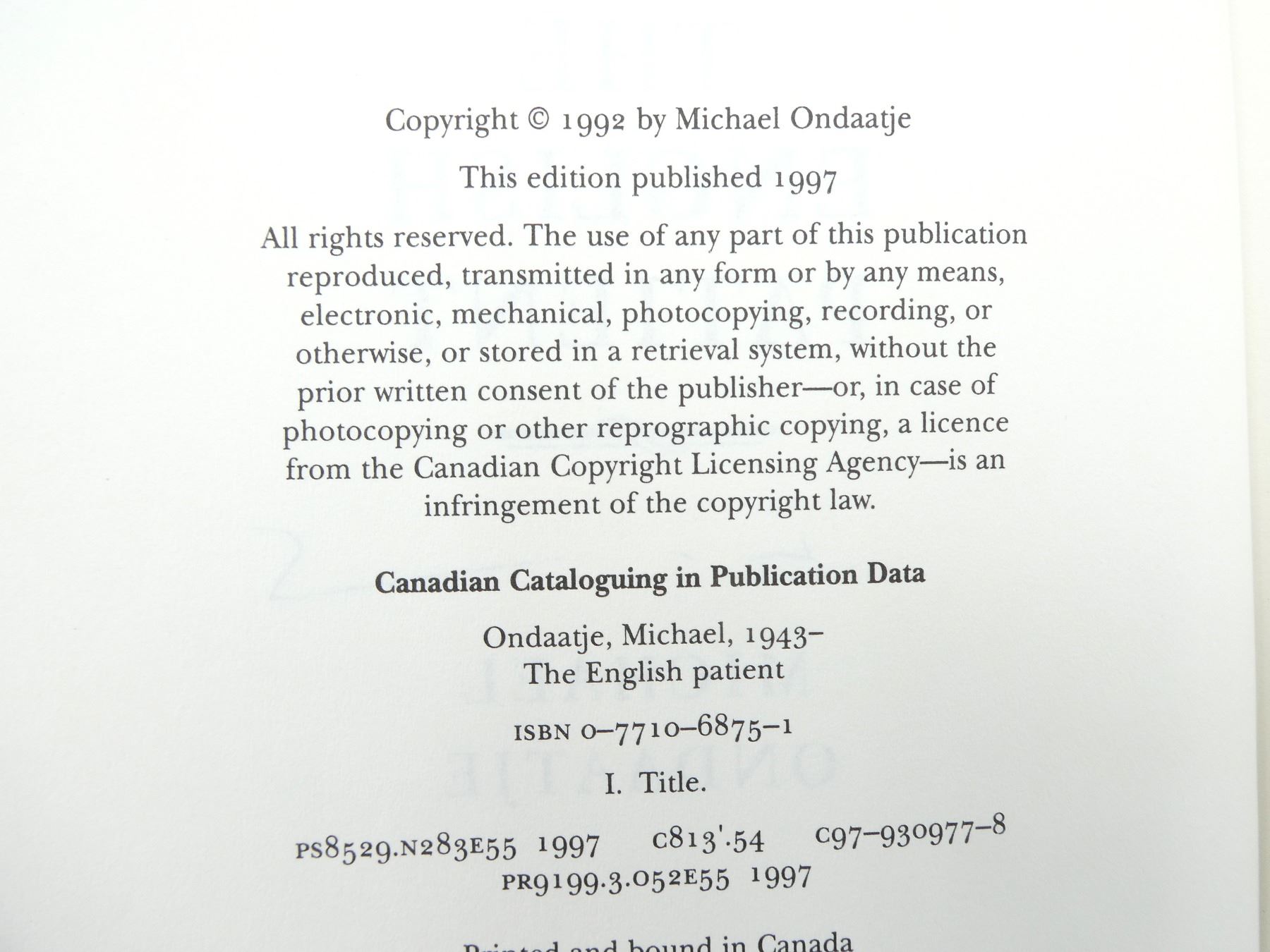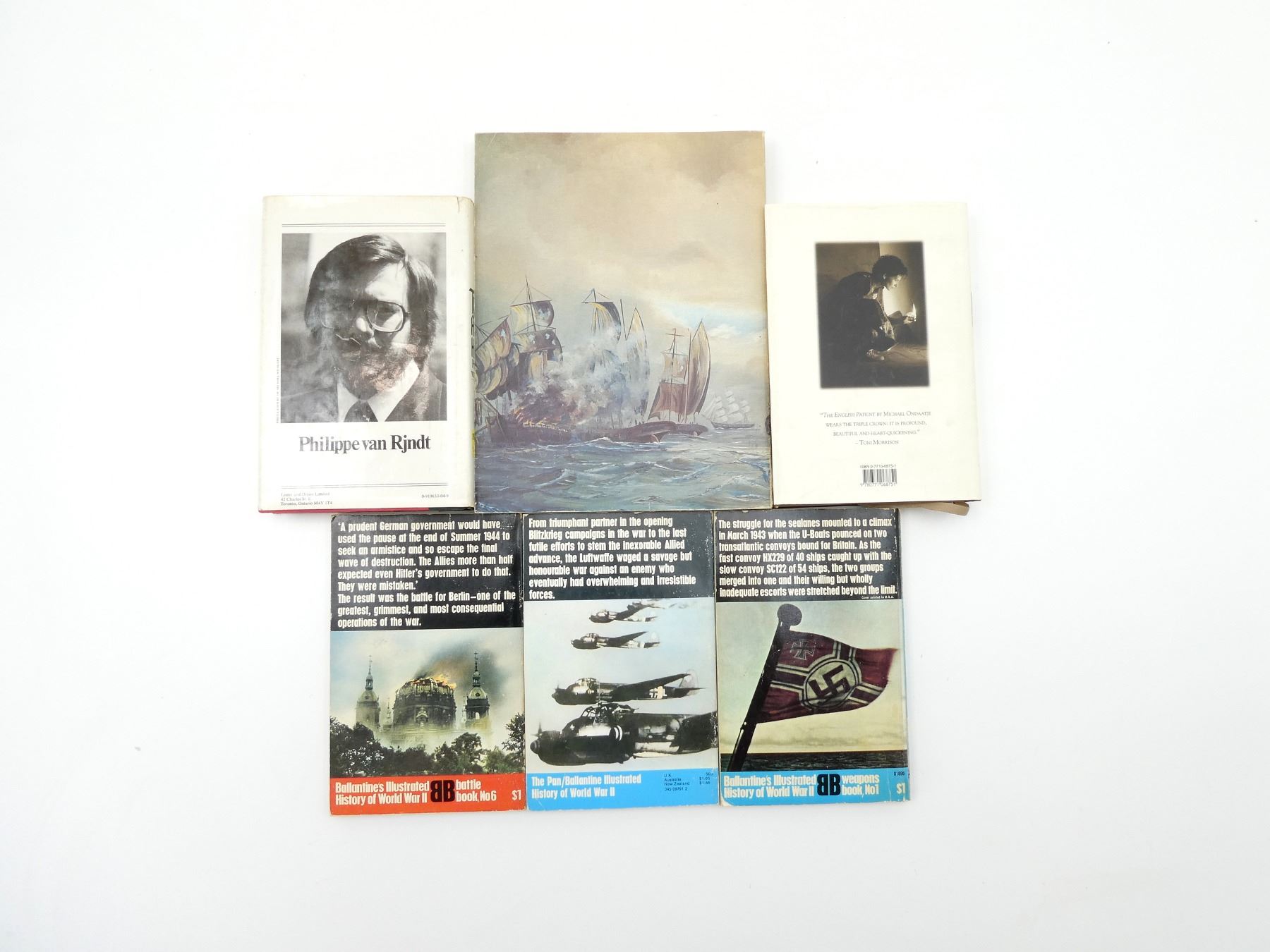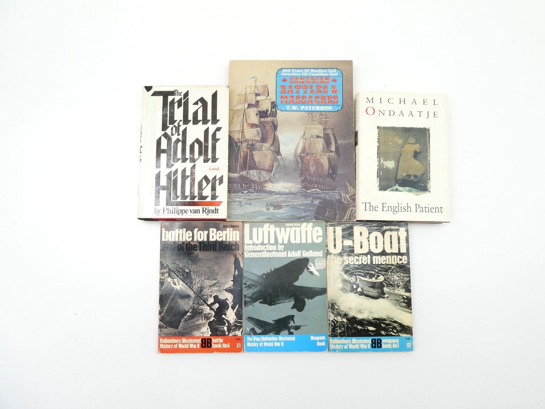 LOT INCLUDES; (1) "CANADIAN BATTLES & MASSACRES, 300 YEARS OF WARFARE AND ATROCITIES ON CANADIAN SOIL" BOOK BY T.W. PATERSON, SOFT COVER, ISBN: 0-88983-006-1, (1) "THE ENGLISH PATIENT" BOOK BY MICHAEL ONDAATJE, HARD COVER WITH DUST COVER, ISBN: 0-7710-6875-1, (1) "THE TRIAL OF ADOLF HITLER" BOOK BY PHILIPPE VAN RJNDT, HARD COVER WITH DUST COVER, ISBN: 0-919630-04-9, (1) "BATTLE FOR BERLIN, END OF THE THIRD REICH, BALLANTINE'S BATTLE BOOK NO.6" BOOK BY EARL F ZIEMKE, SOFT COVER, COPYRIGHT 1968, (1) "LUFTWAFFE, INTRODUCTION BY GENERALLEUTNANT ADOLF GALLAND, THE PAN / BALLANTINE WEAPONS BOOK" BY ALFRED PRICE, SOFT COVER, ISBN: 0-345-09791-2 & (1) U-BOAT THE SECRET MENACE, BALLANTINE'S WEAPONS BOOK NO.1" BOOK BY DAVID MASON, SOFT COVER, COPYRIGHT 1968. SEE PHOTOS.