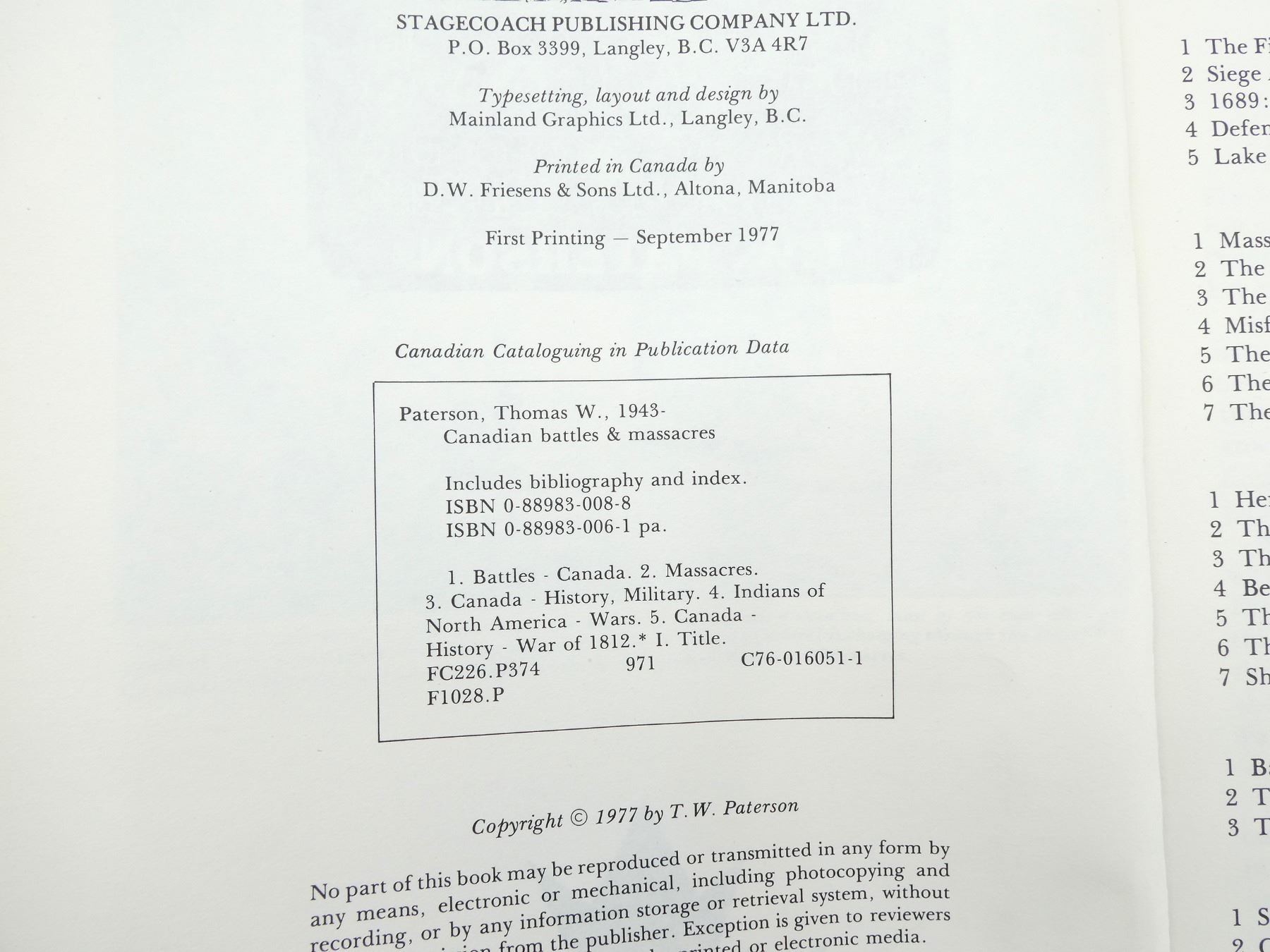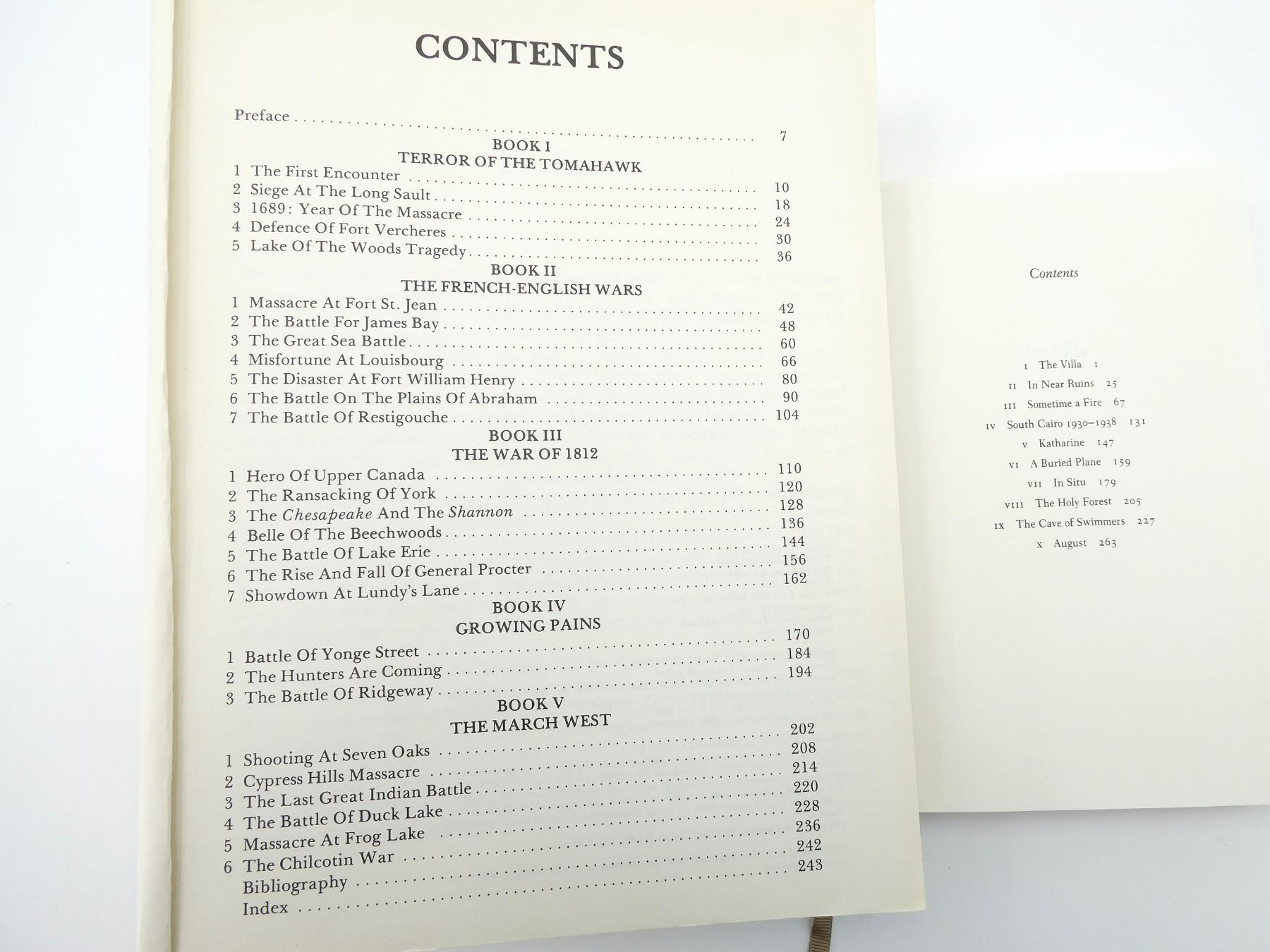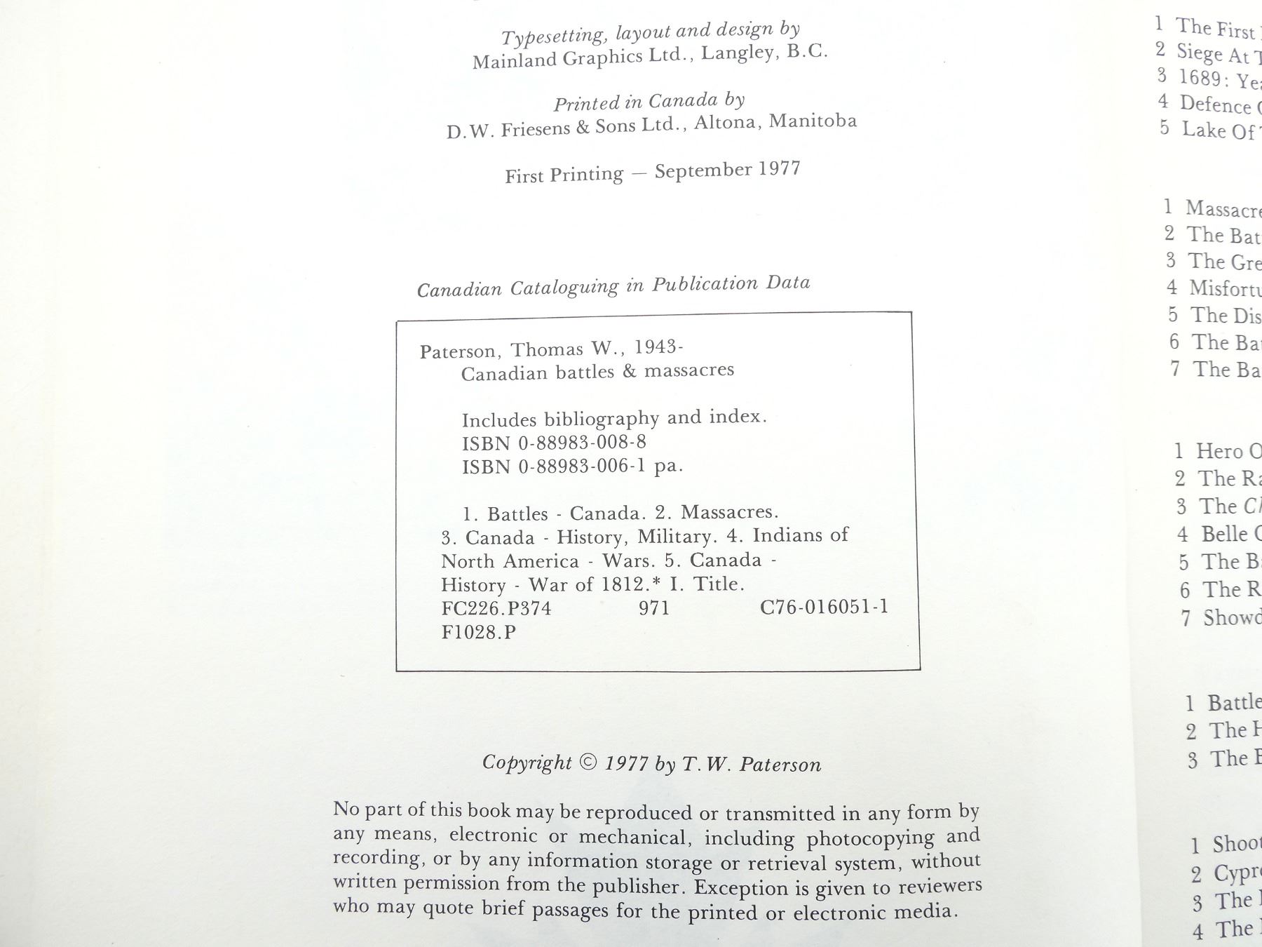 LOT INCLUDES; (1) "CANADIAN BATTLES & MASSACRES, 300 YEARS OF WARFARE AND ATROCITIES ON CANADIAN SOIL" BOOK BY T.W. PATERSON, SOFT COVER, ISBN: 0-88983-006-1, (1) "THE ENGLISH PATIENT" BOOK BY MICHAEL ONDAATJE, HARD COVER WITH DUST COVER, ISBN: 0-7710-6875-1, (1) "THE TRIAL OF ADOLF HITLER" BOOK BY PHILIPPE VAN RJNDT, HARD COVER WITH DUST COVER, ISBN: 0-919630-04-9, (1) "BATTLE FOR BERLIN, END OF THE THIRD REICH, BALLANTINE'S BATTLE BOOK NO.6" BOOK BY EARL F ZIEMKE, SOFT COVER, COPYRIGHT 1968, (1) "LUFTWAFFE, INTRODUCTION BY GENERALLEUTNANT ADOLF GALLAND, THE PAN / BALLANTINE WEAPONS BOOK" BY ALFRED PRICE, SOFT COVER, ISBN: 0-345-09791-2 & (1) U-BOAT THE SECRET MENACE, BALLANTINE'S WEAPONS BOOK NO.1" BOOK BY DAVID MASON, SOFT COVER, COPYRIGHT 1968. SEE PHOTOS.