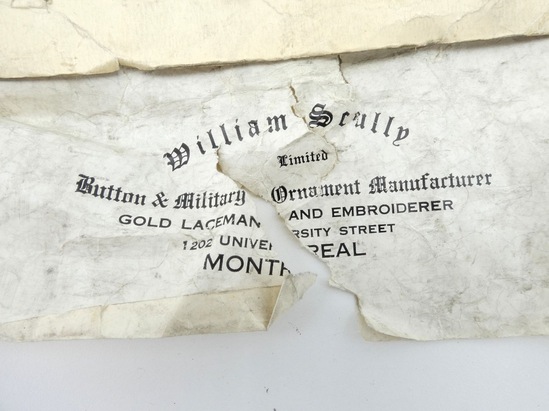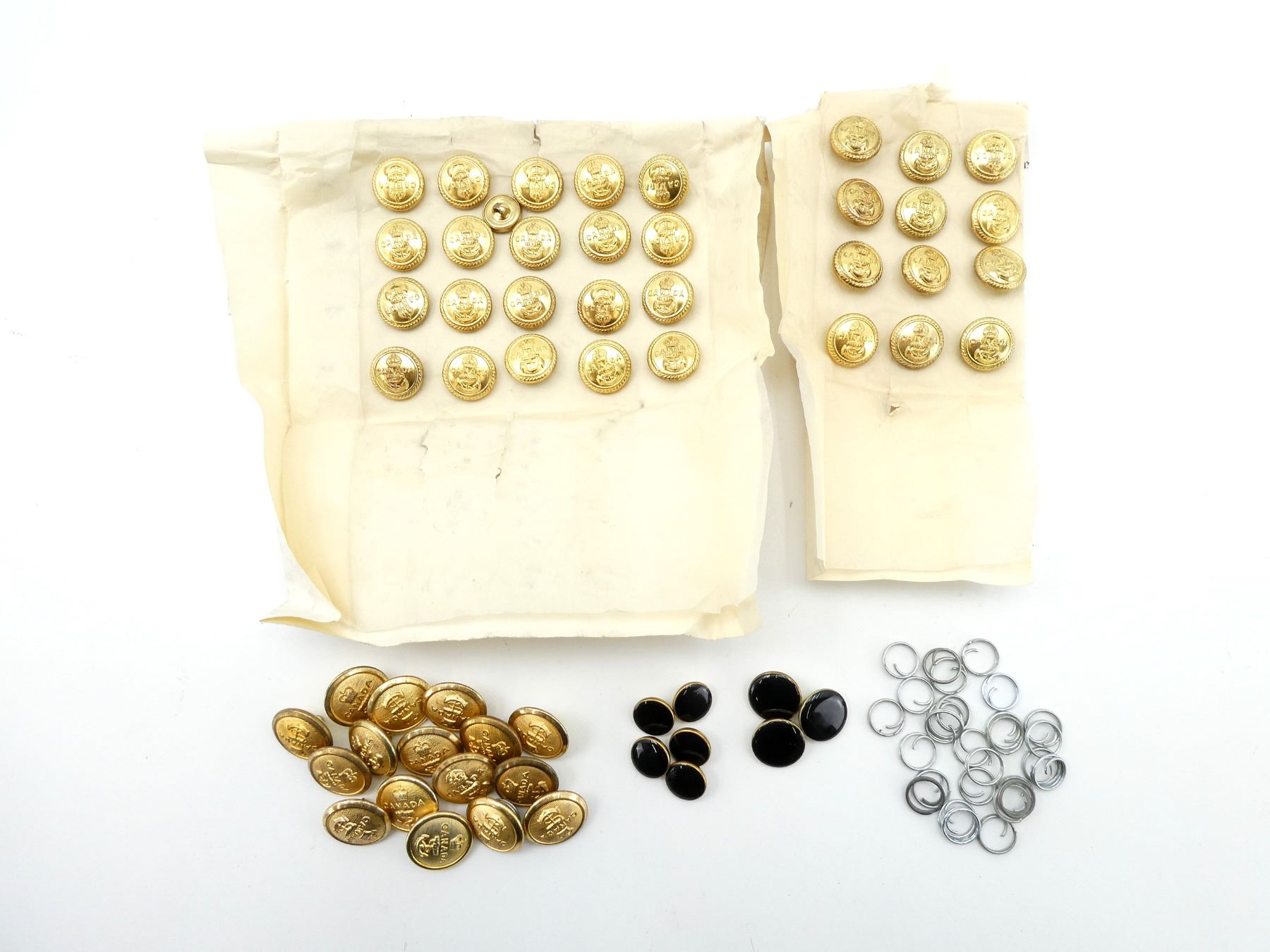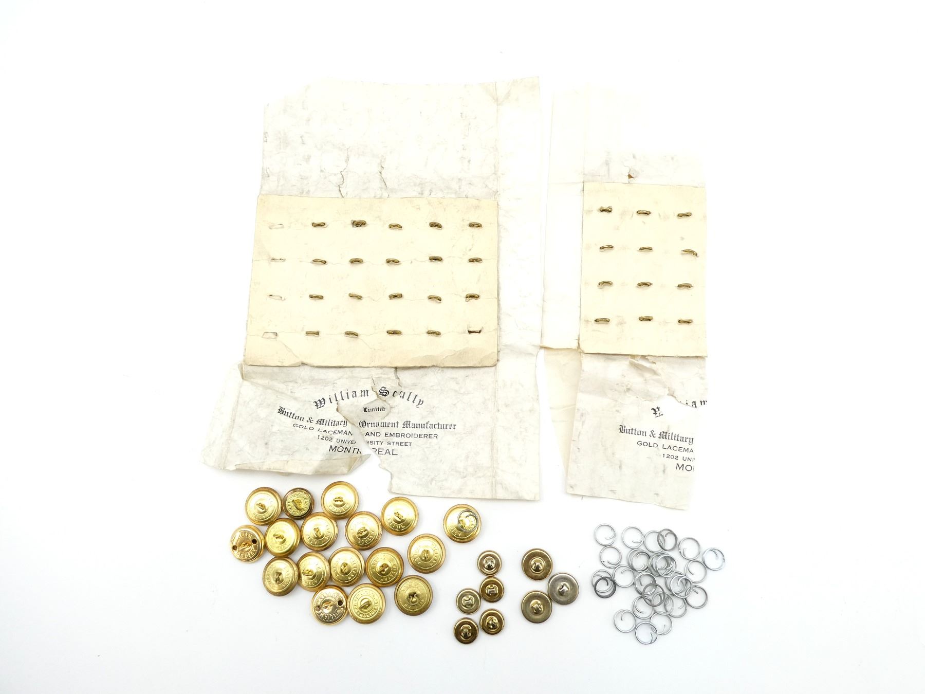 LOT INCLUDES; APPROX. (20) BRASS KING'S CROWN CANADA BUTTONS IN ORIGINAL WILLIAM SCULLY PAPER, PAPER MARKED: "WILLIAM SCULLY LIMITED, BUTTON & MILITARY ORNAMENT MANUFACTURER, GOLD LACEMAN AND EMBROIDERER, 1202 UNIVERSITY STREET, MONTREAL", NEW OLD STOCK, CIRCA 1938-1953, APPROX. (12) BRASS KING'S CROWN CANADA BUTTONS IN ORIGINAL WILLIAM SCULLY PAPER, VARIOUS MARKINGS ON PAPER, NEW OLD STOCK, CIRCA 1938-1953 & APPROX. (53) BUTTONS / SPLIT RINGS, QUEEN'S CROWNS / 1 KING'S CROWN BRASS BUTTONS. SEE PHOTOS.