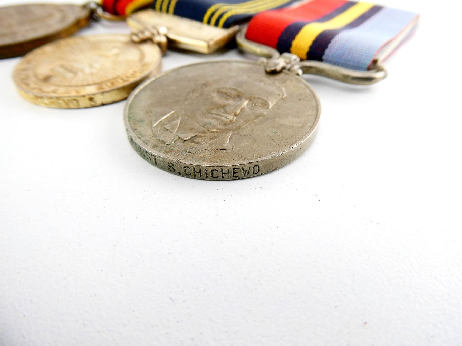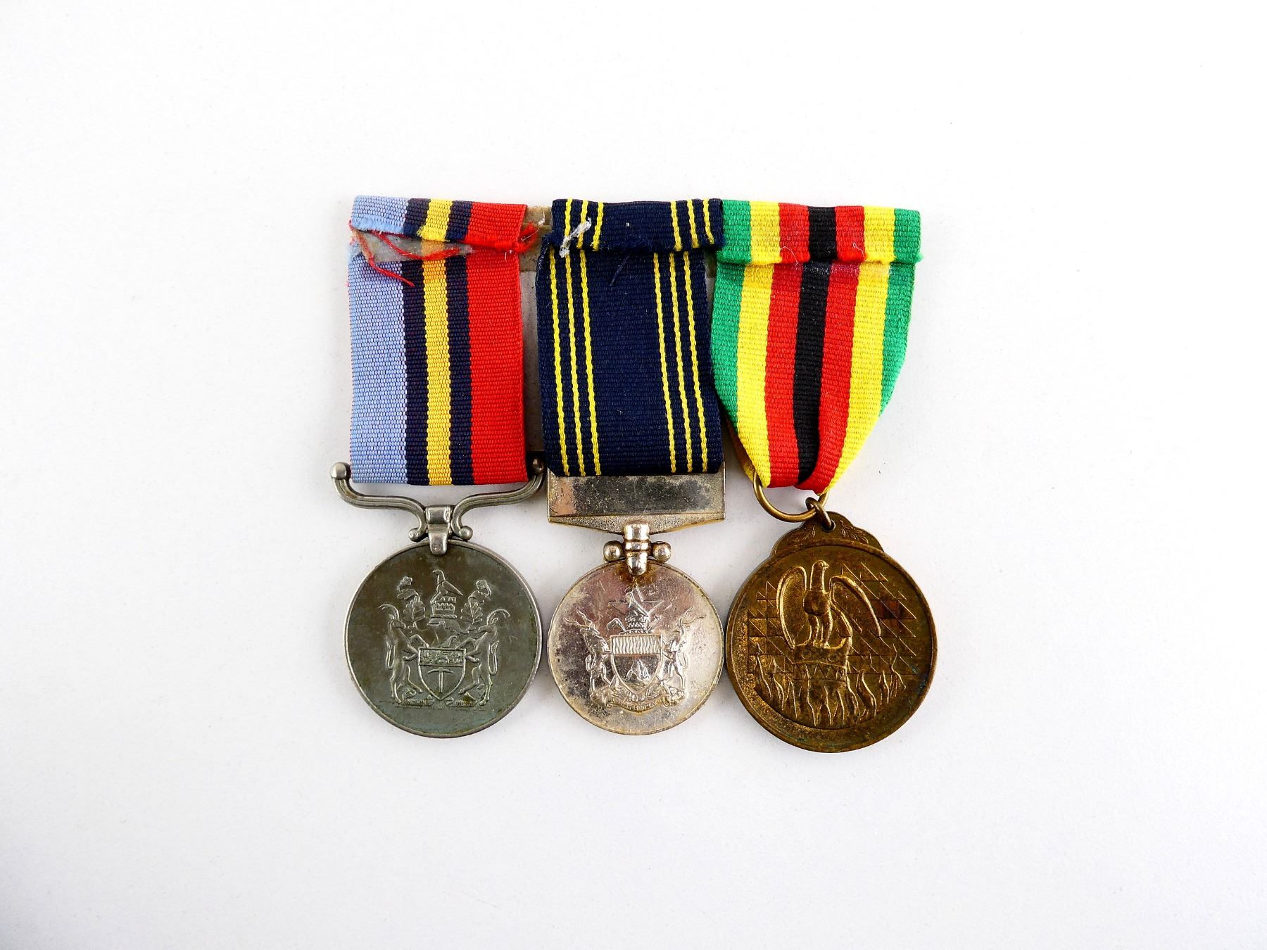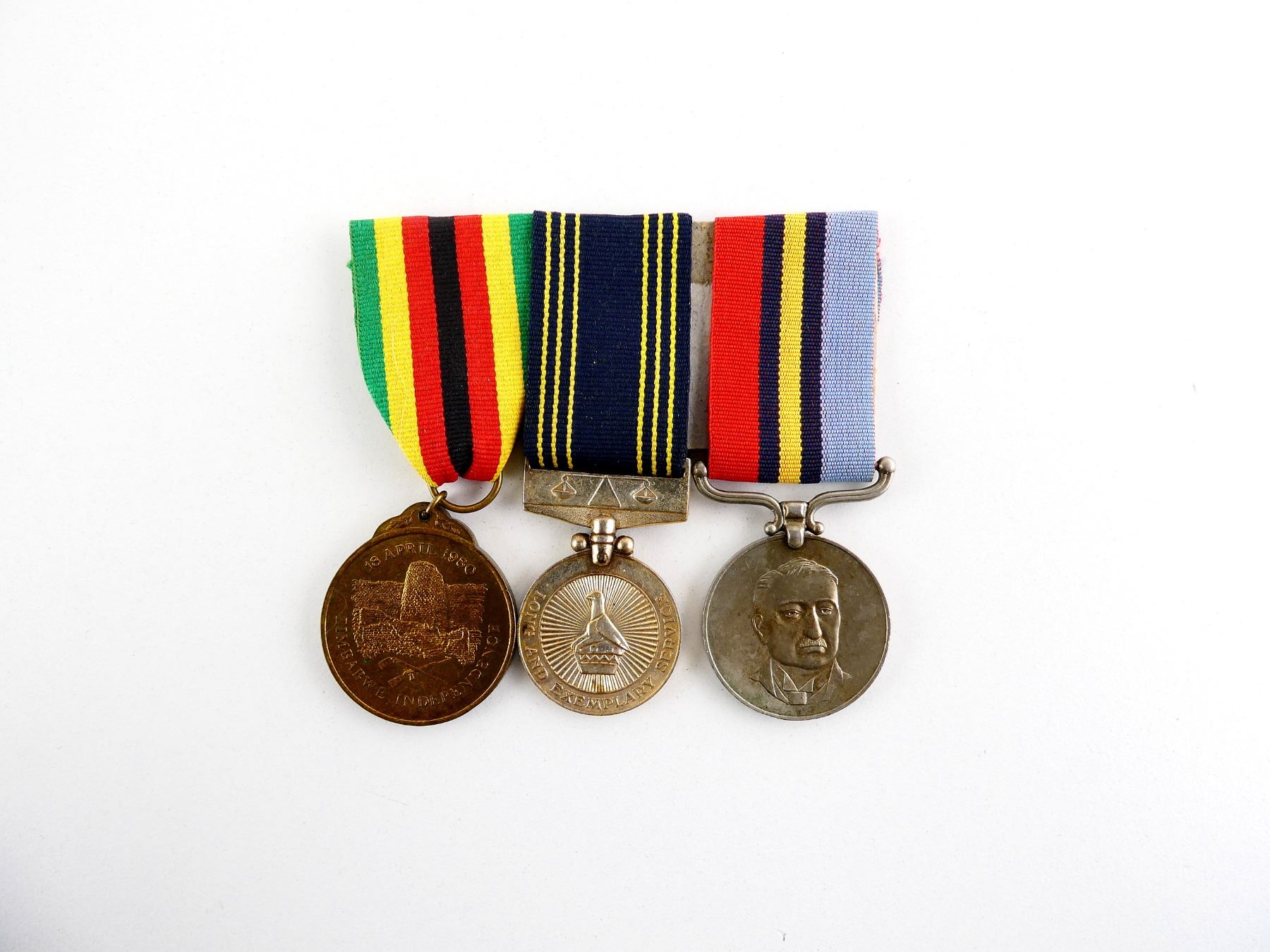 ALL AFFIXED TO BACKING, WITH PAPERWORK, LOT INCLUDES; (1) ZIMBABWE INDEPENDENCE MEDAL WITH RIBBON, RIM MARKED: "50184", (1) ZIMBABWE POLICE LONG AND EXEMPLARY SERVICE MEDAL WITH RIBBON, RIM MARKED: "25323 CST CHICHEVO S" & (1) RHODESIAN GENERAL SERVICE MEDAL WITH RIBBON, RIM MARKED: "25323 CONST S. CHICHEWO". SEE PHOTOS.