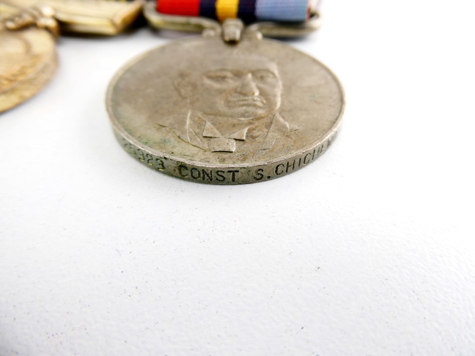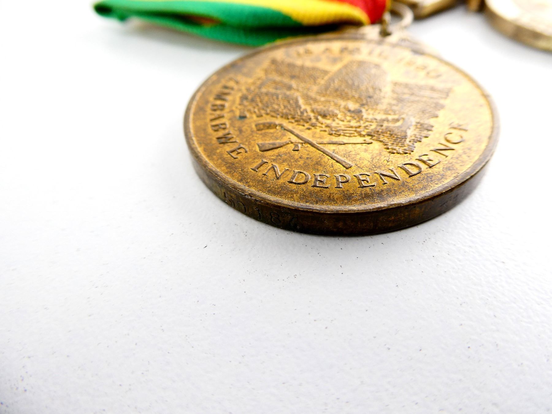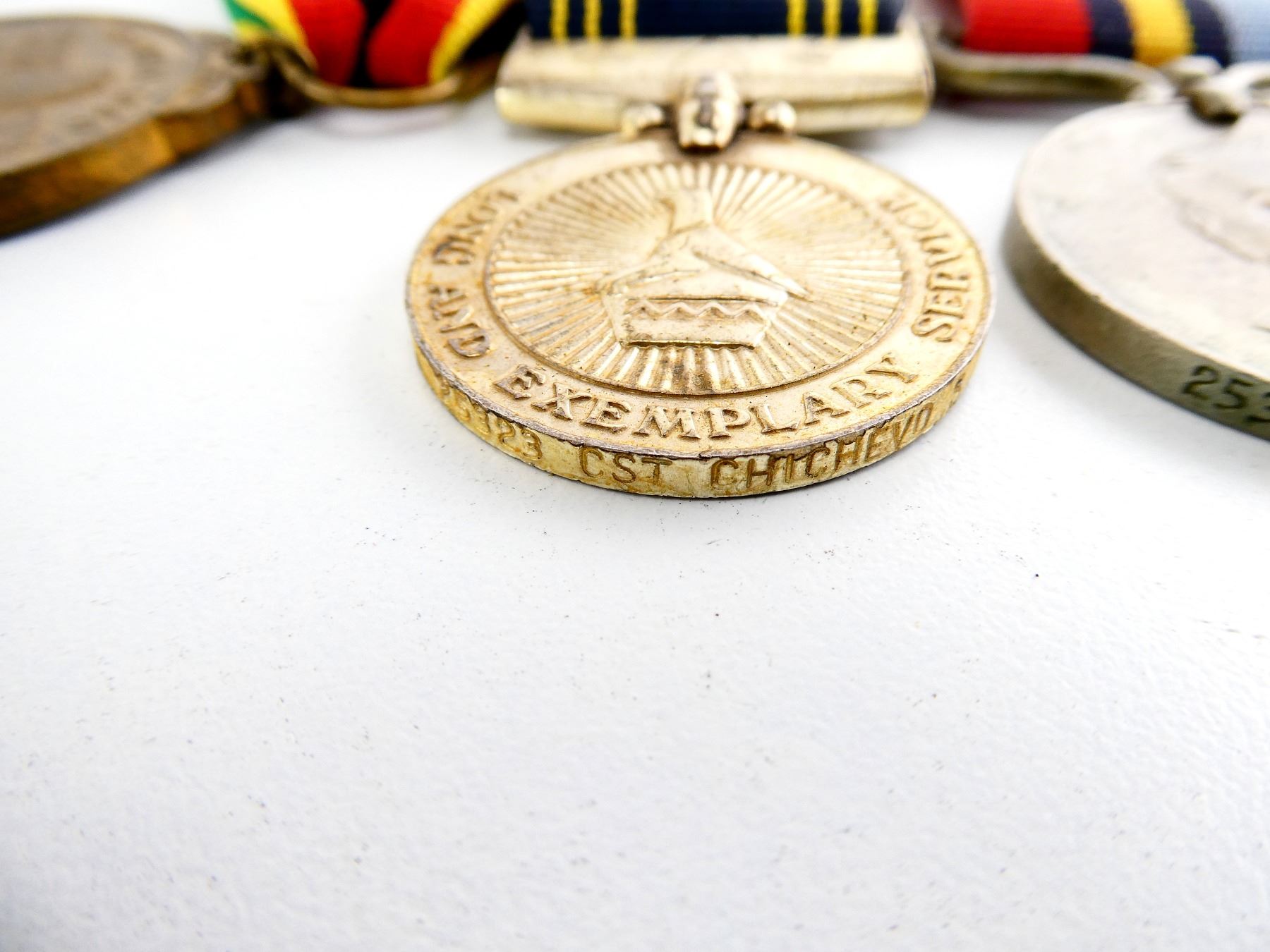 ALL AFFIXED TO BACKING, WITH PAPERWORK, LOT INCLUDES; (1) ZIMBABWE INDEPENDENCE MEDAL WITH RIBBON, RIM MARKED: "50184", (1) ZIMBABWE POLICE LONG AND EXEMPLARY SERVICE MEDAL WITH RIBBON, RIM MARKED: "25323 CST CHICHEVO S" & (1) RHODESIAN GENERAL SERVICE MEDAL WITH RIBBON, RIM MARKED: "25323 CONST S. CHICHEWO". SEE PHOTOS.