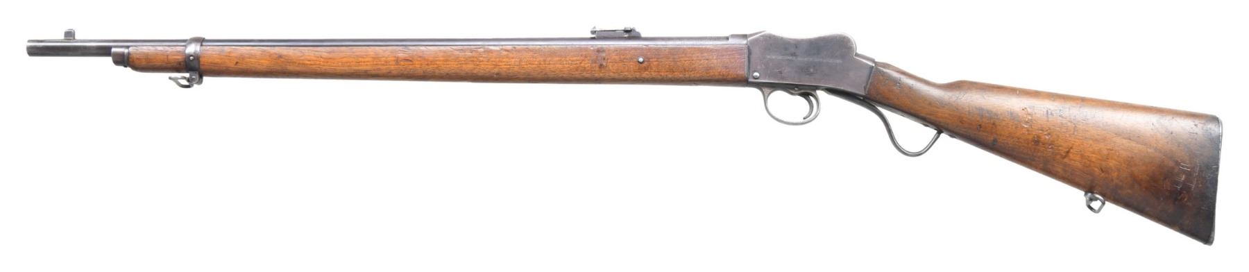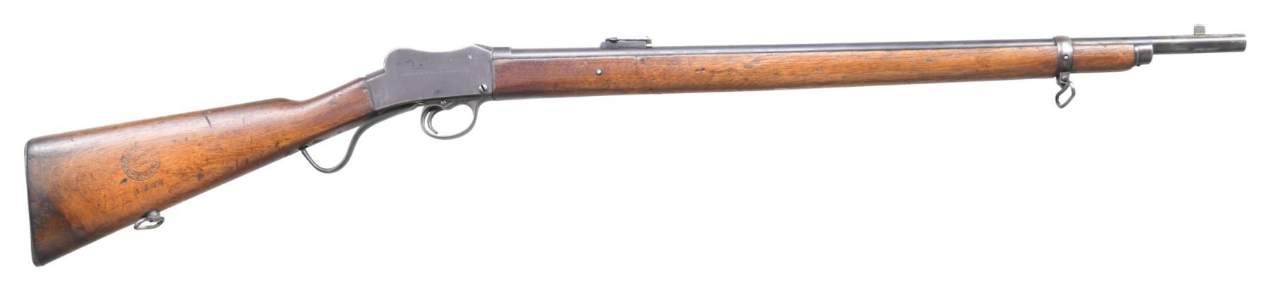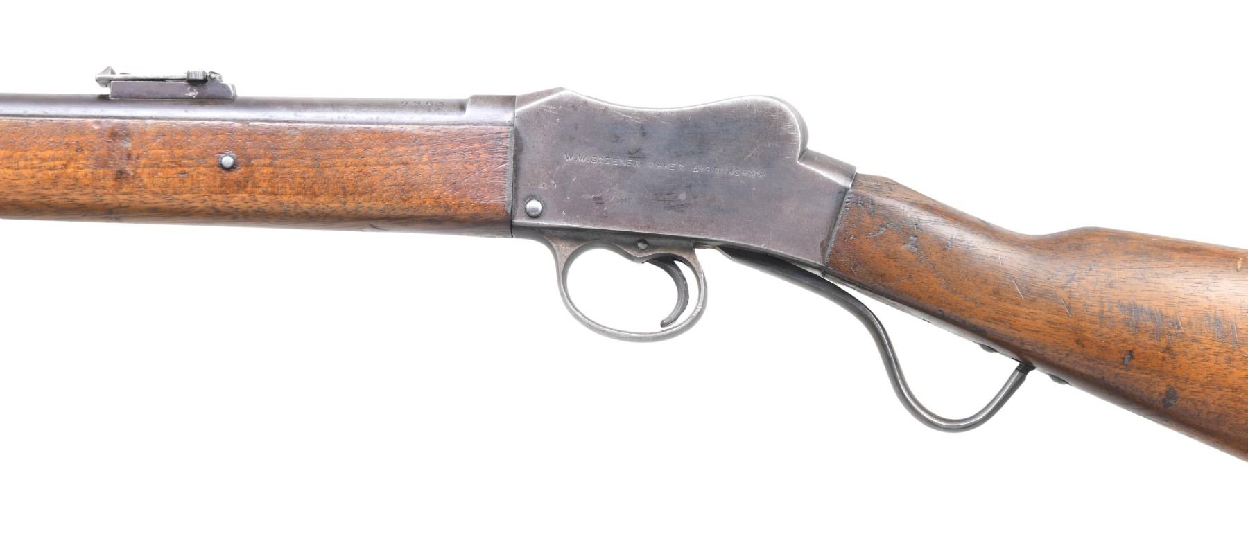 RIFLE. Cal. 310 Cadet. S# 9963. Bbl. 25". Blade front sight. Ladder rear sight graduated to 600yds. Bbl. top & left side of receiver have WW Greener markings. Right side of receiver marked "COMMONWEALTH OF AUSTRALIA". Top of receiver has Kangaroo marking. Blued finish. Walnut stock set with bottom mounted sling swivels. Right side of butt has South Australian cartouche & a "1399" number. CONDITION: stock shows a large chip missing & 2" crack both behind action. Stock set otherwise shows scattered dings, scratches & handling marks. Metal is turning gray with strong traces of original blue, scattered edge wear & light oxidation. Action functions properly when hand cycled. Bright very good plus bore. (25-2500/MJC). CURIO. $400-600.