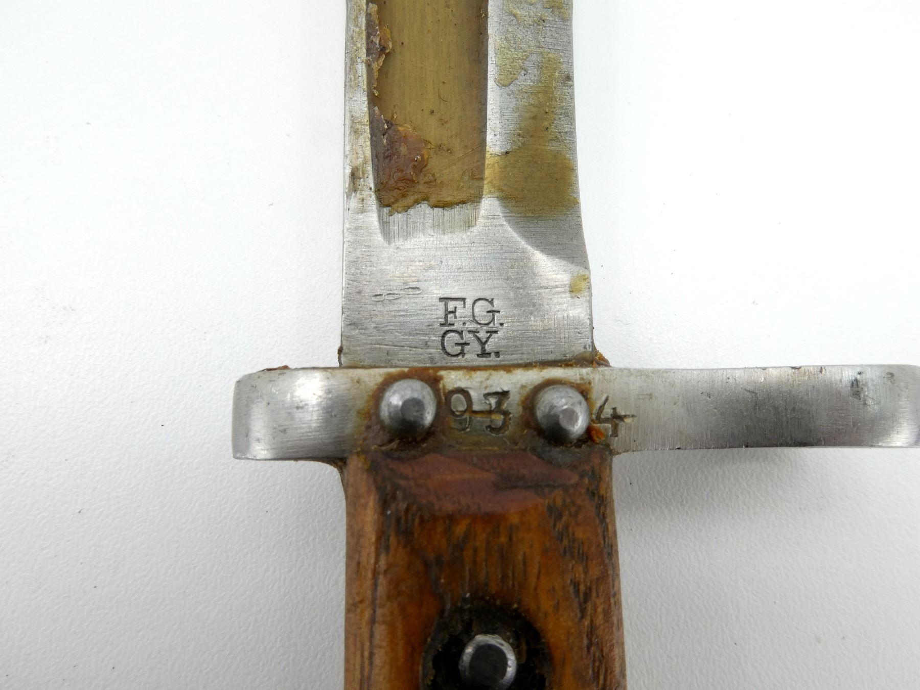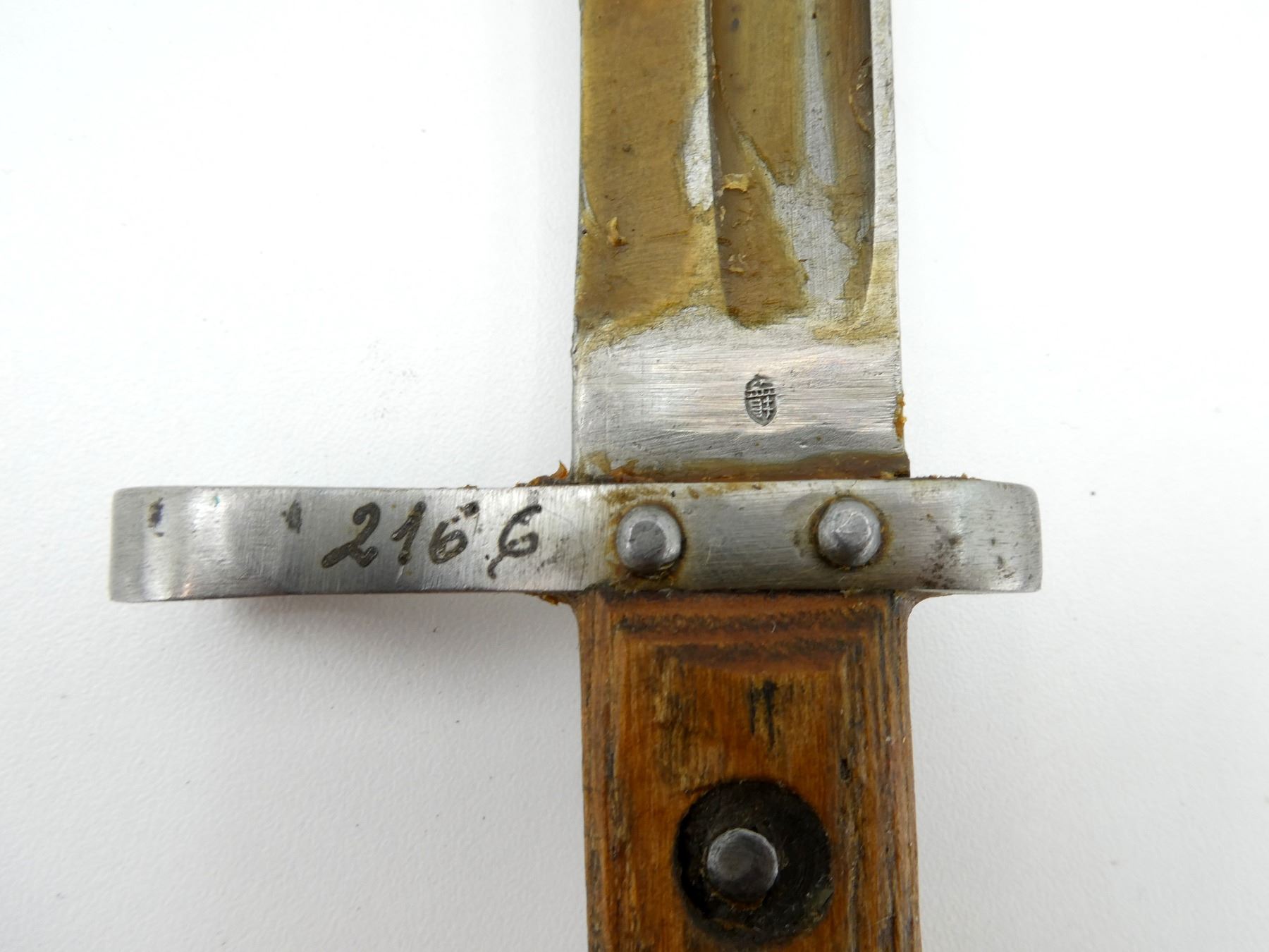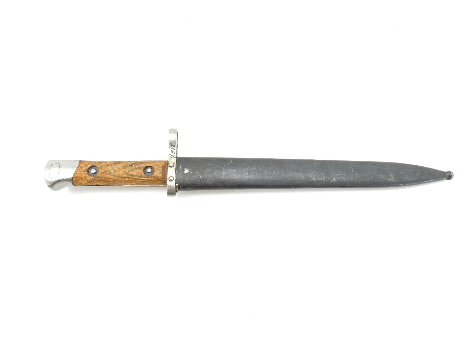 (1) FITS 8MM M1895 MANNLICHER RIFLES, RICASSO MARKED: "F.G., GY.", OTHER-SIDE MARKED WITH CREST PROOF MARK, CROSS-PIECE MARKED: "934 (CROSSED OUT), OTHER-SIDE MARKED: "2166", 2-PIECE WOODEN GRIP, METAL POMMEL, NO VISIBLE MARKINGS, STEEL SCABBARD, PROOF MARK ON STUD, BLADE APPROX. 9.5" & OVERALL LENGTH APPROX. 13 7/8". SEE PHOTOS.