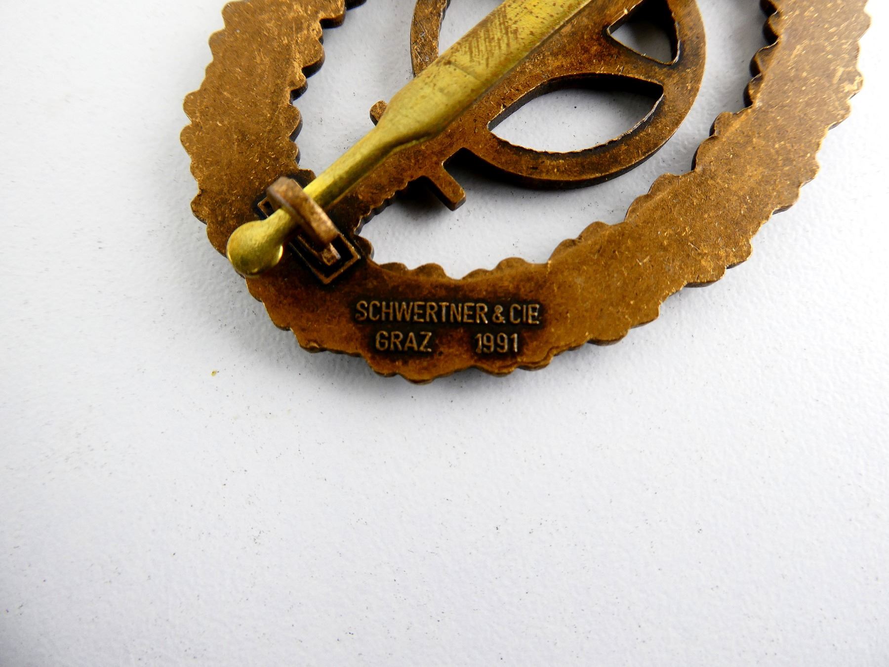 (1) BRASS BADGE WITH AUSTRIAN EAGLE WITH FLAG, FRONT MARKED: "KRAFTFAHRER", PIN BACKING INTACT, BACK MARKED: "SCHWERTNER & CIE, GRAZ 1991". SEE PHOTOS.