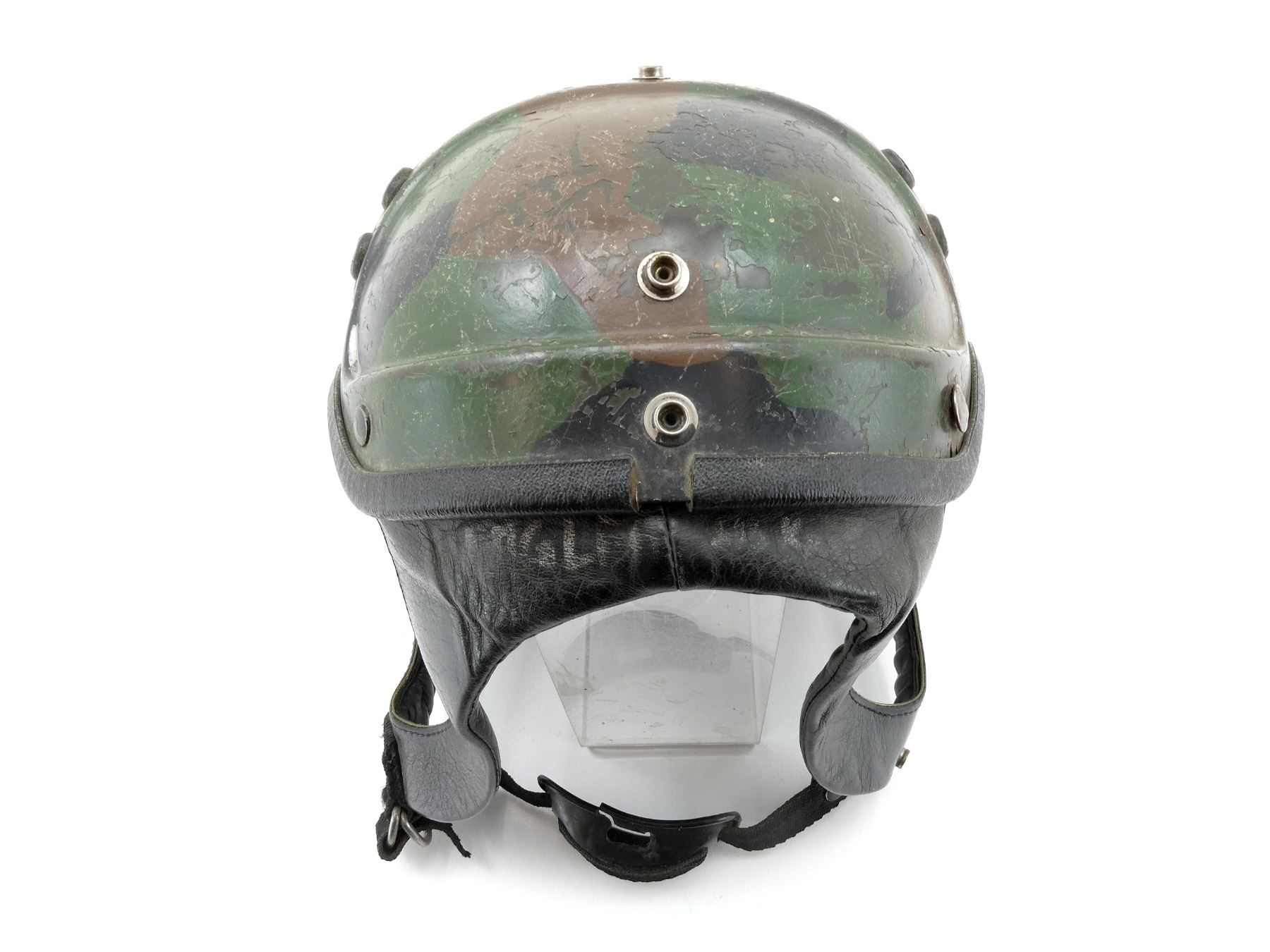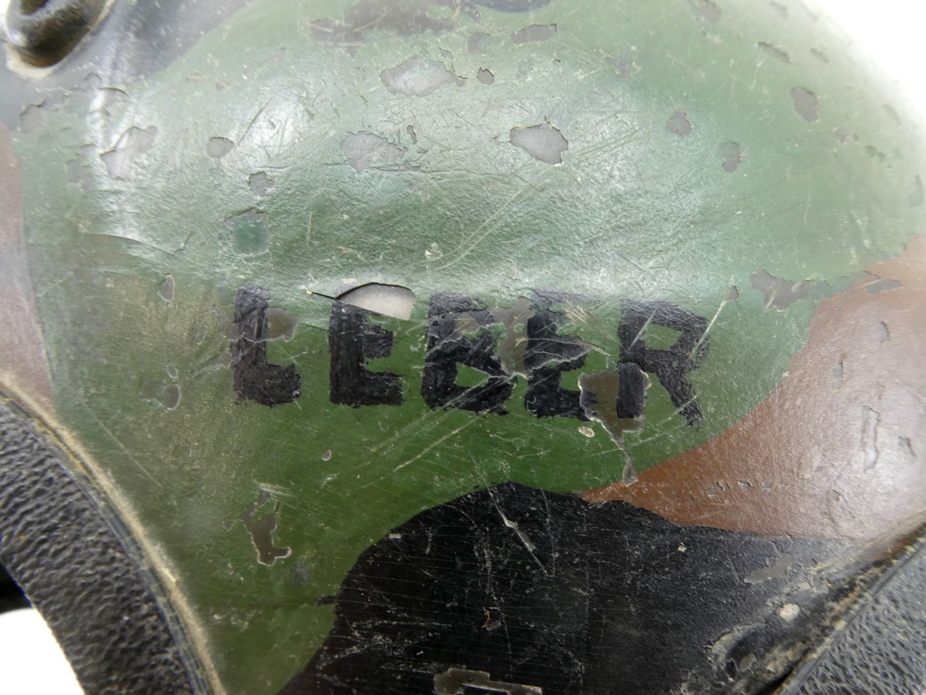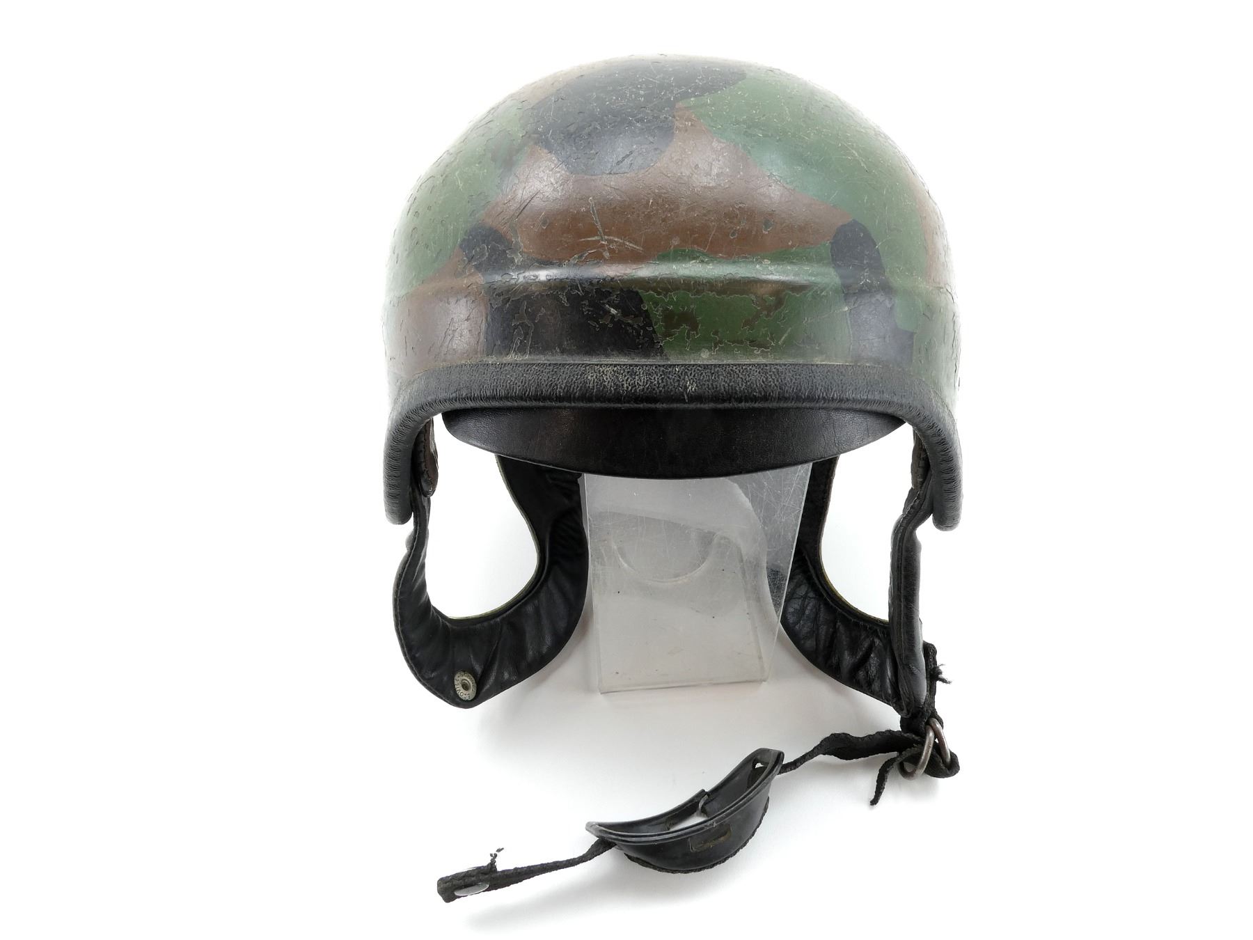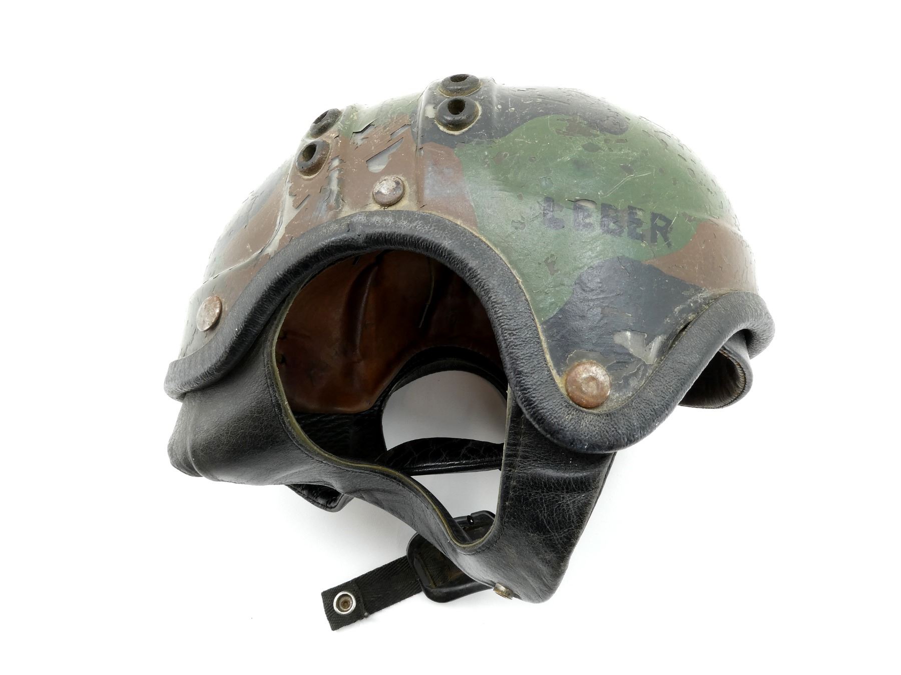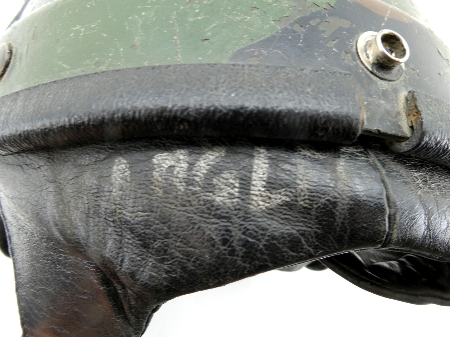 (1) CAMO PAINTED POLYMER / FIBERGLASS CONSTRUCTED HELMET, LEATHER BRIM, LEATHER EAR MUFFS / FLAPS, LEATHER REMOVEABLE LINER, VARIOUS FAINT HAND-WRITTEN MARKINGS, NYLON CHIN STRAP WITH PLASTIC CHIN CUP, SHOWS AGE / WEAR. SEE PHOTOS.