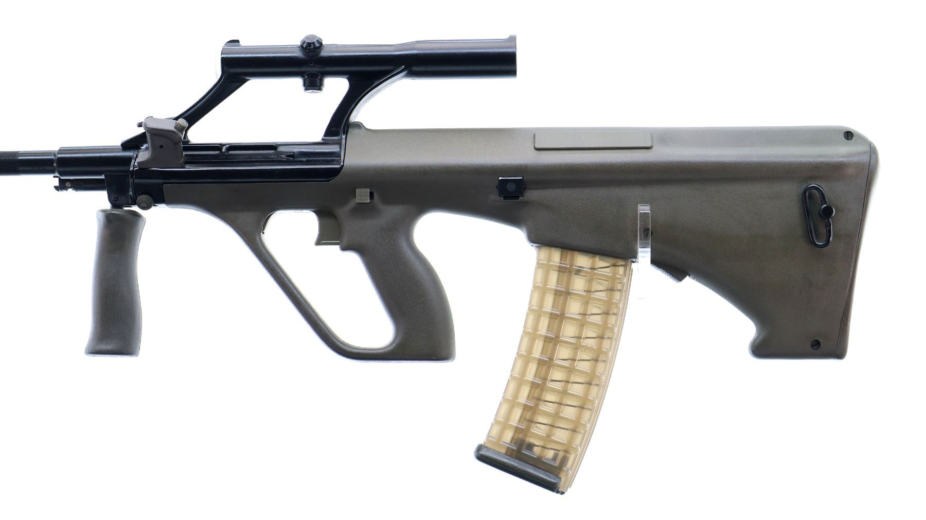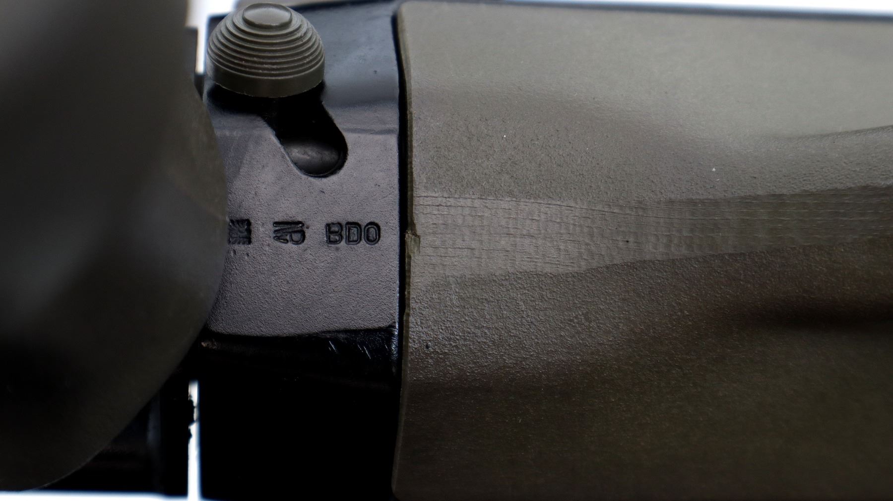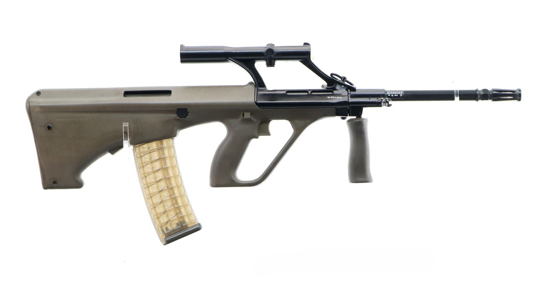 Main Description: Canadian 12-4 Prohibited, PAL with 12-4 Class Required. If you don’t have this class of license and would like this item deactivated, it can be done for an additional fee of $300.00. Barrel matches. No sights, black painted metal finish, grooved barrel threaded at muzzle with attached flashider, integral scope with clear optics and donut ring reticle, left side cocking handle. Two piece olive synthetic stocks, folding front grip, large trigger guard, crossbolt safety, hooked butt, smooth butt plate, sling swivels.