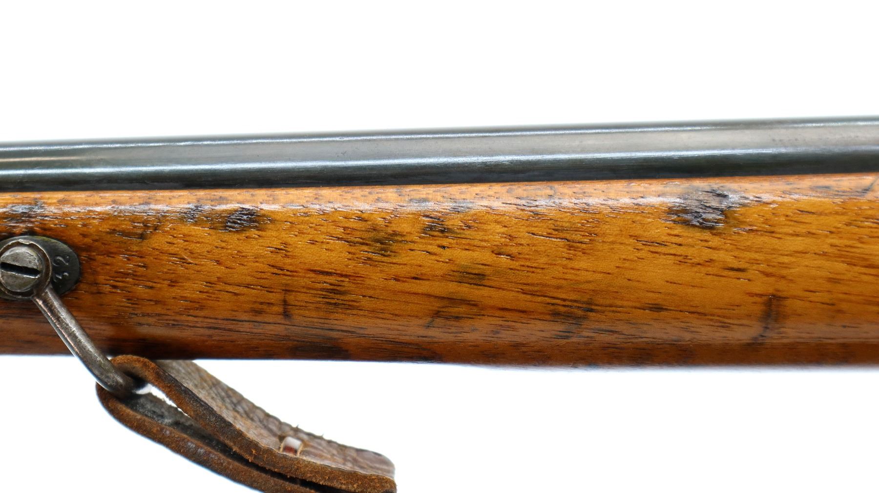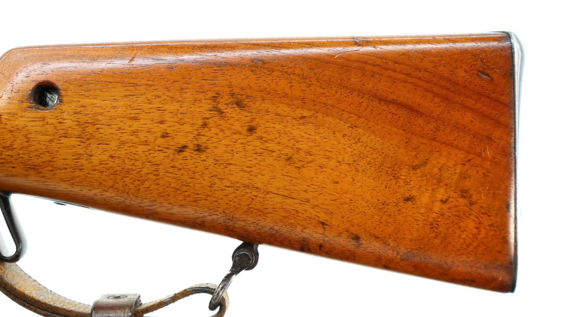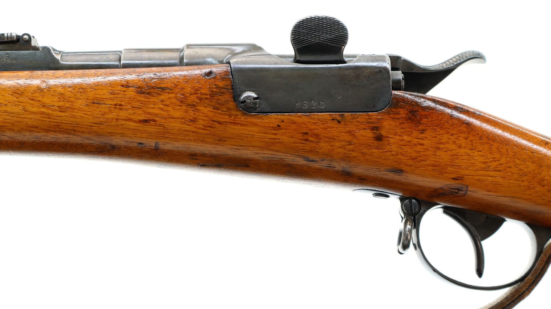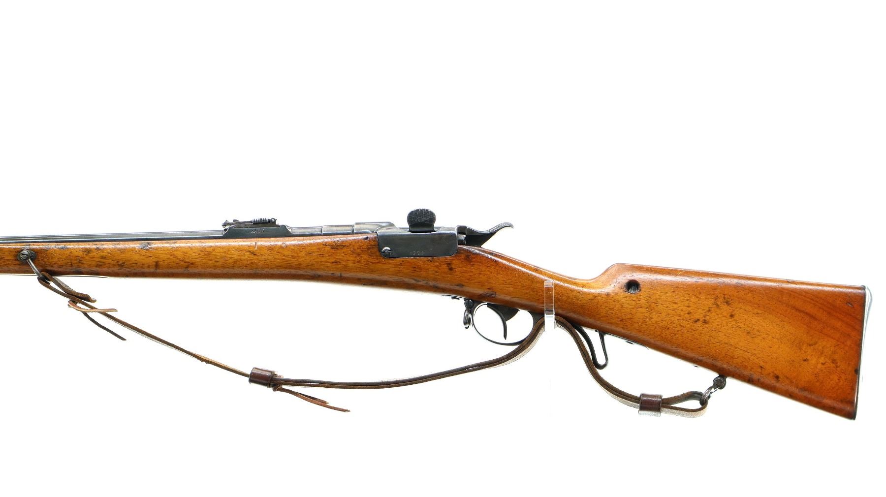 Main Description: Visible numbers match. Blade front sight with ramp, u notched ladder rear sight, spring is broken, blued finish, tapered round barrel, checkered opening lever on breech block, smooth back action lock with checkered spur hammer, hammer is inside the lock and functions. One piece wood stock, straight grip, hole through comb, smooth steel butt plate, finger rest trigger guard, sling swivels with brown leather sling, nose cap and cleaning rod are from a Swedish Mauser
