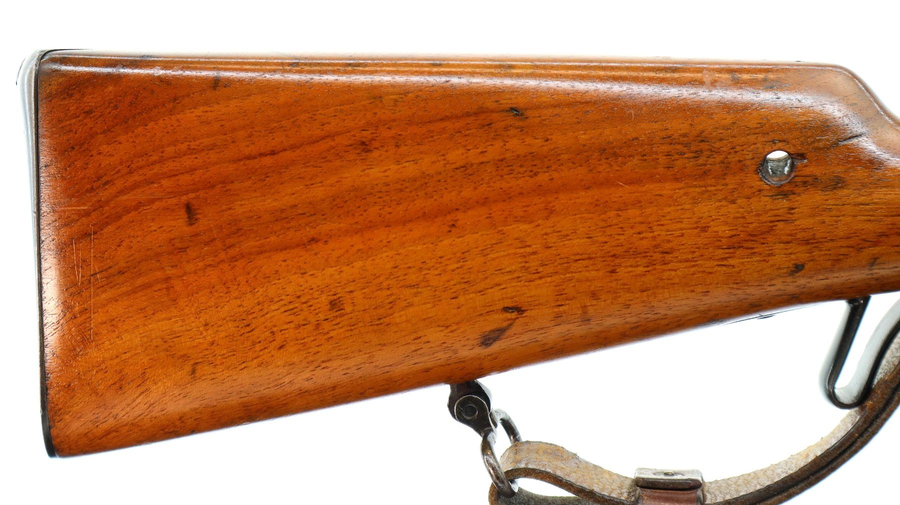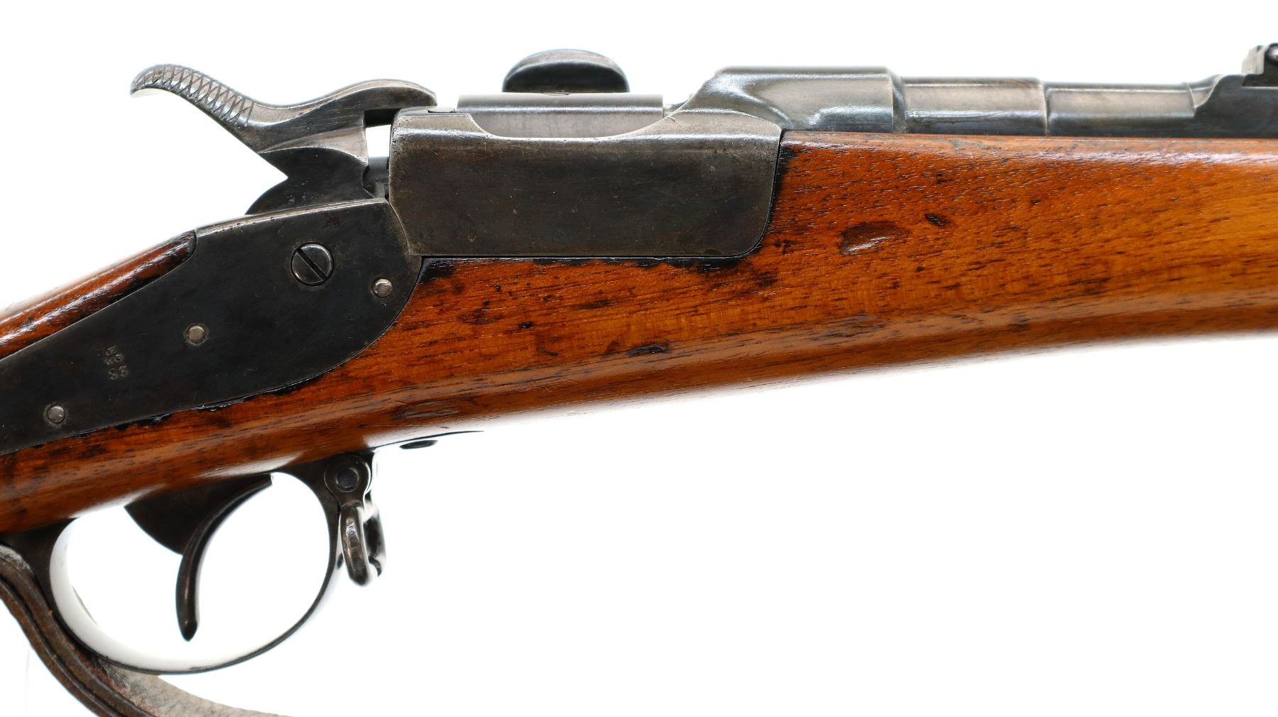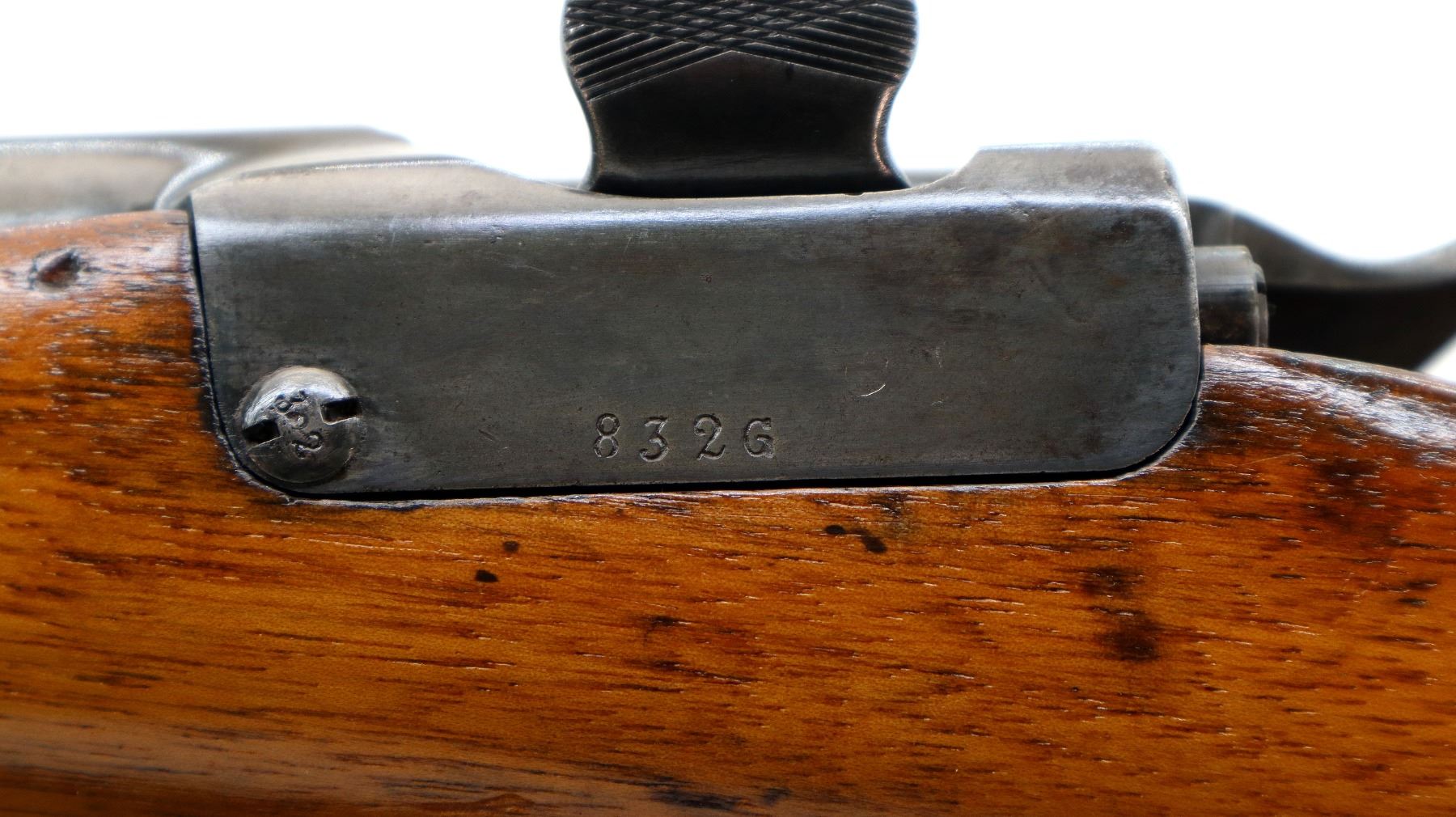 Main Description: Visible numbers match. Blade front sight with ramp, u notched ladder rear sight, spring is broken, blued finish, tapered round barrel, checkered opening lever on breech block, smooth back action lock with checkered spur hammer, hammer is inside the lock and functions. One piece wood stock, straight grip, hole through comb, smooth steel butt plate, finger rest trigger guard, sling swivels with brown leather sling, nose cap and cleaning rod are from a Swedish Mauser