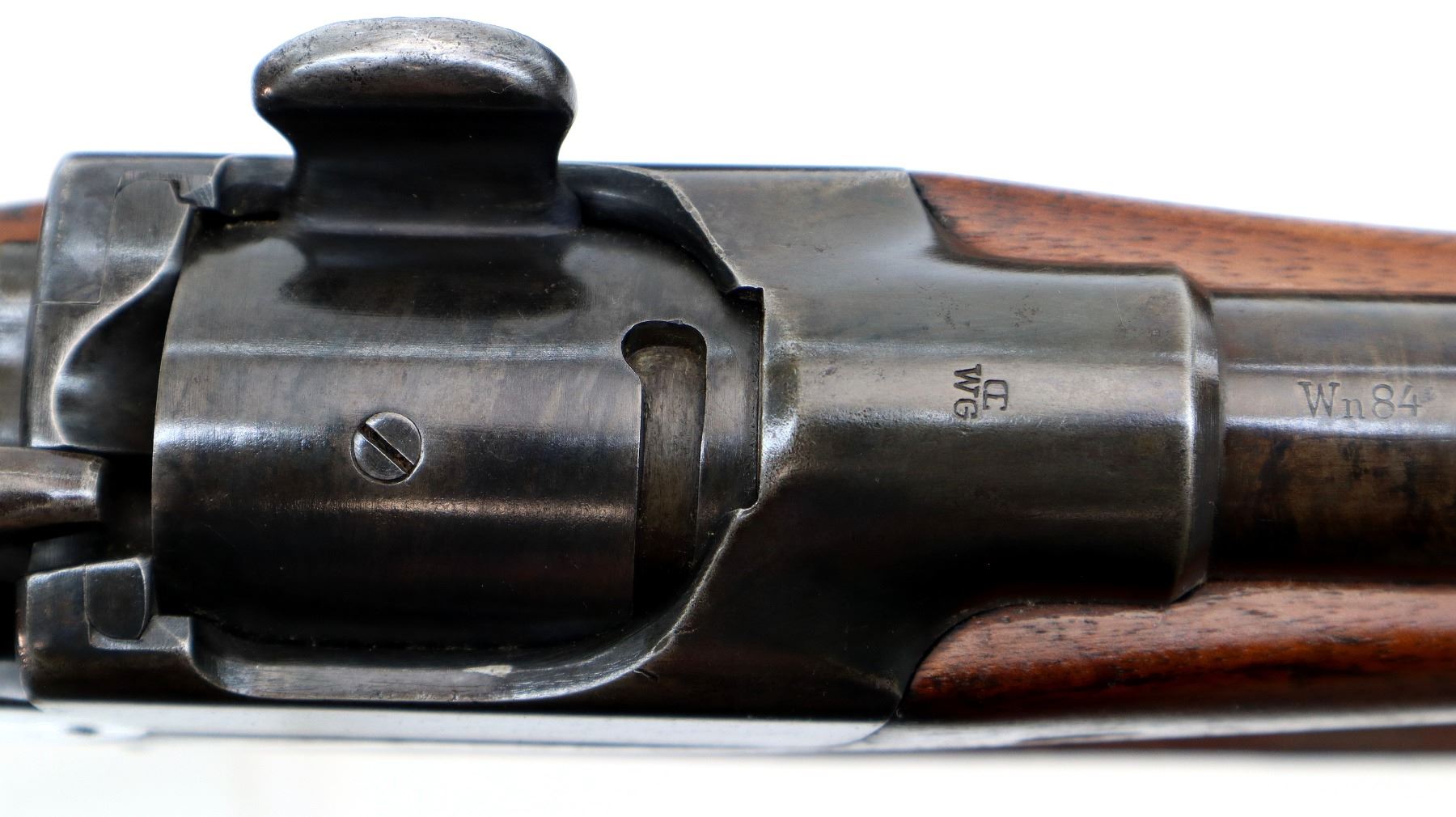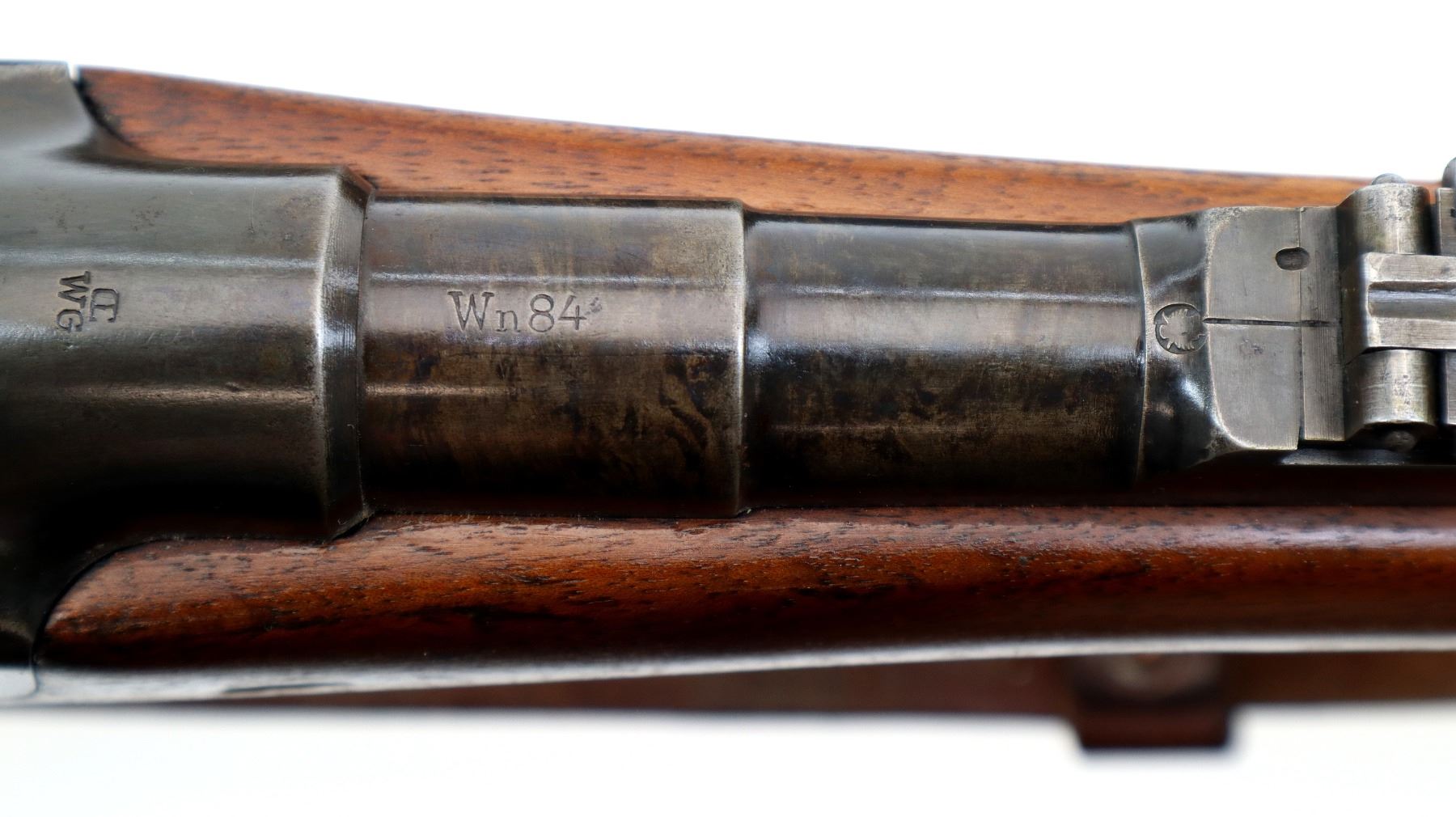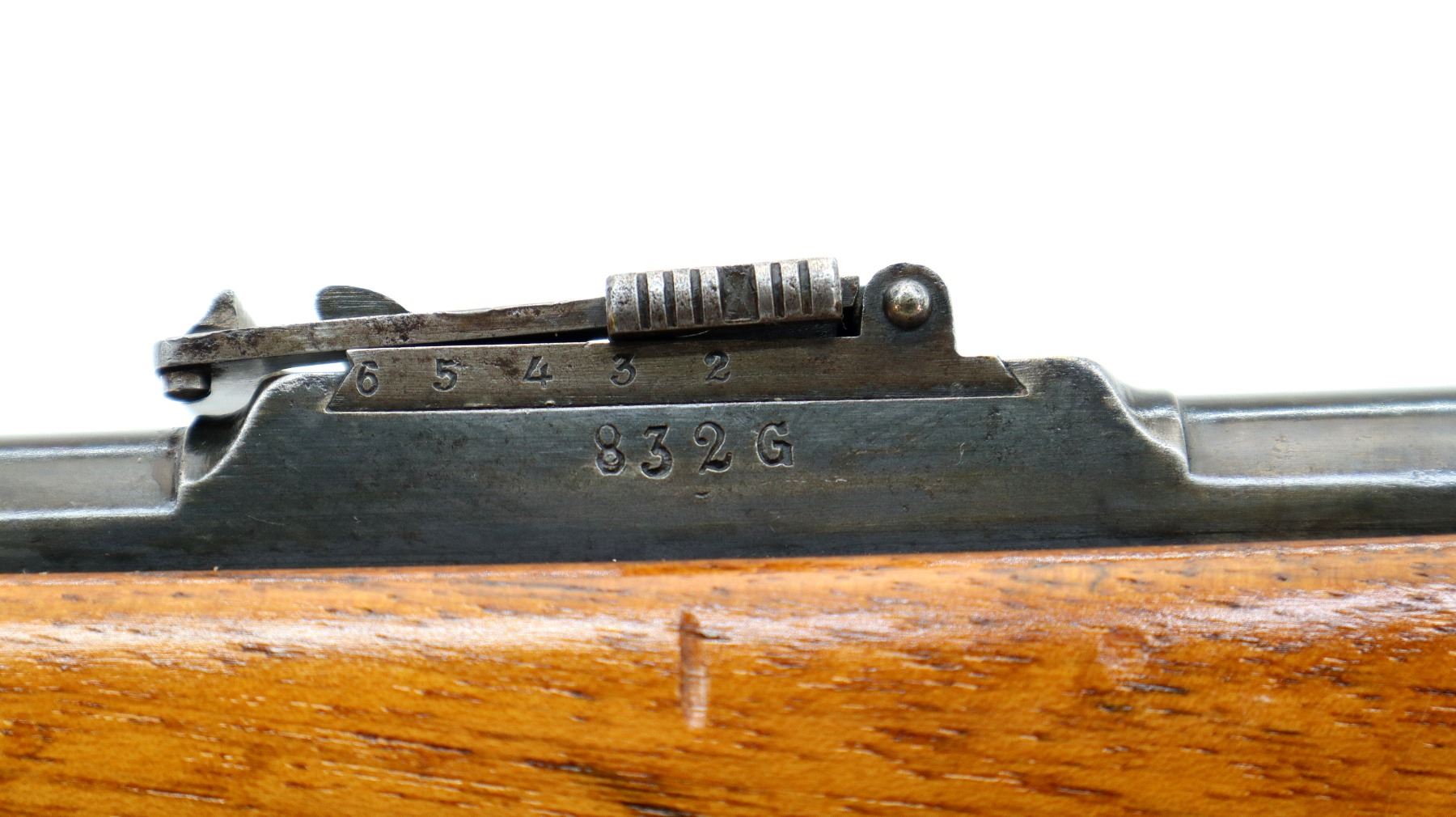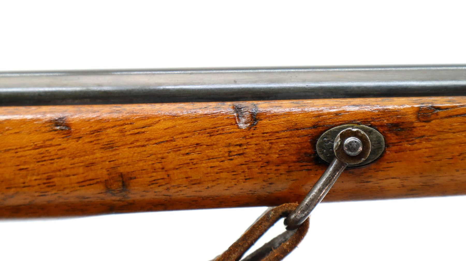 Main Description: Visible numbers match. Blade front sight with ramp, u notched ladder rear sight, spring is broken, blued finish, tapered round barrel, checkered opening lever on breech block, smooth back action lock with checkered spur hammer, hammer is inside the lock and functions. One piece wood stock, straight grip, hole through comb, smooth steel butt plate, finger rest trigger guard, sling swivels with brown leather sling, nose cap and cleaning rod are from a Swedish Mauser