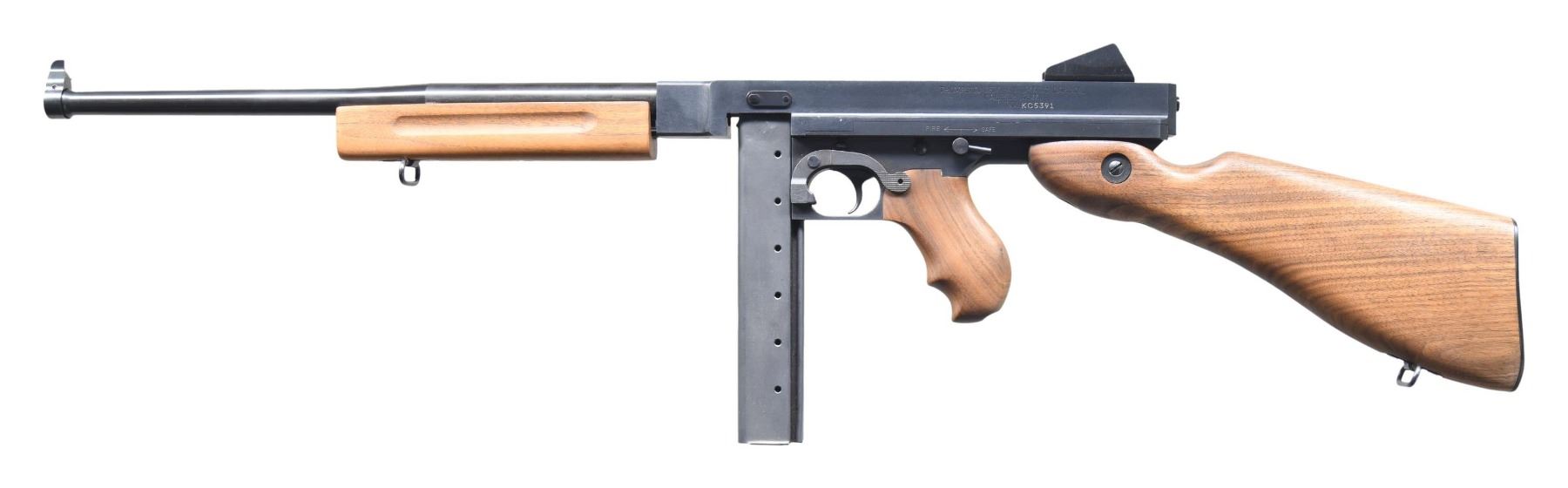 Cal. 45 ACP. S# KC5391. Bbl. 16.5" Matte blued finish. Exposed blade front sight. Tapered barrel w/ smooth profile. Matching hardwood horizontal forend, pistol grip & shoulder stock. Stationary protected peep rear sight. Right side smooth charging handle. Left side receiver markings: "THOMPSON SEMI-AUTOMATIC CARBINE / CALIBER .45M1 / NO. KC5391". Right side receiver marked: "AUTO-ORDNANCE CORPORATION / WORCESTER, MASSACHUSETTS, U.S.A.". Thompson Bullet logo on top of receiver. Bottom sling swivels front & rear. MAGS: 1 steel 30 rd. CONDITION: External finish complete & consistent w/ only moderate signs of prior use. Gentle rub mark on top of barrel typically earned in vertical rack storage. Fire control mechanism appears to function correctly when cycled by hand. (25-2171/JZ). MODERN. $800-1,200.