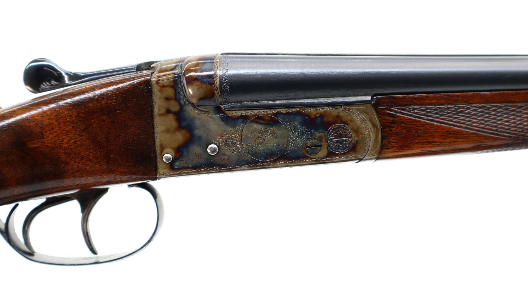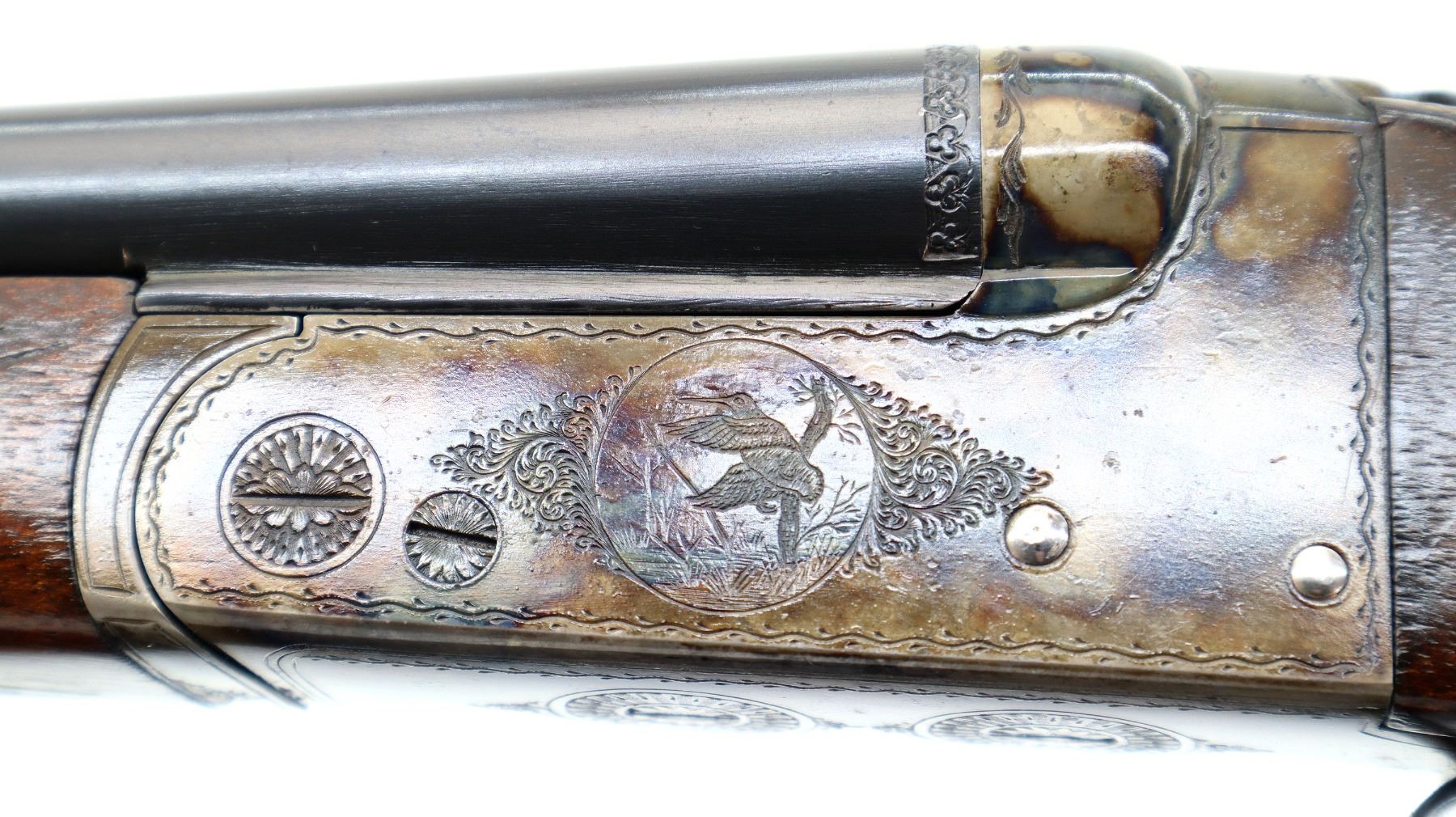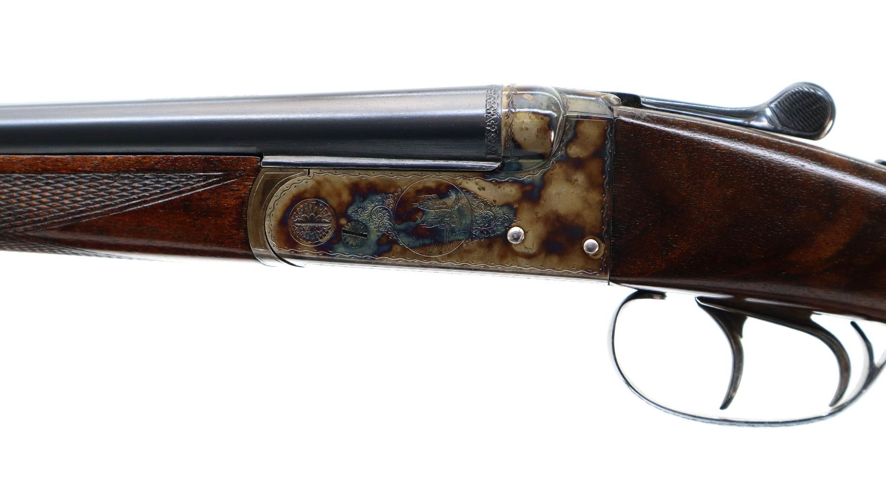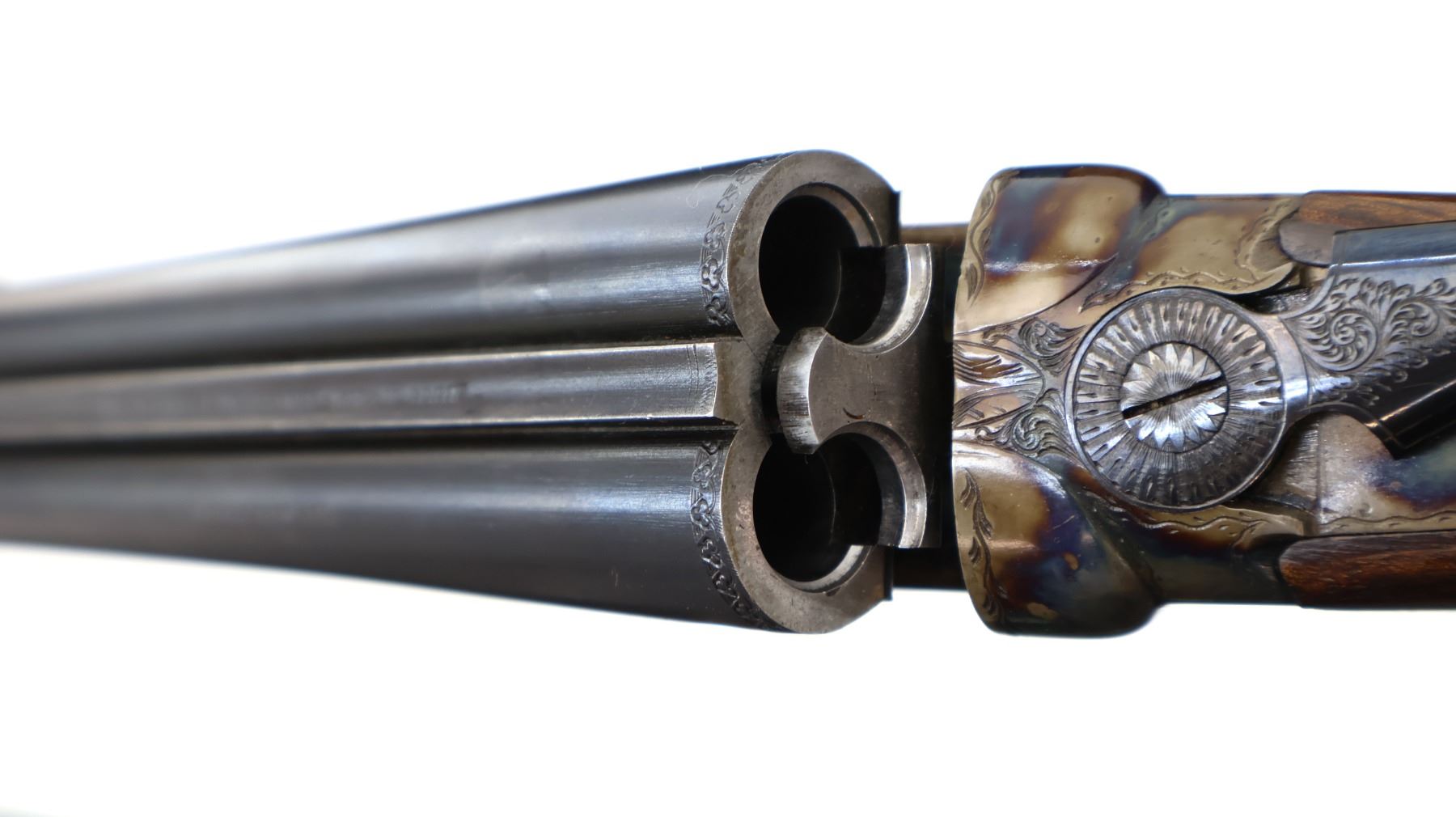 Main Description: Brass bead, blued barrels with smooth rib, engraved colour case hardened receiver with game birds, automatic safety, extractor, double triggers. Two piece wood stocks, checkered forearm and straight grip, checkered black polymer butt plate