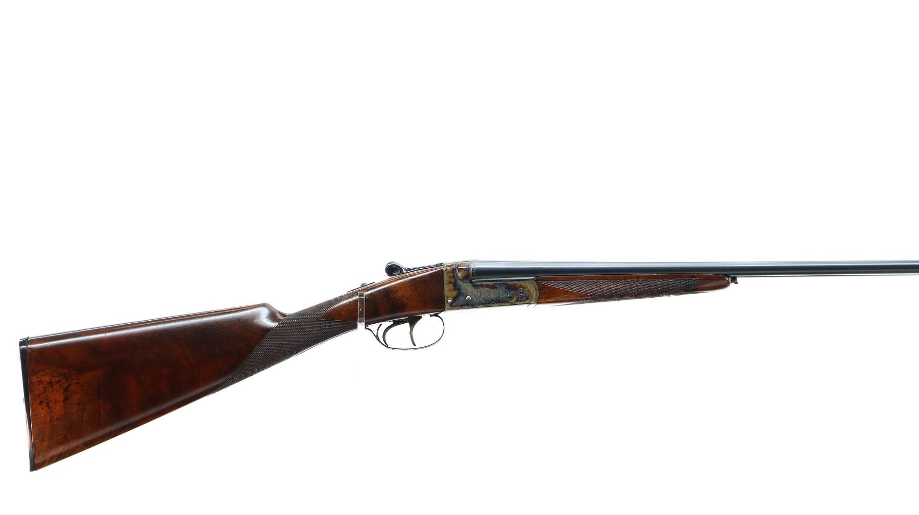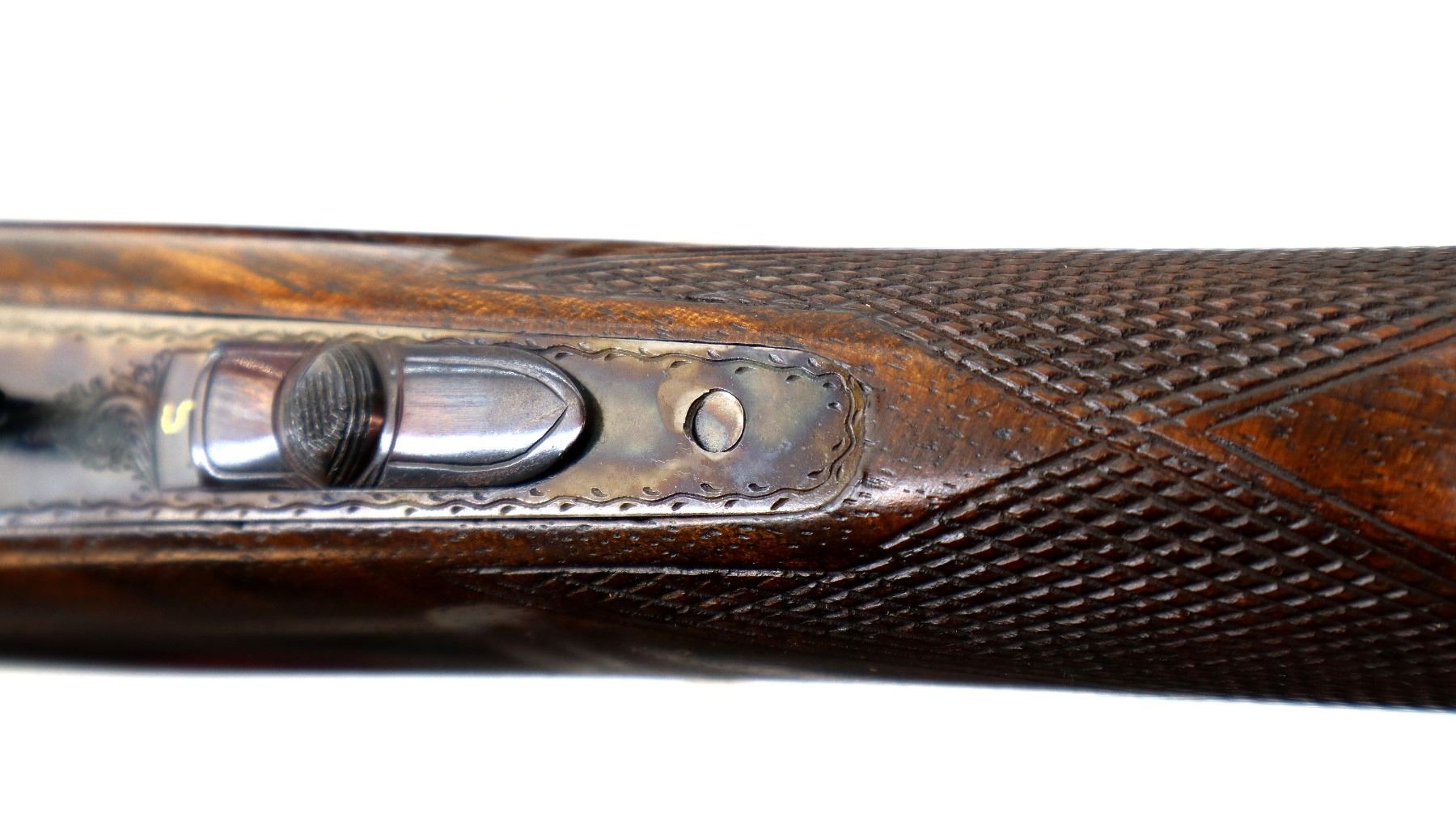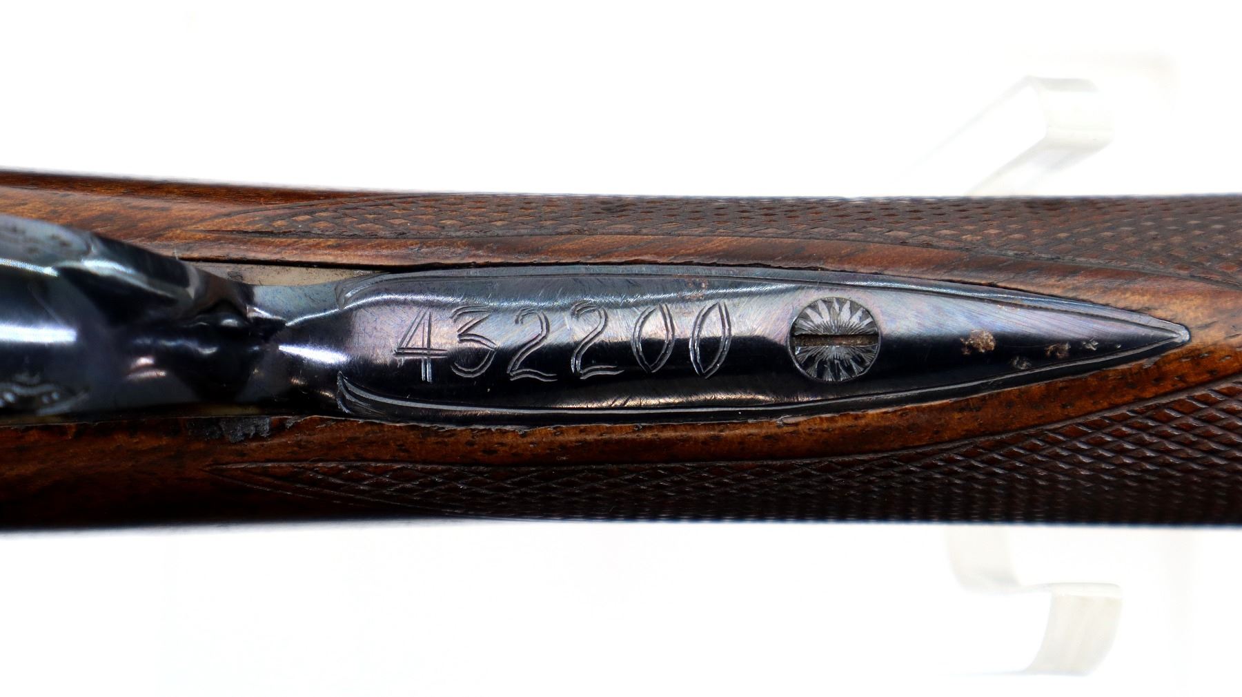 Main Description: Brass bead, blued barrels with smooth rib, engraved colour case hardened receiver with game birds, automatic safety, extractor, double triggers. Two piece wood stocks, checkered forearm and straight grip, checkered black polymer butt plate