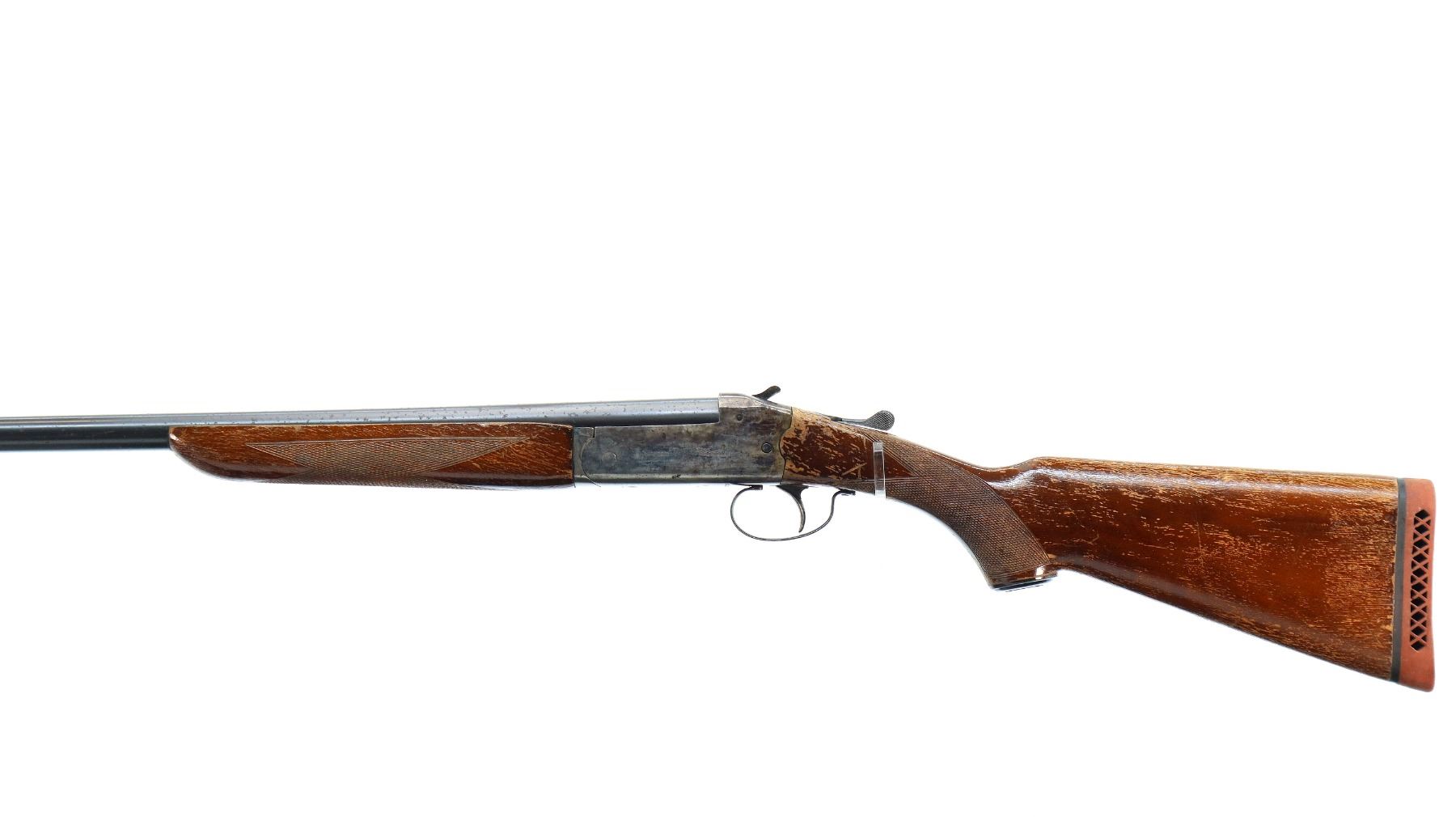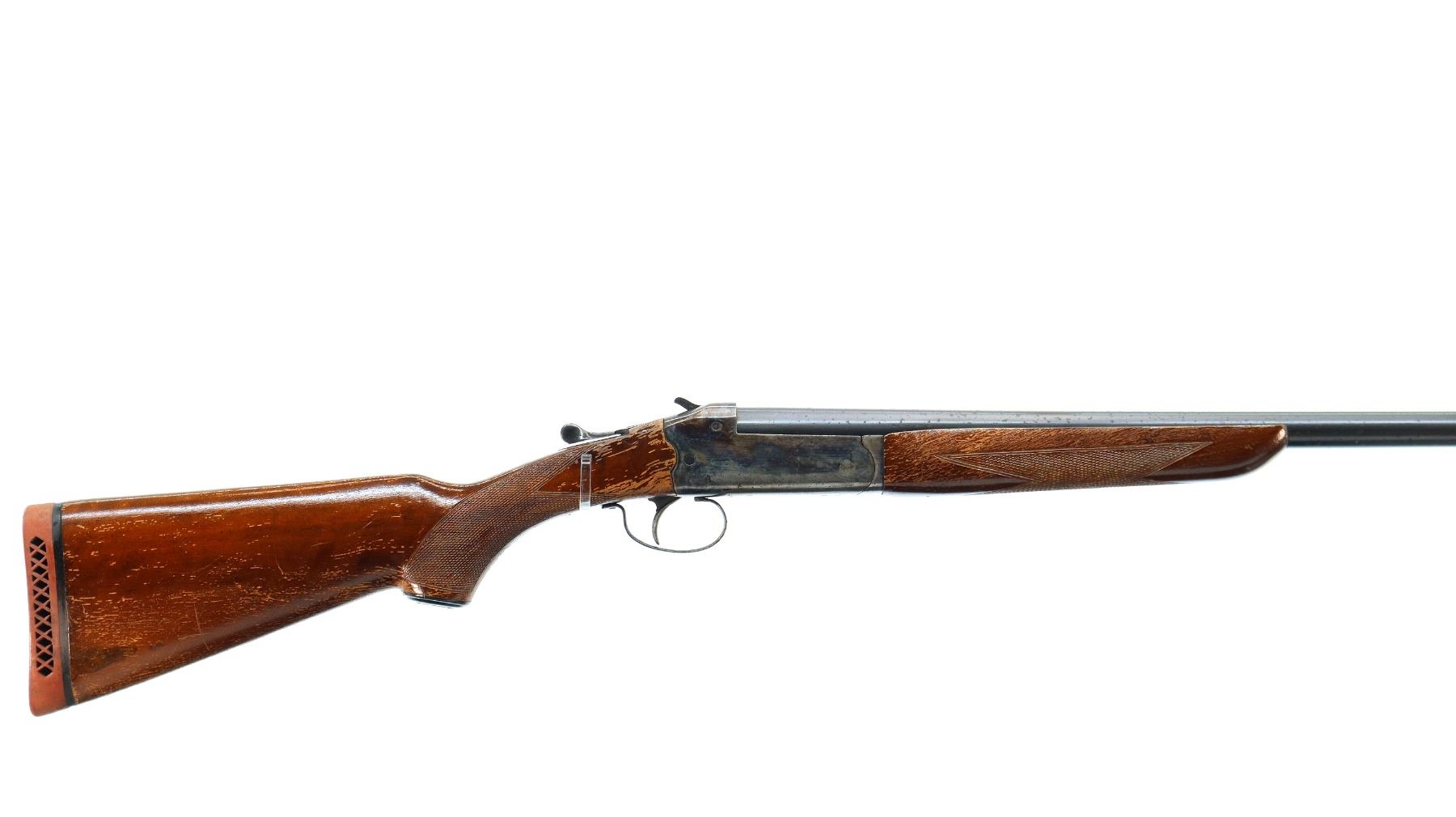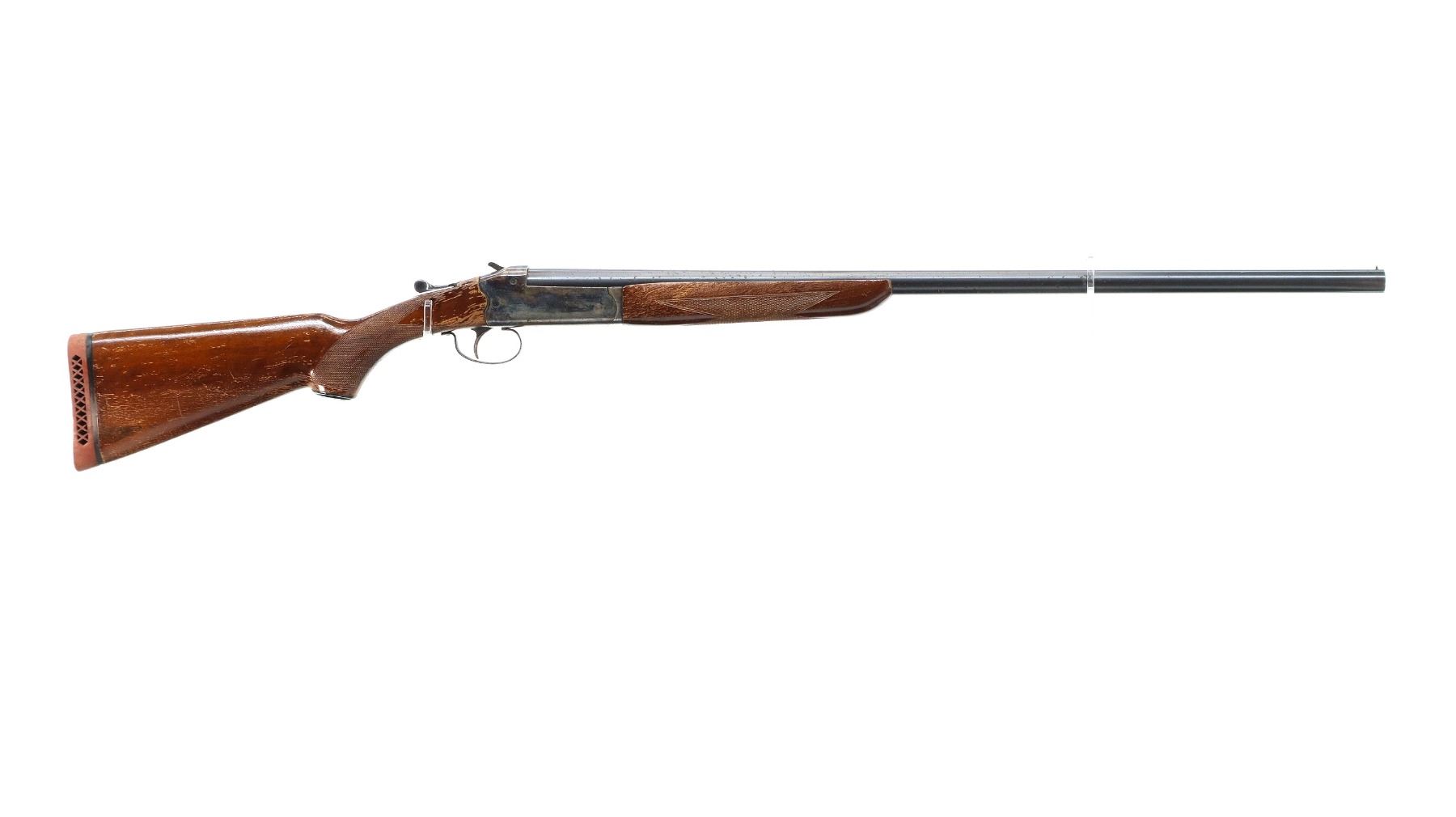 Main Description: Brass bead, blued round barrel, colour case hardened receiver, grooved spur hammer, extractor. Two piece wood stocks, checkered forearm and pistol grip, red vented rubber recoil pad, grip cap.