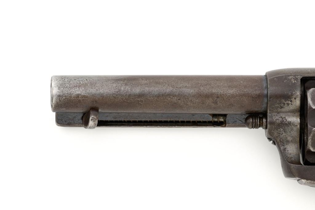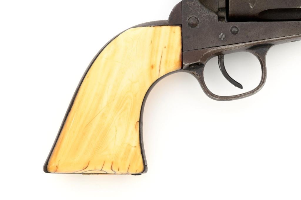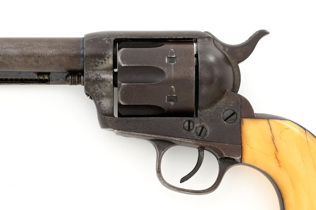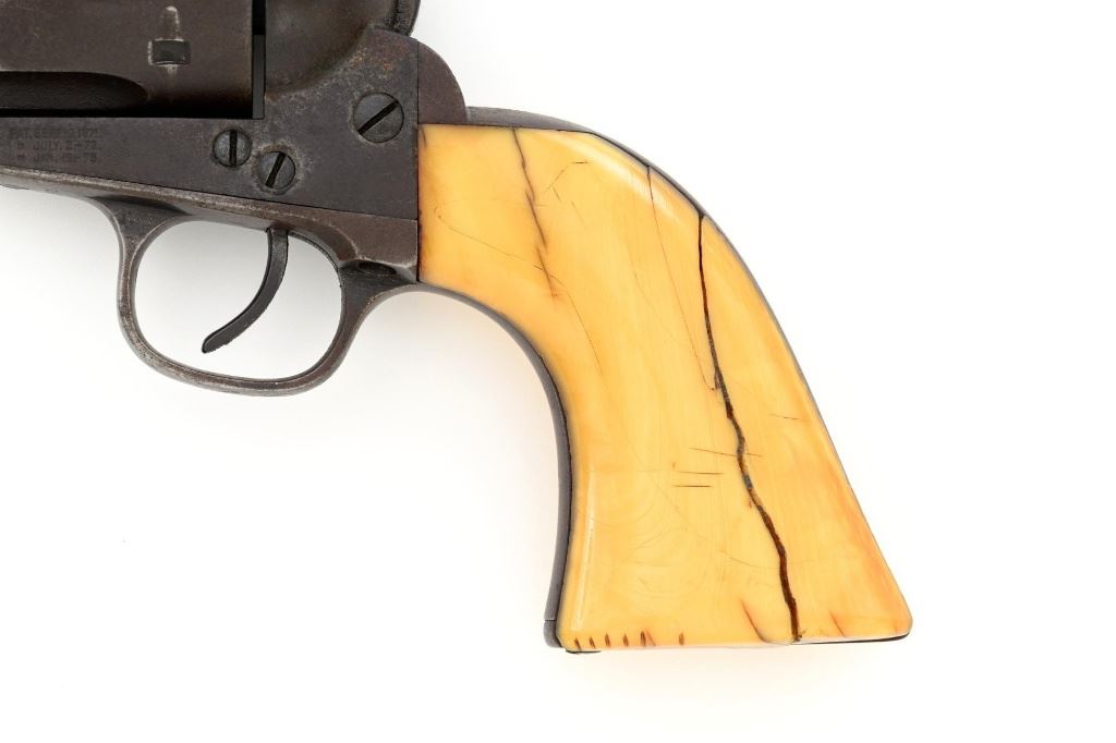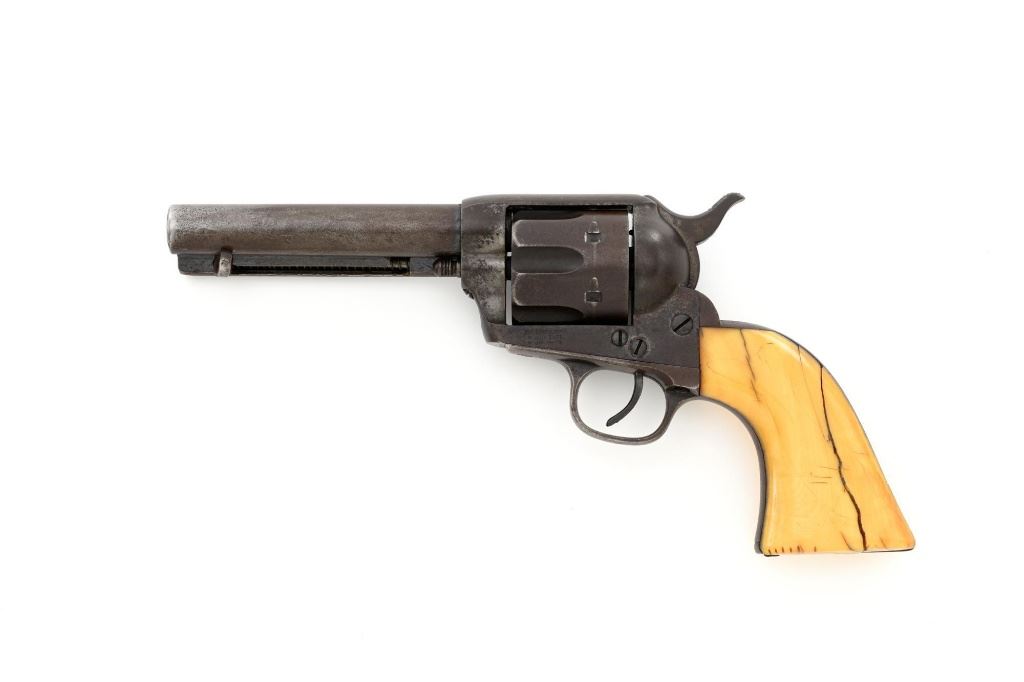 Antique 1st Generation Colt Single Action Army Revolver, #122841, .45 Colt cal., 4.75" barrel, blue and color case hardened finish, smooth antique ivory two-piece grips, front sight removed with a fixed "V"-notch rear sight, and black powder frame, Factory markings are legible, with a two-line barrel address. Mfgd 1887. Revolver is in good overall condition, retaining approx. 5%-10% original finish in the protected areas of the barrel and ejector rod housing, with the remainder gone to even brown patina. Barrel shows scrapes and indentations with scattered spots of light surface erosion. Frame shows traces of smoky gray color case hardened finish, with the remainder gone to dark patina. Screw heads are very good. Frame and trigger guard with matching numbers, backstrap does not match. Inside of the loading gate is marked "78". Patent dates are clear, left side of the trigger guard is marked "45 CAL". Grips display pleasing taffy colored patina with numerous vertical cracks in the left panel, typical age cracks at the base and slightly reduced with age. Action functions but will not hold open and will require repair. Bore is fair, with moderate erosion, rifling is visible. Est.: $2,000-$2,500. (Antique)