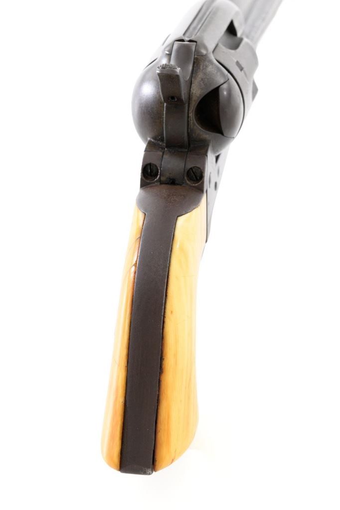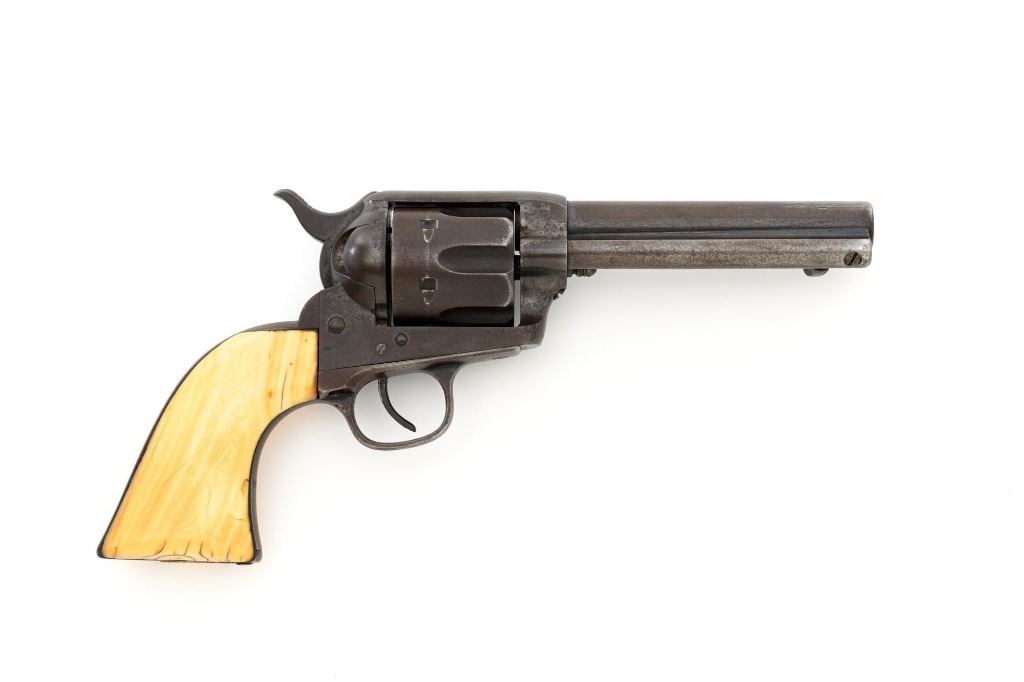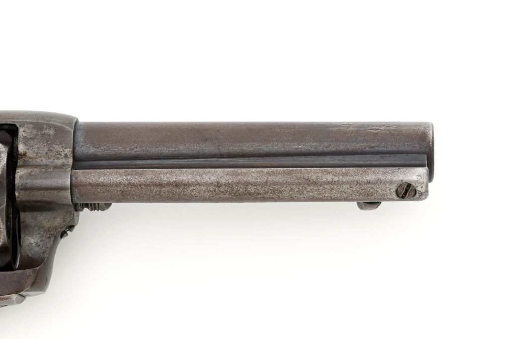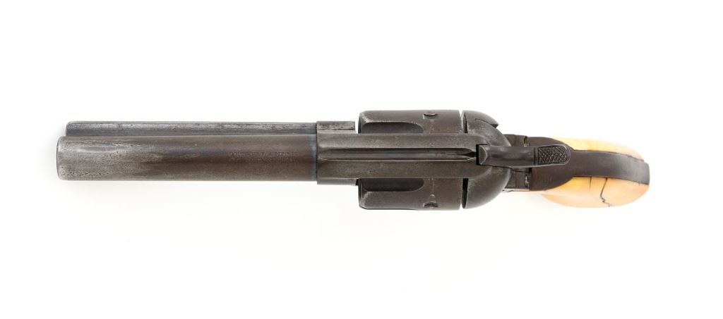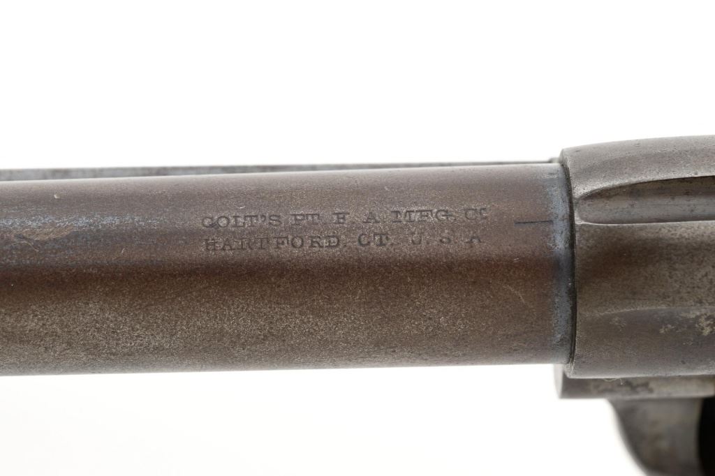 Antique 1st Generation Colt Single Action Army Revolver, #122841, .45 Colt cal., 4.75" barrel, blue and color case hardened finish, smooth antique ivory two-piece grips, front sight removed with a fixed "V"-notch rear sight, and black powder frame, Factory markings are legible, with a two-line barrel address. Mfgd 1887. Revolver is in good overall condition, retaining approx. 5%-10% original finish in the protected areas of the barrel and ejector rod housing, with the remainder gone to even brown patina. Barrel shows scrapes and indentations with scattered spots of light surface erosion. Frame shows traces of smoky gray color case hardened finish, with the remainder gone to dark patina. Screw heads are very good. Frame and trigger guard with matching numbers, backstrap does not match. Inside of the loading gate is marked "78". Patent dates are clear, left side of the trigger guard is marked "45 CAL". Grips display pleasing taffy colored patina with numerous vertical cracks in the left panel, typical age cracks at the base and slightly reduced with age. Action functions but will not hold open and will require repair. Bore is fair, with moderate erosion, rifling is visible. Est.: $2,000-$2,500. (Antique)