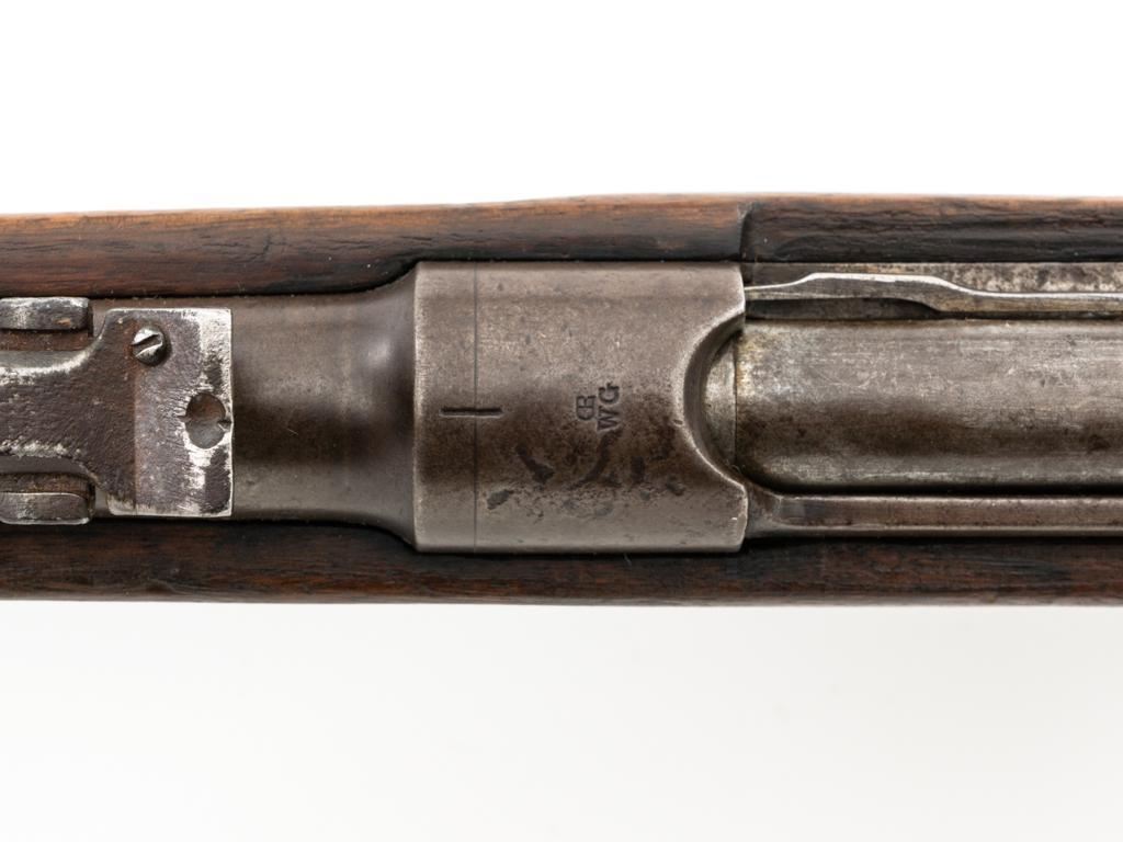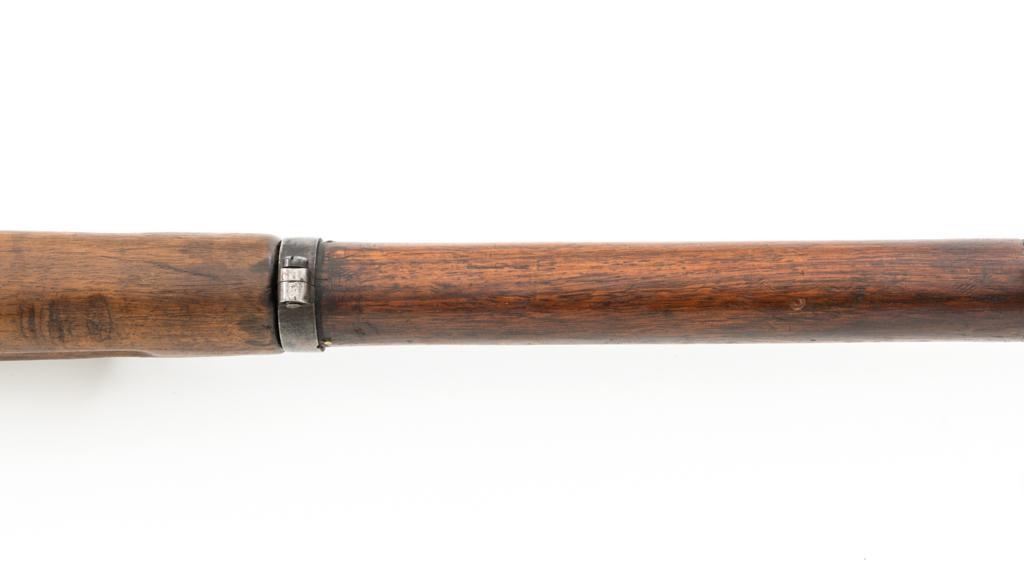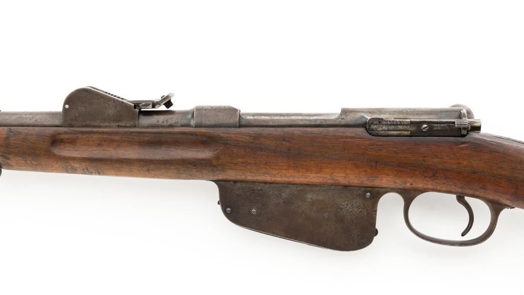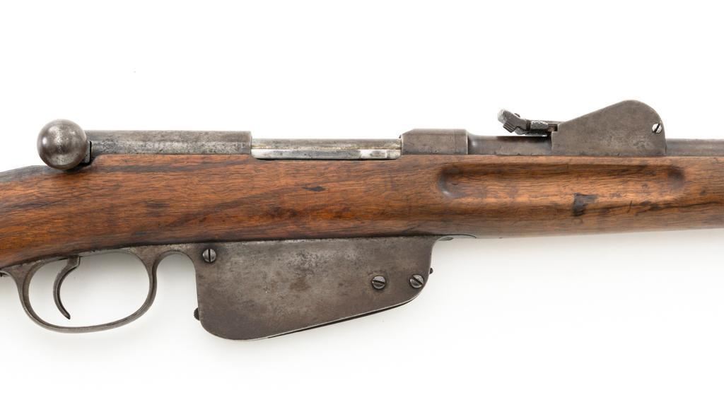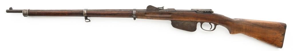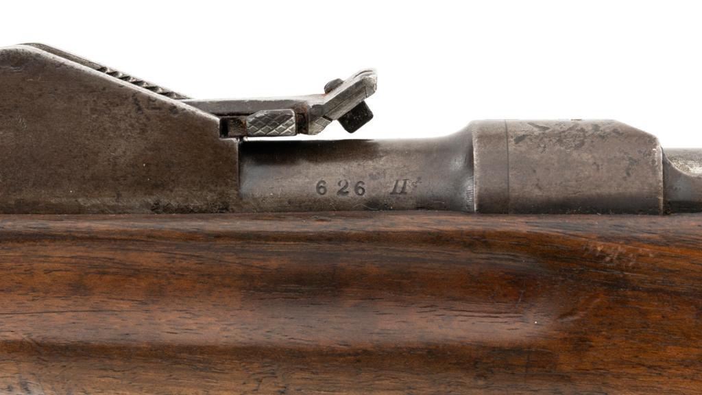 Antique Austrian M1886 Mannlicher Straight Pull Rifle, #626, 11mm Werndl cal., 31.5" barrel, blued finish, hardwood stock, dovetailed inverted-"V" front sight, and adjustable rear sight with "V"-notched groove, graduated to 2300 meters. Stacking hook is missing from under the barrel and the sling mount is missing from the buttstock. Made by Steyr in Austria and marked "OEWG" on top of the receiver ring. There is a faint number stamped on left side of the buttstock. Condition overall is good. Metal has mostly toned brown with areas of light pitting on the receiver and barrel. Wood has been sanded behind the rear barrel band, now in fair condition with a crack to right side of the wrist, with scattered marks from service use. Action operates smoothly. Bright bore rates excellent, with well-defined rifling. Est.: $300-$500. (Antique)