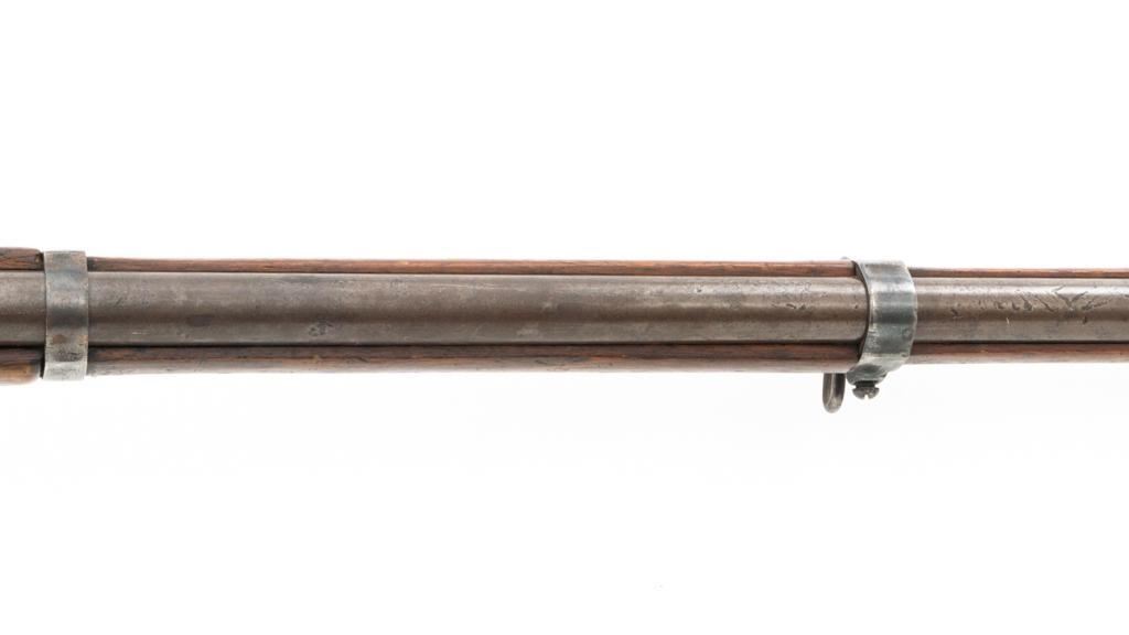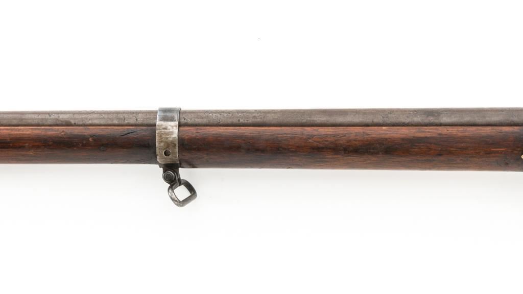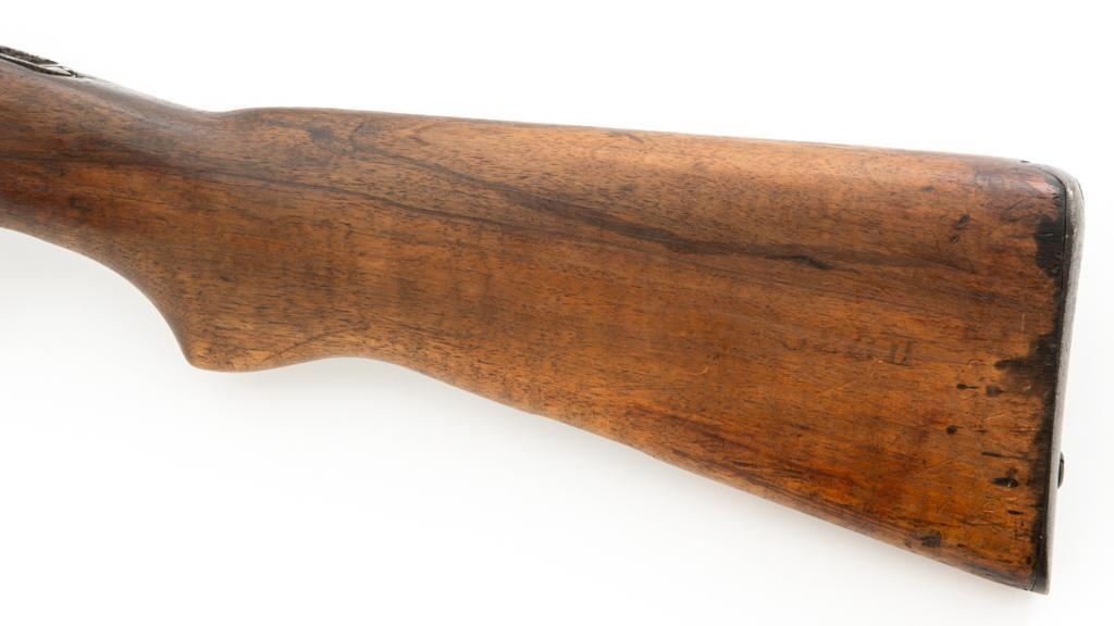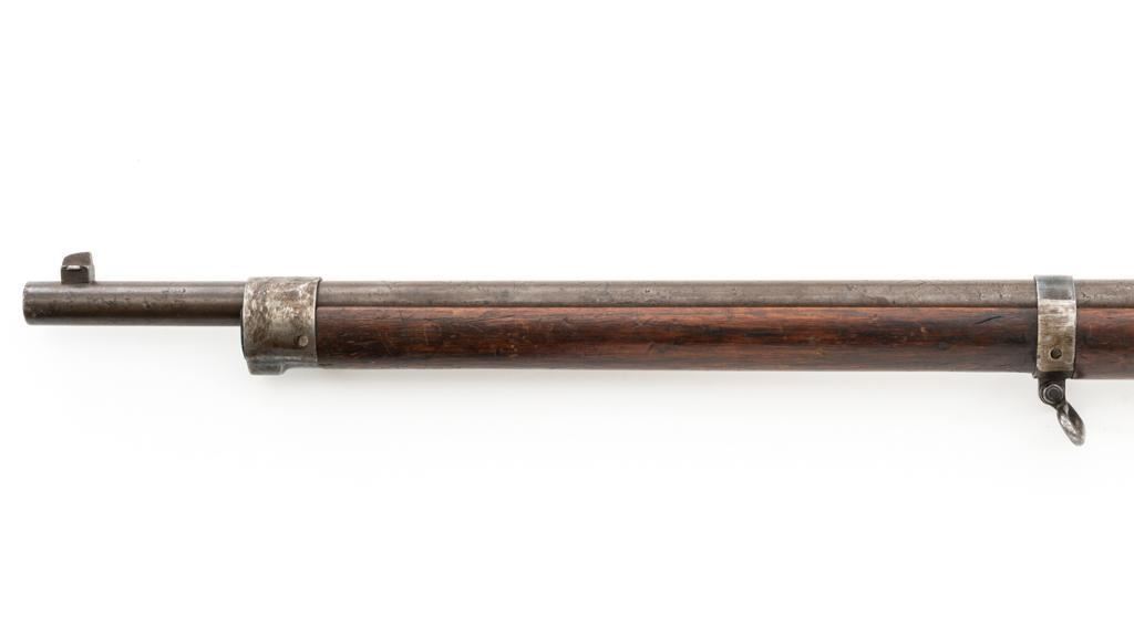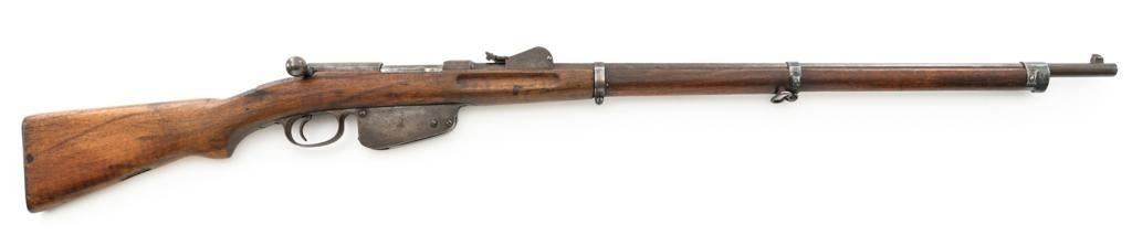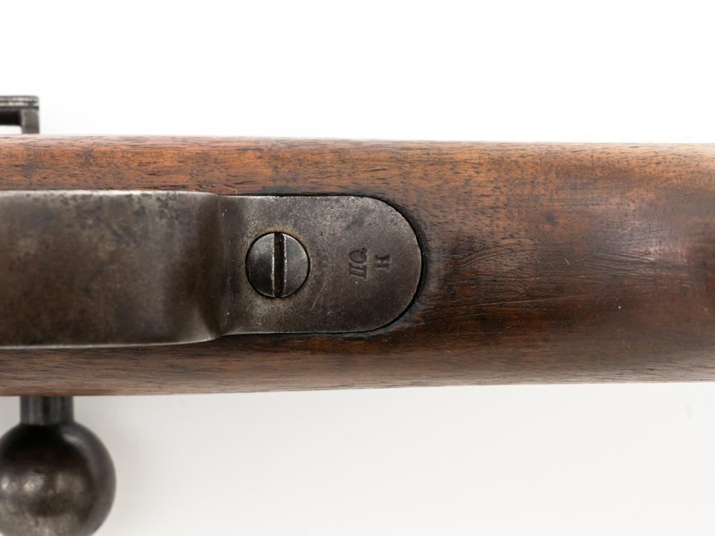 Antique Austrian M1886 Mannlicher Straight Pull Rifle, #626, 11mm Werndl cal., 31.5" barrel, blued finish, hardwood stock, dovetailed inverted-"V" front sight, and adjustable rear sight with "V"-notched groove, graduated to 2300 meters. Stacking hook is missing from under the barrel and the sling mount is missing from the buttstock. Made by Steyr in Austria and marked "OEWG" on top of the receiver ring. There is a faint number stamped on left side of the buttstock. Condition overall is good. Metal has mostly toned brown with areas of light pitting on the receiver and barrel. Wood has been sanded behind the rear barrel band, now in fair condition with a crack to right side of the wrist, with scattered marks from service use. Action operates smoothly. Bright bore rates excellent, with well-defined rifling. Est.: $300-$500. (Antique)