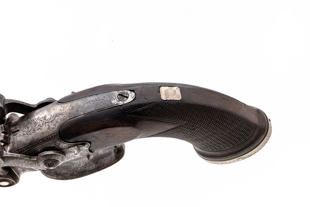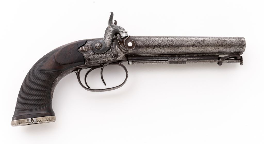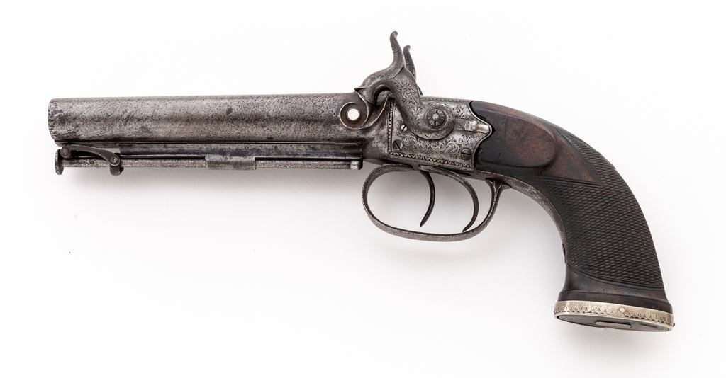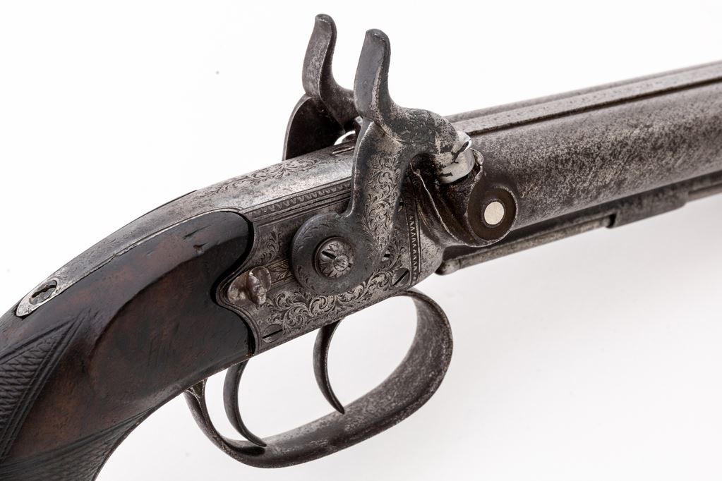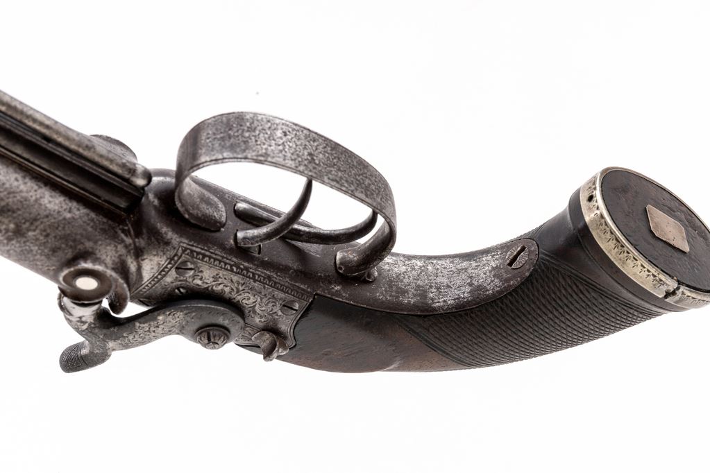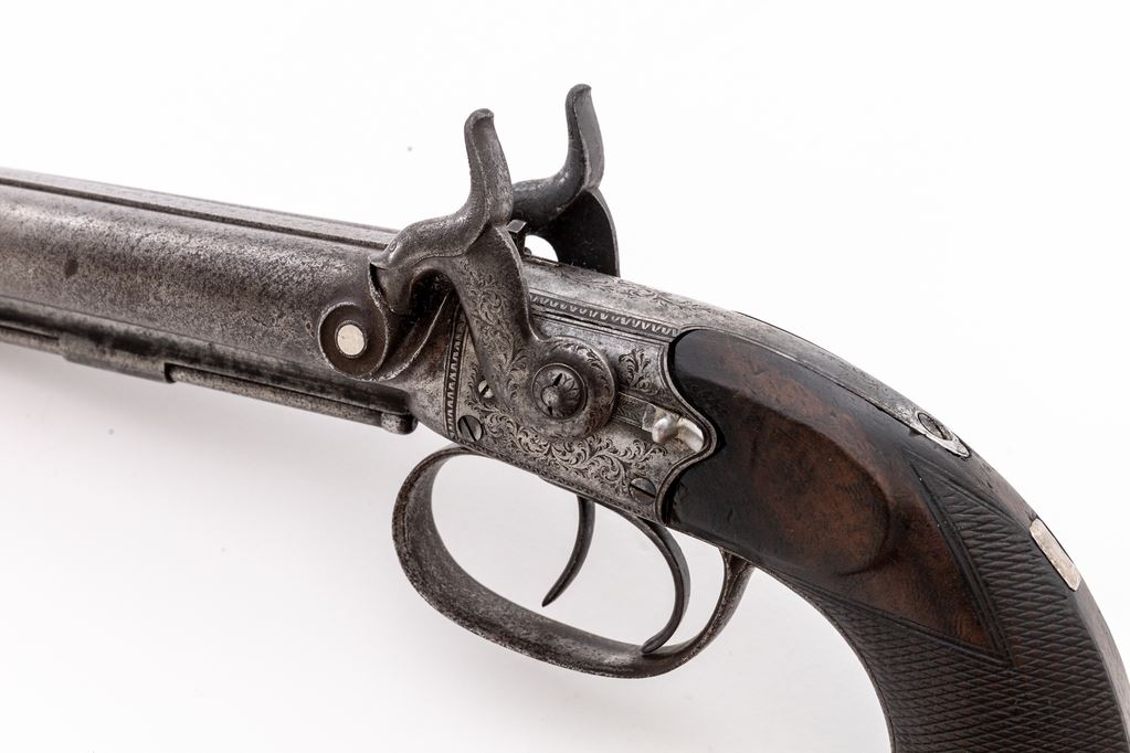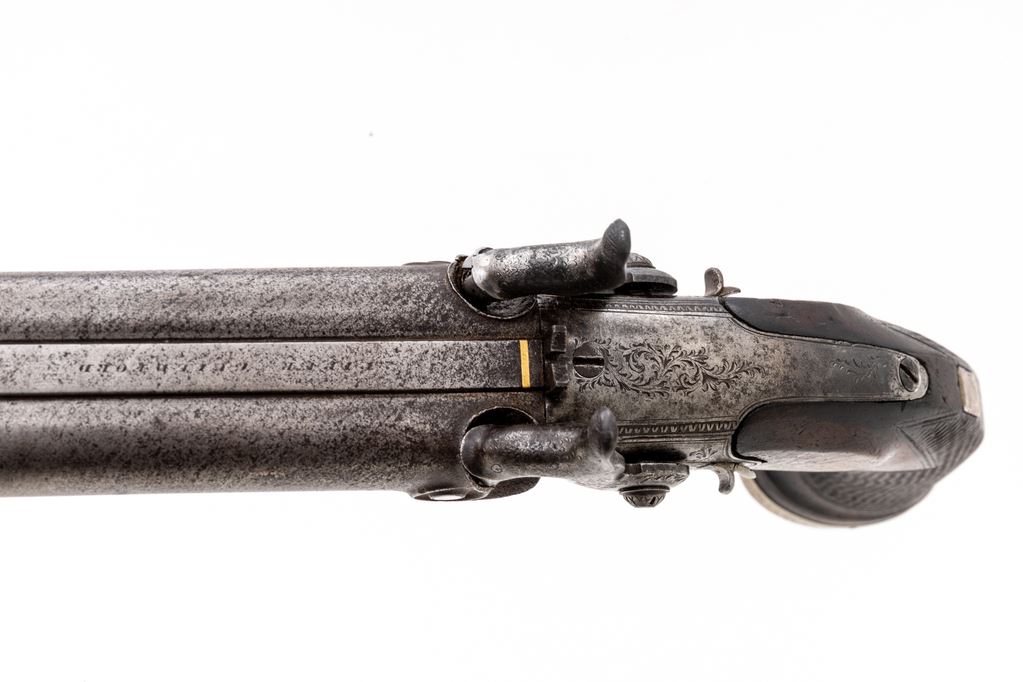 Antique British Double-Barrel Large-Bore Percussion Howdah Pistol, NVSN, .58 cal./20 ga., 6" Damascus barrels are marked "Piper Guildford" on full-length top rib with gold band at breech, have platinum blowout plugs on sweeping flash-shields, Birmingham proofs, captive ramrod on central rib below; rounded iron frame has scroll engraving, matching hammers with sliding rear safeties, twin triggers, loop trigger guard, 1-pc. flat-butt checkered walnut grip with raised panels at each side behind lock, German-silver nameplates at wrist and butt, raised molding at butt with engraved silver band. Mfg'd. ca. 1830s-40s. Condition is very good retaining no original blue, good Damascus pattern, being generally smooth gunmetal gray with scattered oxidation. Edges, markings and engraving are very good. Grips show sharp checkering and a couple minor bumps, silver ring at butt molding is broken at right retaining nail. Actions are firm and crisp, nipples are mashed, nose of right hammer has been filed; smoothbores show overall light-to-moderate rust erosion. In 1851 Henry Piper sold his London gunmaking business to Richard Jeffery of shotgun fame. Est.: $1,500-$2,500. (Antique)