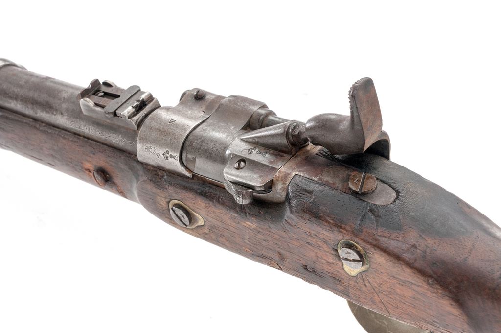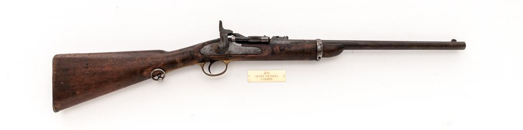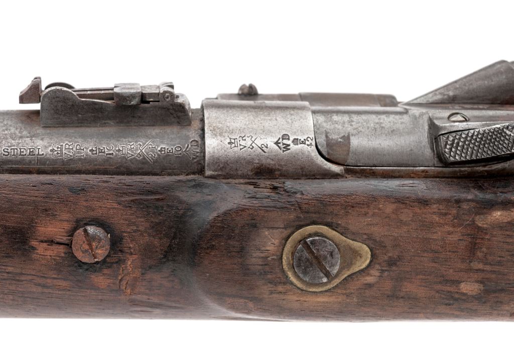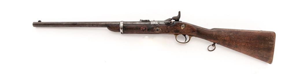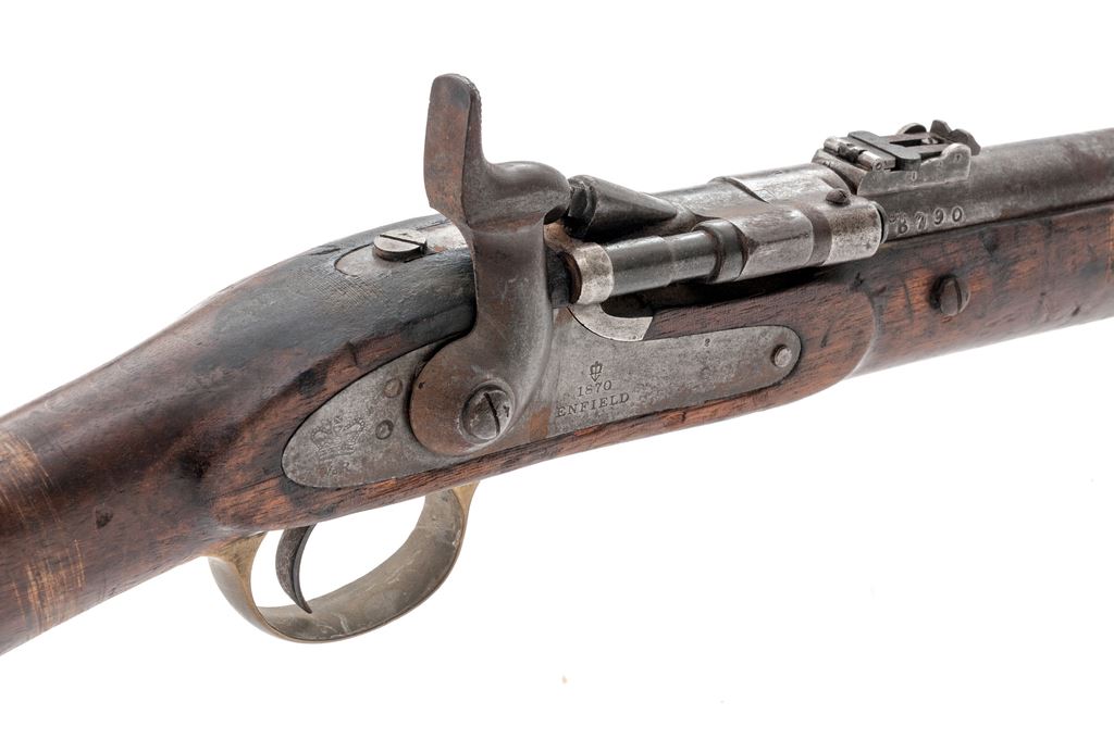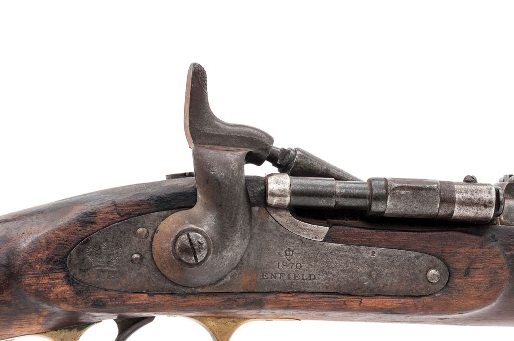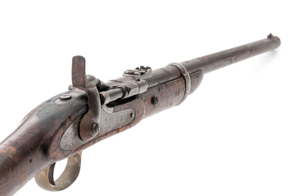 Antique British Enfield-Snyder 1870 Mark III "Queen Victoria" Breechloading Cavalry Carbine, #B790, .577 CF cal., 19.25" round barrel marked "Steel" and with numerous view and proof marks including "(Broad Arrow)/WD" at breech, retains standard sights; side hinged Snyder "trap-door" breechblock shows many of the same markings plus "III" at top breech and "7675" inside, has left-side knurled release button, floating firing pin; flat lockplate marked "(crown)/1870/Enfield" ahead of hammer, "(large crown)/V.R" behind; brass fittings include loop trigger guard with large iron sling ring behind, buttplate marked "R9/B/32" at top, with hinged door opening to butt trap for 2-pc. cleaning rods (not present), 2 teardrop-shaped lock screw escutcheons; oil-finished walnut P1853 carbine stock marked with vertically-opposed broad arrows over circular "R/(crown)/(?)/(broad arrow)/WD/Enfield" mark, retained by single screw-clamp band with proofmarks, has 2 screws (purpose unknown) ahead of lock. Mfg'd. 1870s as a cartridge arm, not a conversion. Condition is complete and about good retaining no original finishes, the barrel and hammer showing light-to-moderate corrosion, balance of the metal toned gunmetal gray. Stock is sound showing the effects of hard military use with scattered dings and scrapes. Edges and markings are generally sharp, trapdoor hinge is solid. Action is crisp, bore is clean showing oxidation in grooves and sharp rifling. Est.: $500-$700. (Antique)
