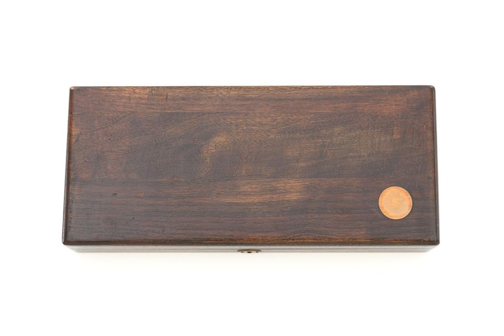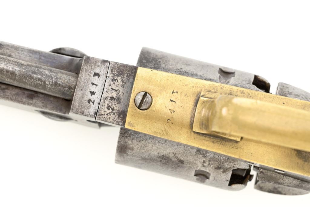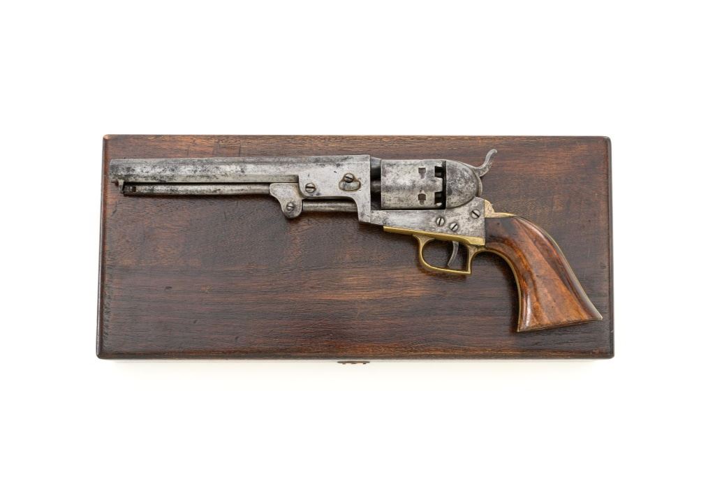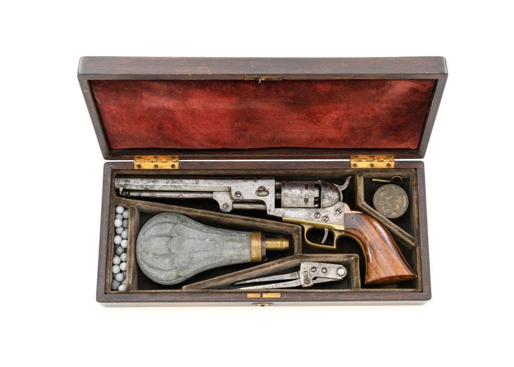 Antique Cased Belgian Brevete Copy of a Colt Model 1851 Squareback Navy Percussion Revolver, #2413, .36 cal., 7.5" barrel, originally with blue and case hardened finish, brass trigger guard and backstrap, smooth hardwood grips, with small iron cone front sight. Top barrel flat at the breech is marked "COLT BREVETE". Matching serial numbers on bottom flat of barrel assembly, frame, and trigger guard. Rear of the cylinder with a small Belgian proof mark. Accompanied by a hardwood compartmentalized & lined display case containing a metal & brass powder flask, a Colts Patent iron two-cavity bullet mold, cap tin, key, and numerous old lead balls. Condition of this revolver is fair+, no finish remains, metal now retains a mixture of gray and black patina, with areas of moderate pitting and erosion. Hardwood grips are near fine, with pleasing grain patterns, scattered handling marks particularly on the left side, and retain most of their finish. Although displaying the correct three "click" cocking action, the cylinder only rotates intermittently. Bore is fair, with traces of rifling visible, light rust and erosion. Condition of the case and accessories ranges from fair to good, showing varying degrees of age and wear, but remains consistent with the overall condition of the revolver. Est.: $800-$1,200. (Antique)