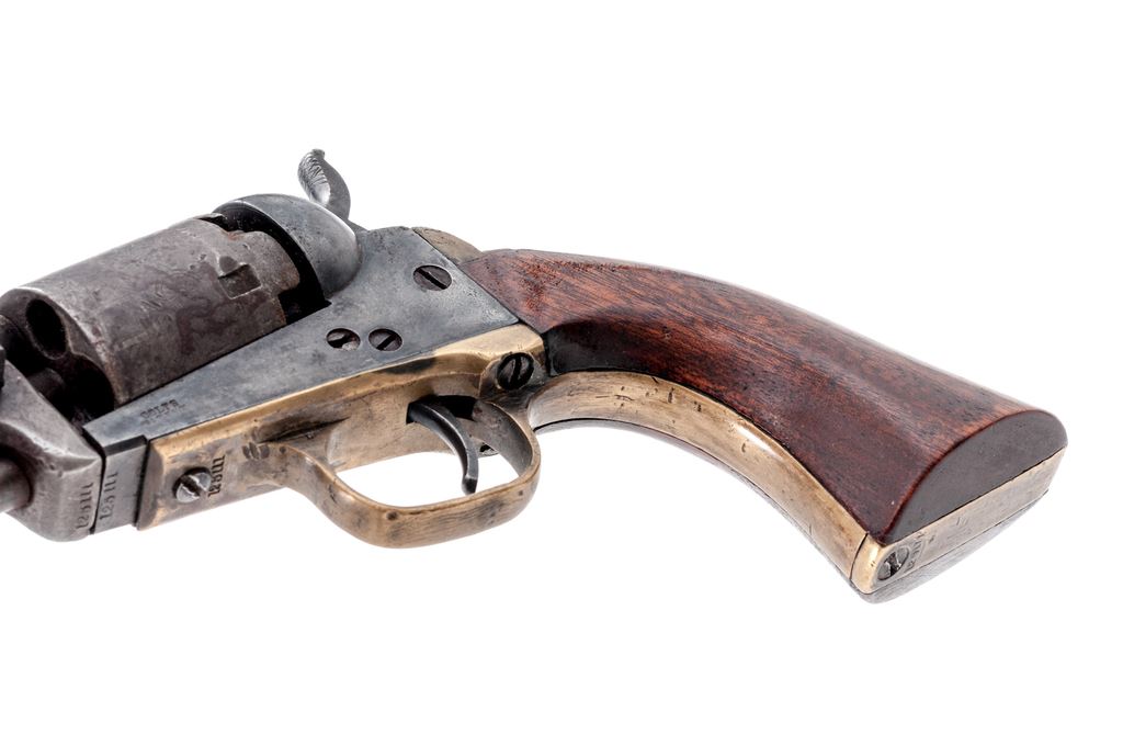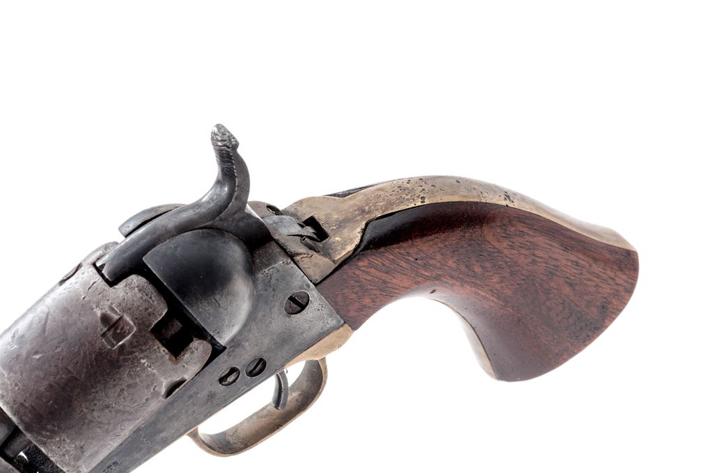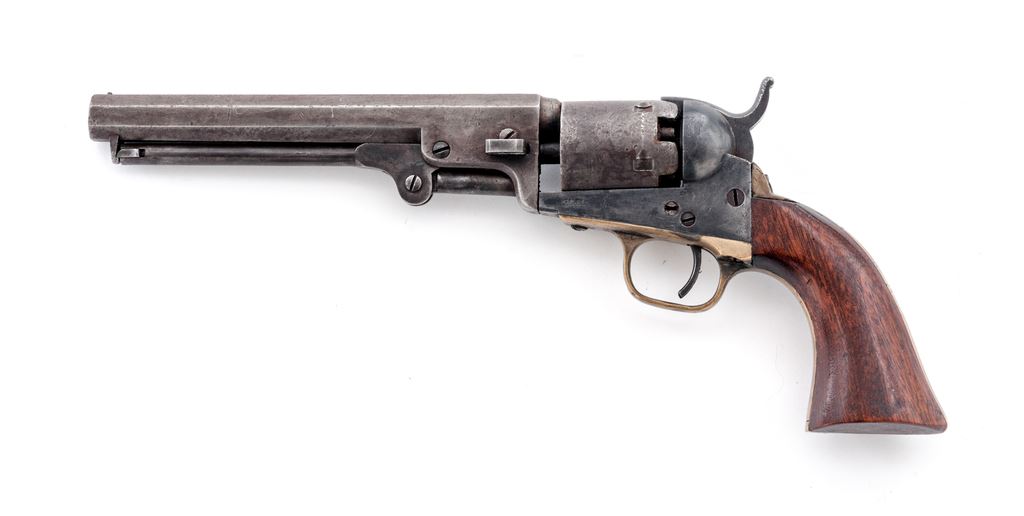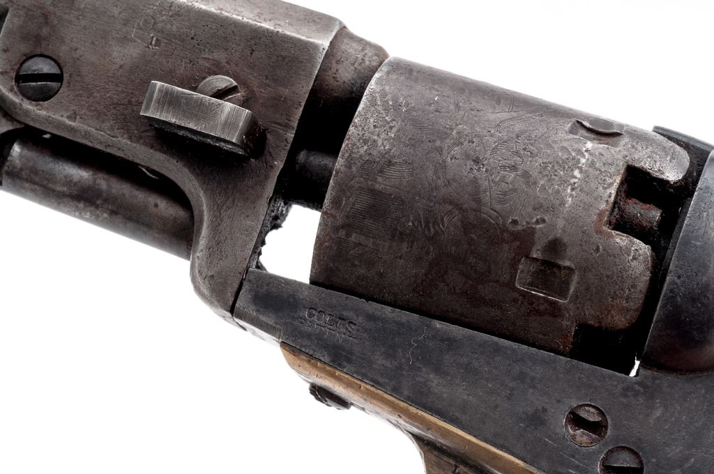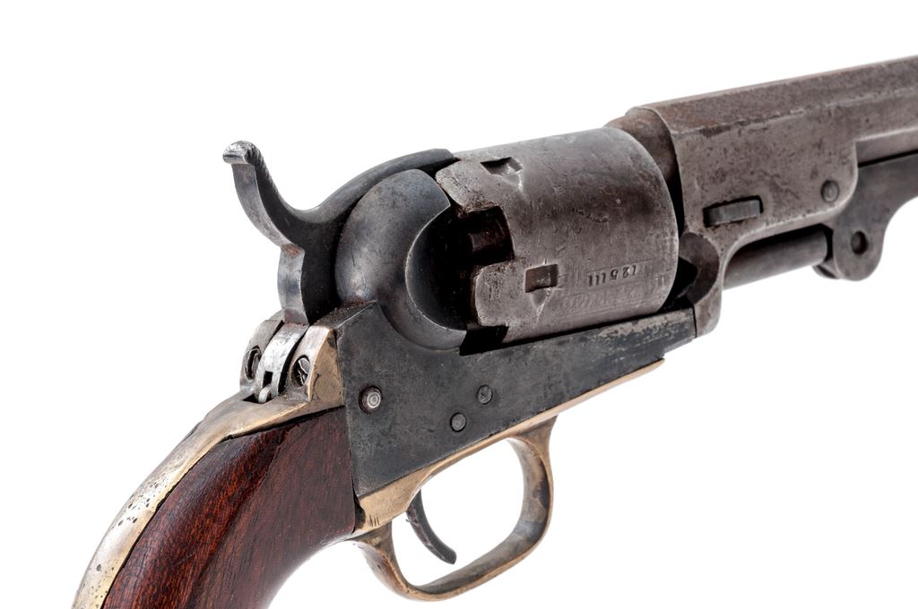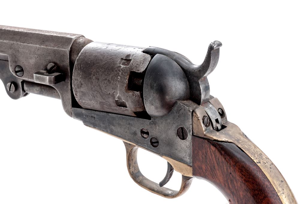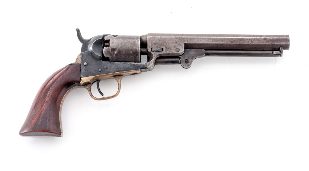 Antique Colt Model 1849 Percussion Revolver, #125111, .31 cal., 6'' octagonal barrel with standard sights, marked with maker's name and address in two lines on top flat; round 5-shot cylinder is decorated with the rolled ''stagecoach hold-up'' scene, marked ''Colt's Patent/125111'' on periphery; open-top frame is marked ''Colts/Patent'' at left-front, has central hammer and trigger; two-piece brass gripstraps with one-piece varnished walnut grips. Mfg'd ca. 1856 with blued barrel/cylinder, case hardened frame/hammer, silver-plated straps. Condition is very good, retaining no original finishes but a smooth gunmetal gray-brown patina, moderately toned brass (both having occasional light marks and discoloration), solid and smooth grips. All parts appear original and fit well (wedge is a replacement), visible serial numbers match, cylinder scene is light and 50% visible. Action is smooth (does not hold full-cock); bore shows overall oxidation and sharp rifling. Est.: $500-$750. (Antique)(John Ackerman collection)