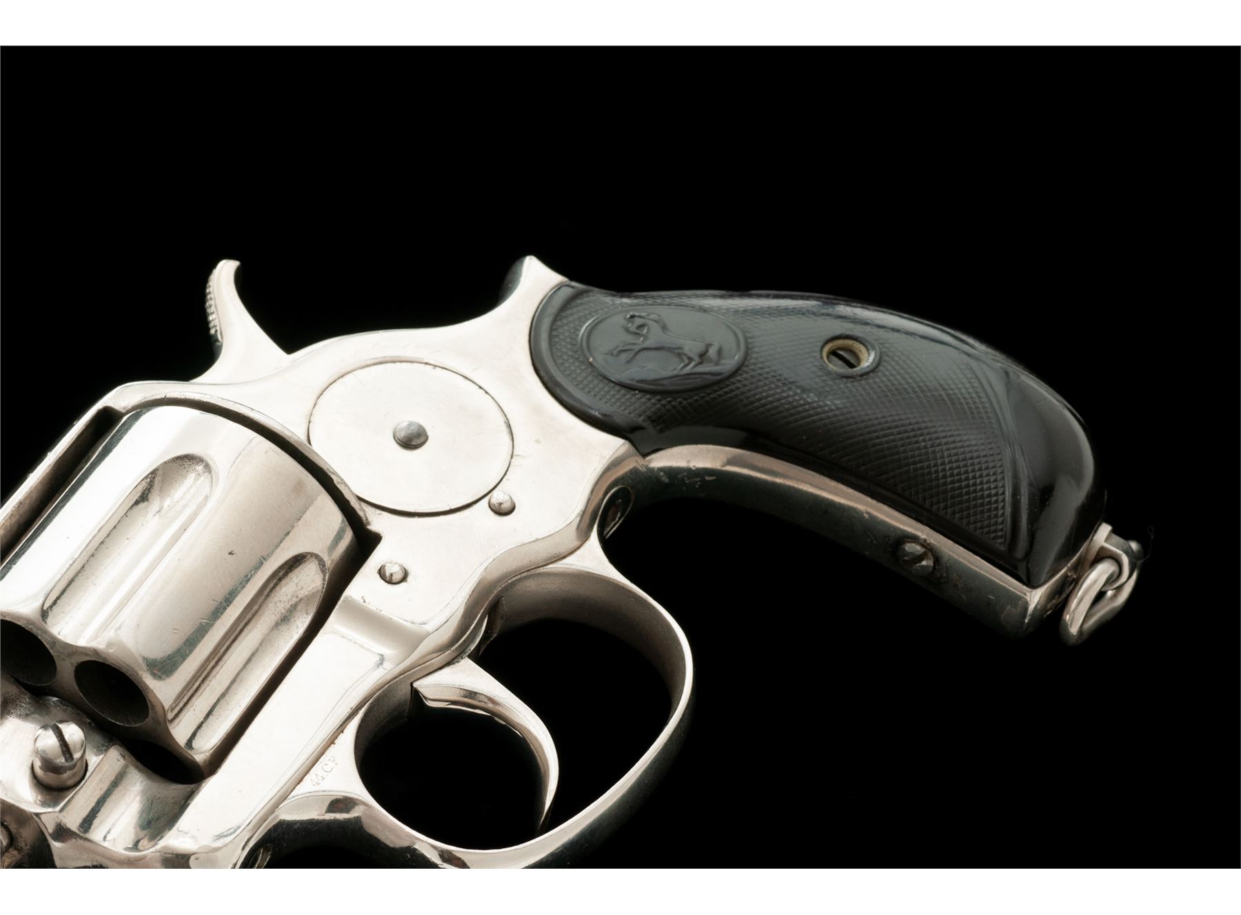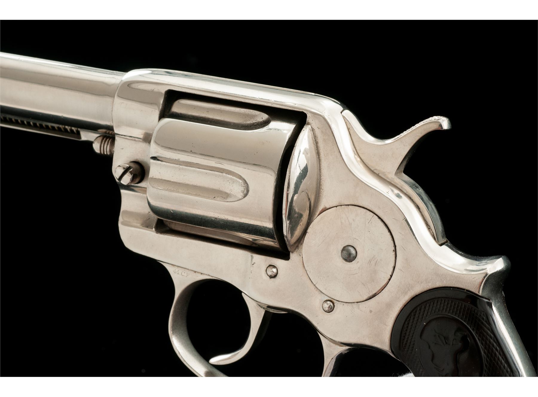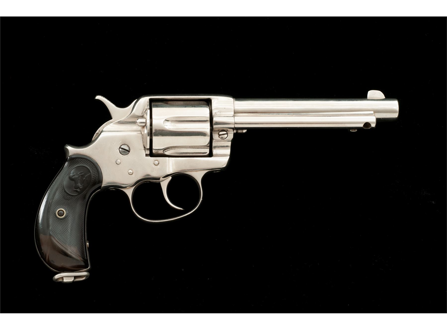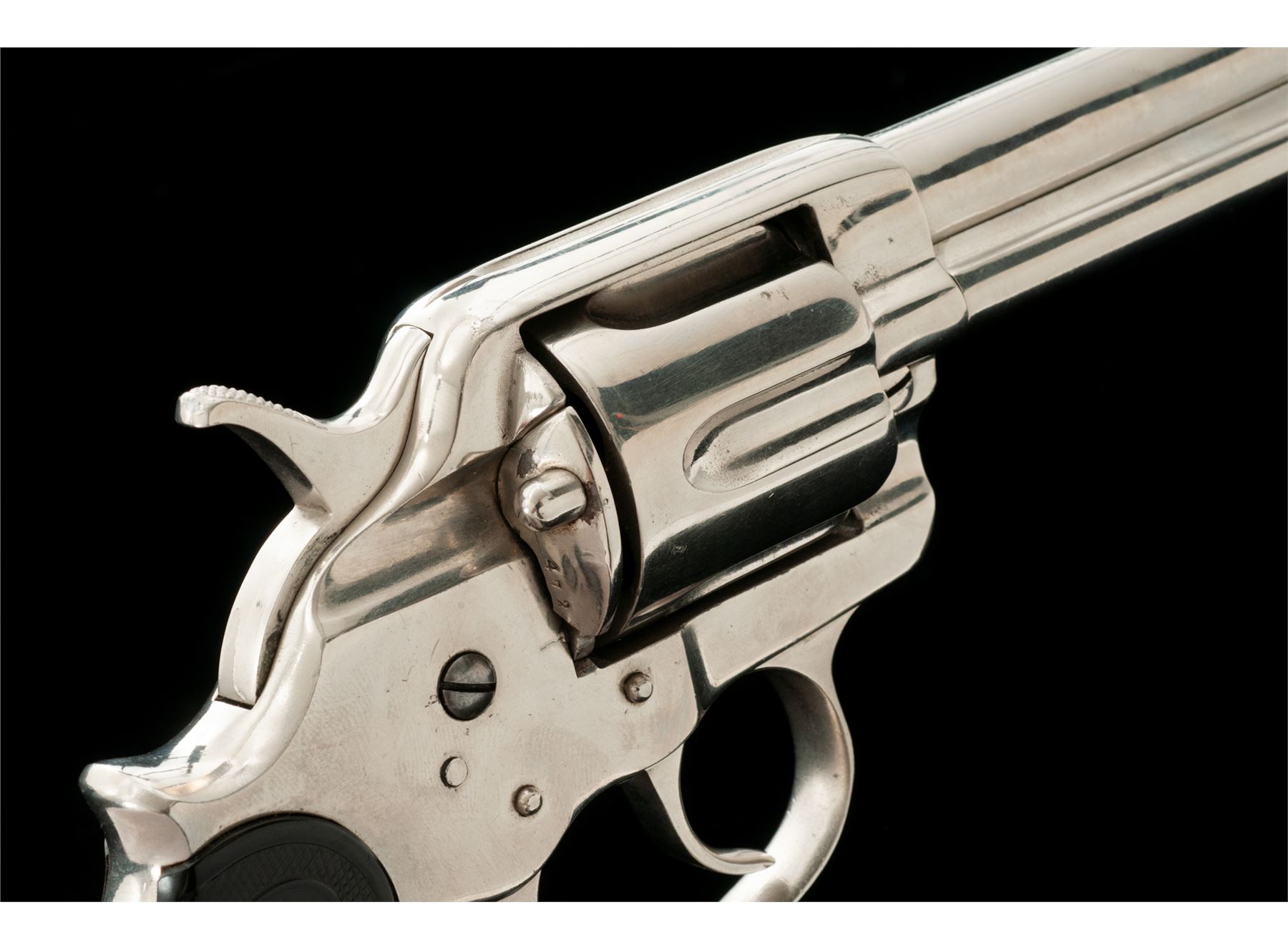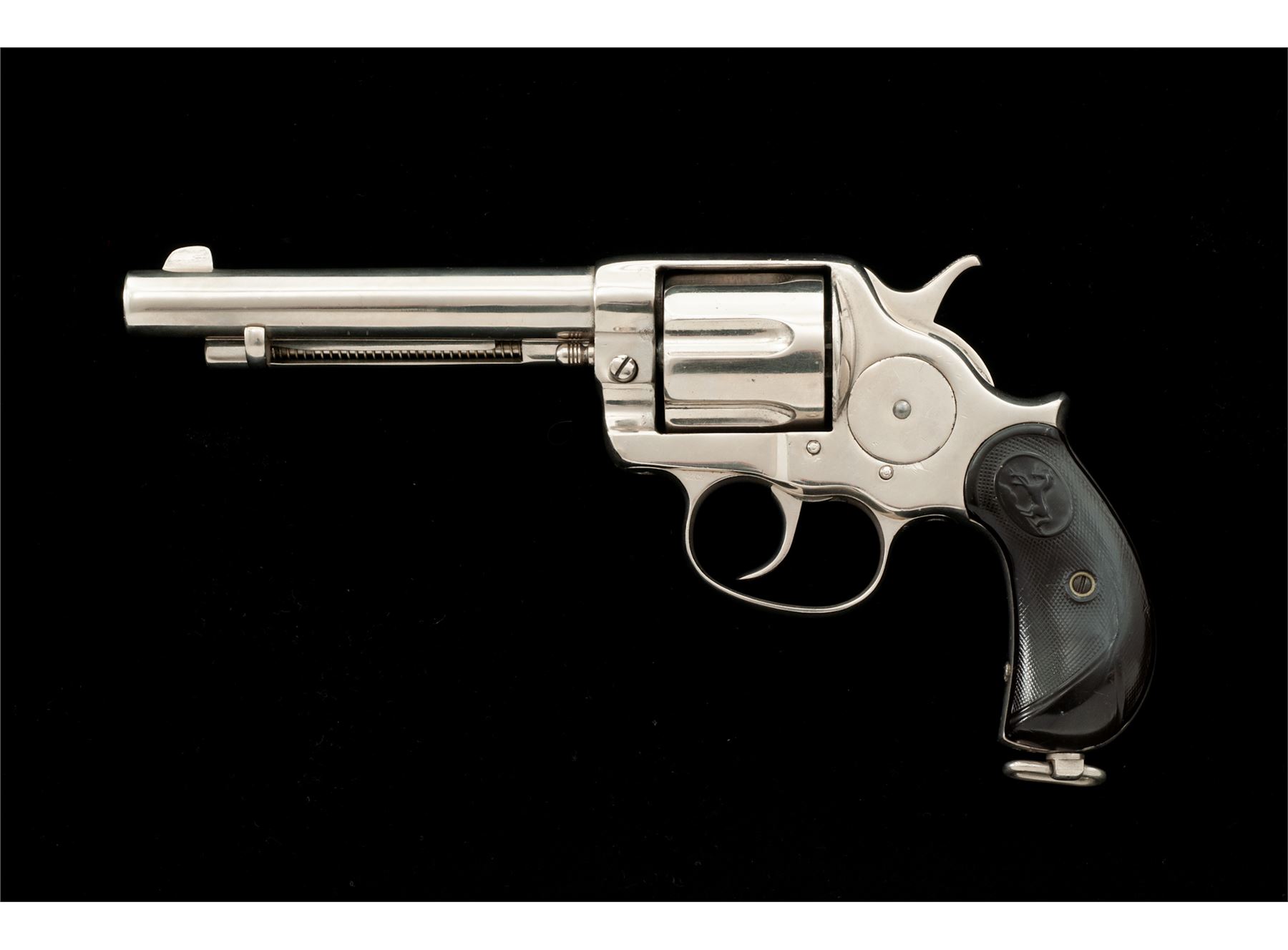 Antique Colt Model 1878 Frontier Double Action Revolver, #11879, .44-40 CF cal., 5.5'' barrel with right-side ejector rod marked on top ''Colt's Pt. F.A. Mfg. Co. Hartford, CT U.S.A.'' in one line; 6-shot long-fluted round cylinder marked ''P'' and ''879'' on rear face between bores; solid frame with integral ''bird's head'' gripstraps and a lanyard loop at butt; right-side hinged loading gate correctly batch-numbered ''472''; loop triggerguard marked ''44 CF'' on left bow; two-piece checkered black hard rubber grips have the ''Rampant Colt'' logo within an oval panel at top. Mfg'd pre-1898. Condition is good, retaining all of a re-plated nickel finish that is smooth and bright; barrel address is soft, other markings sharp. Grips show wear but are smooth and undamaged. Action is smooth and crisp; bore is clean with defined rifling. Est.: $450-$650. (Antique)