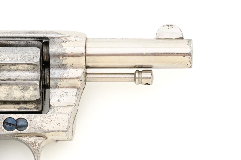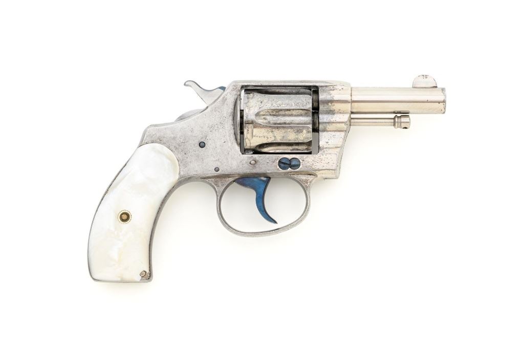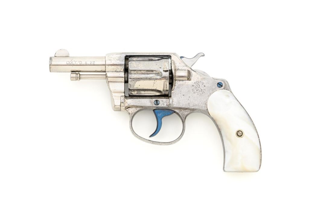 Antique Colt New Pocket Double Action Revolver, #992, .32 Colt cal., 2.5" barrel, nickel finish with nitre blue trigger, hammer and securing screws, two-piece pearl grips, fixed blade front sight, and fixed sighting notch on the frames top strap. Left side of the barrel is marked "COLT. D.A. 32". Left side of the frame with Rampant Colt surrounded by "COLTS" and "NEW POCKET". Top of the barrel is marked in three-lines with Colts information and patent dates. Mfgd 1894. Overall condition is very good, retaining approx. 45% original finish, with the balance gone to an even gray patina, with areas of mild pitting. Nitre bluing is strong and may have been redone. There is an old chip missing from the right grip at the bottom front corner. Otherwise, both show typical signs of age. Factory lettering is clear. Action functions well. Bore with a few areas of very mild erosion, rifling is very good. Est.: $300-$500. (Antique)