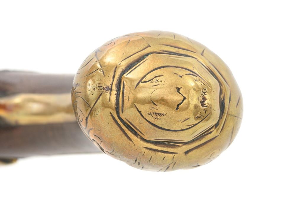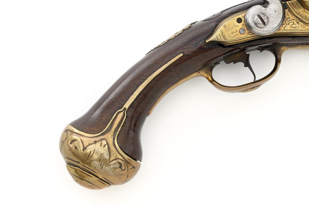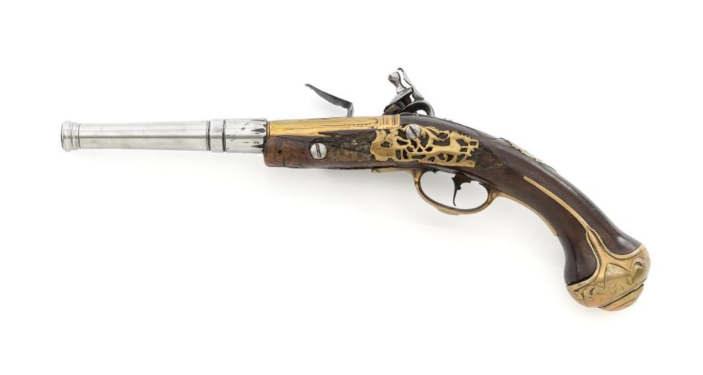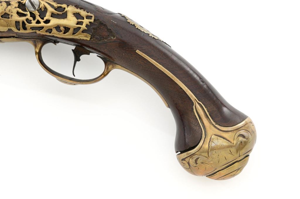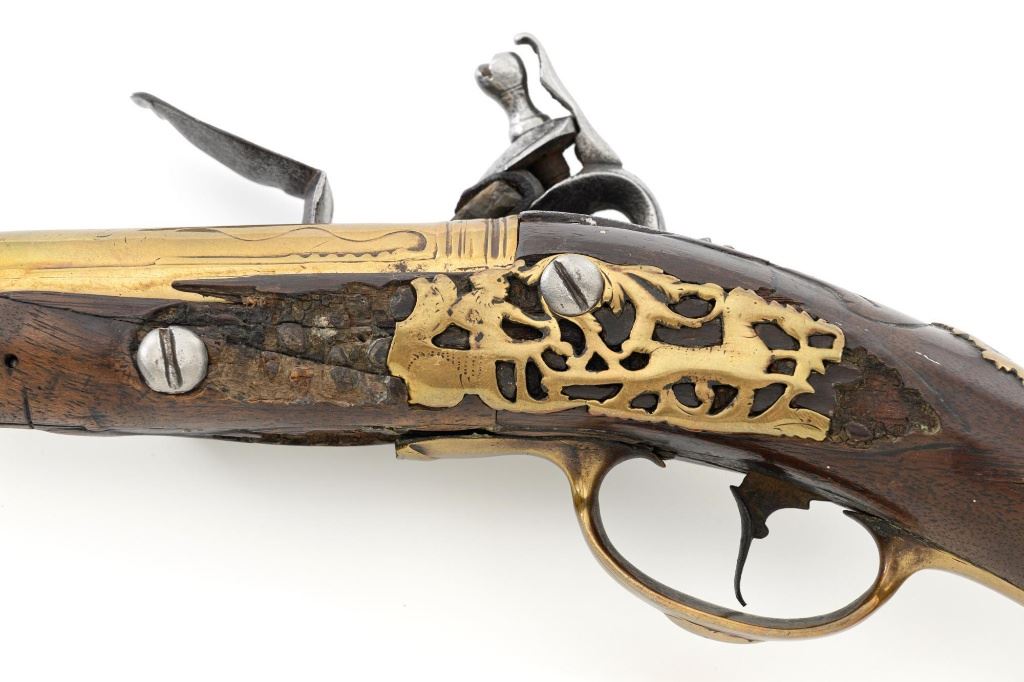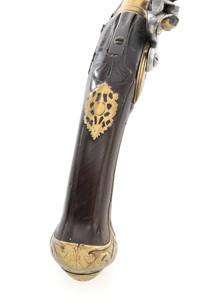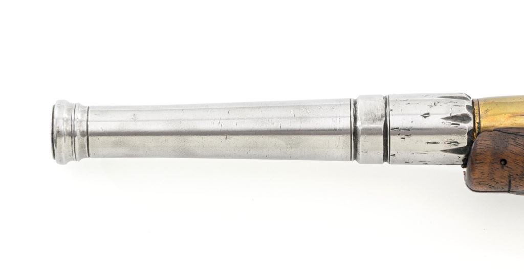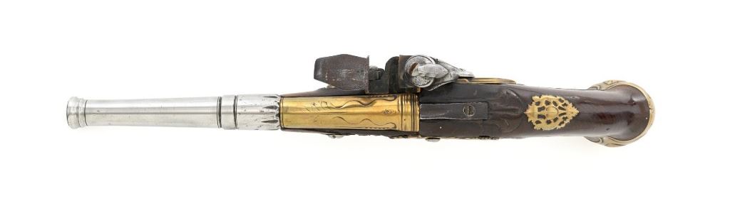 Antique Dutch Flintlock Pistol, #NVSN, .54 cal., 9" rifled cannon barrel with bright finish to the front 5.5" of the barrel, remaining 3.5" is brass. Hammer, trigger, and striker mechanism show a gray patina. Balance of the metal parts are brass, including a decorative seal at the top of the wrist. Stock is carved hardwood and is in fair condition, with an approx. 2" crack on the right side of the forend, plus an approx. 2.5" fissure on the left side of the forend. Back of the lockplate is marked with what appears to be "MIASCNDEP". Metal surfaces rate good overall. Action is working, rifled bore is rough. Est.: $600-$900. (Antique)