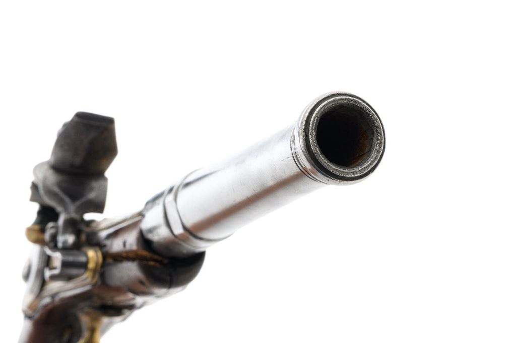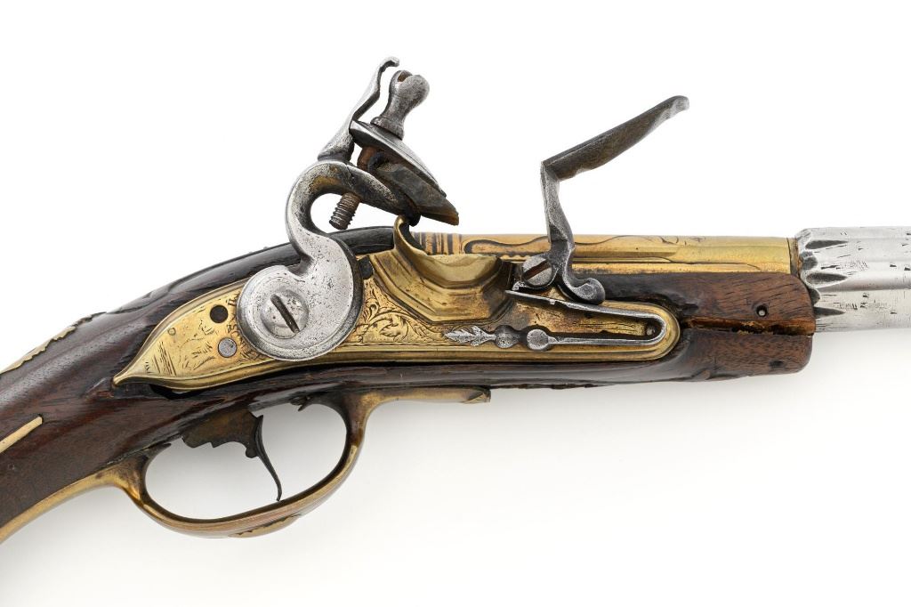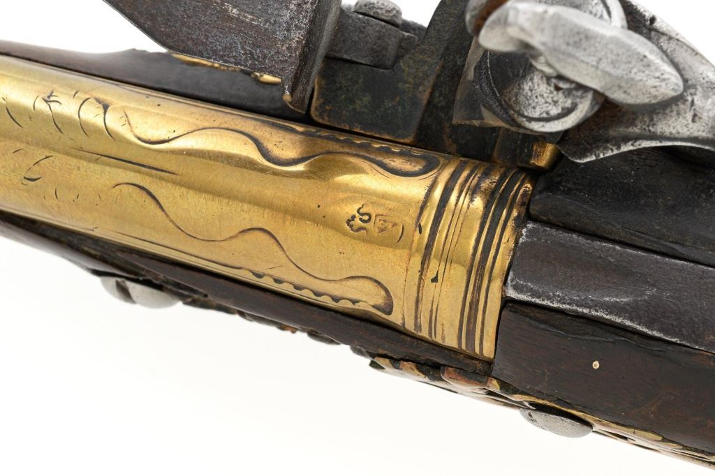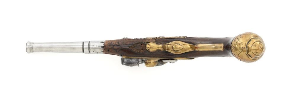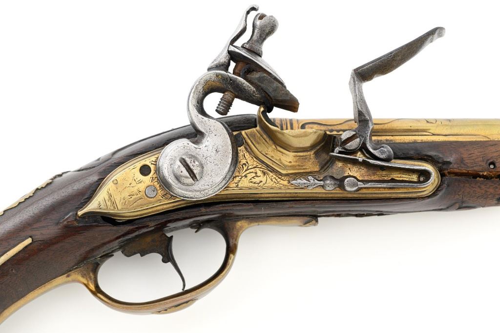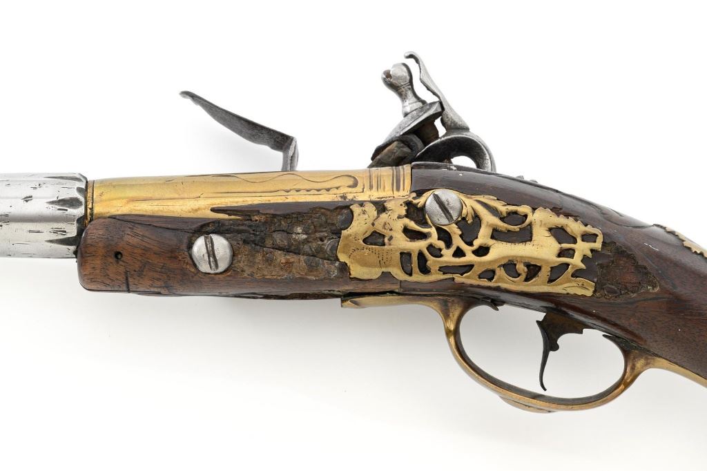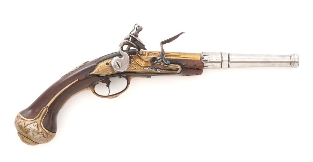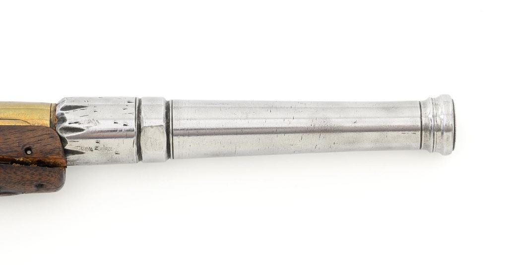 Antique Dutch Flintlock Pistol, #NVSN, .54 cal., 9" rifled cannon barrel with bright finish to the front 5.5" of the barrel, remaining 3.5" is brass. Hammer, trigger, and striker mechanism show a gray patina. Balance of the metal parts are brass, including a decorative seal at the top of the wrist. Stock is carved hardwood and is in fair condition, with an approx. 2" crack on the right side of the forend, plus an approx. 2.5" fissure on the left side of the forend. Back of the lockplate is marked with what appears to be "MIASCNDEP". Metal surfaces rate good overall. Action is working, rifled bore is rough. Est.: $600-$900. (Antique)