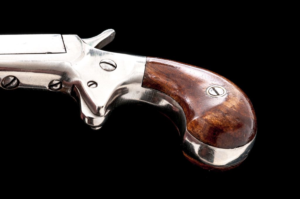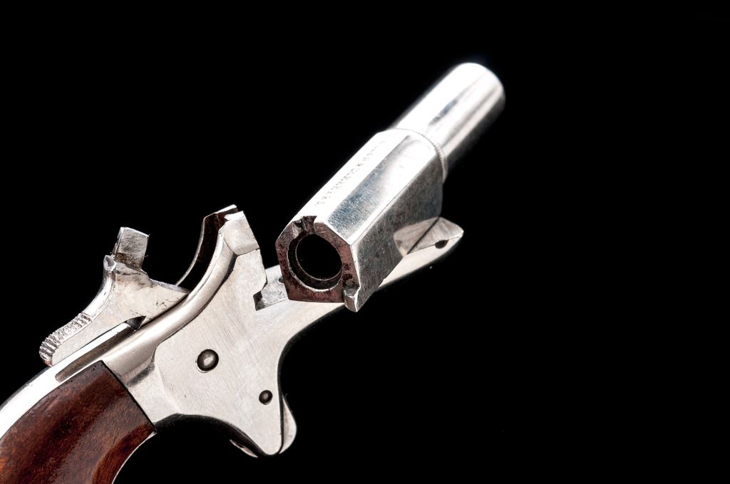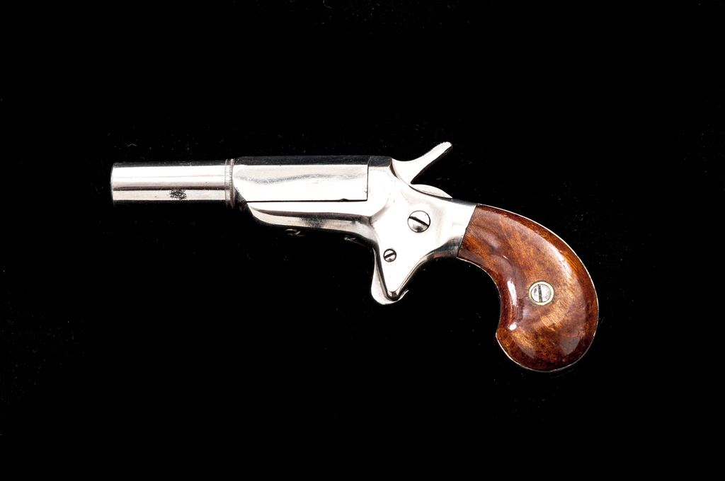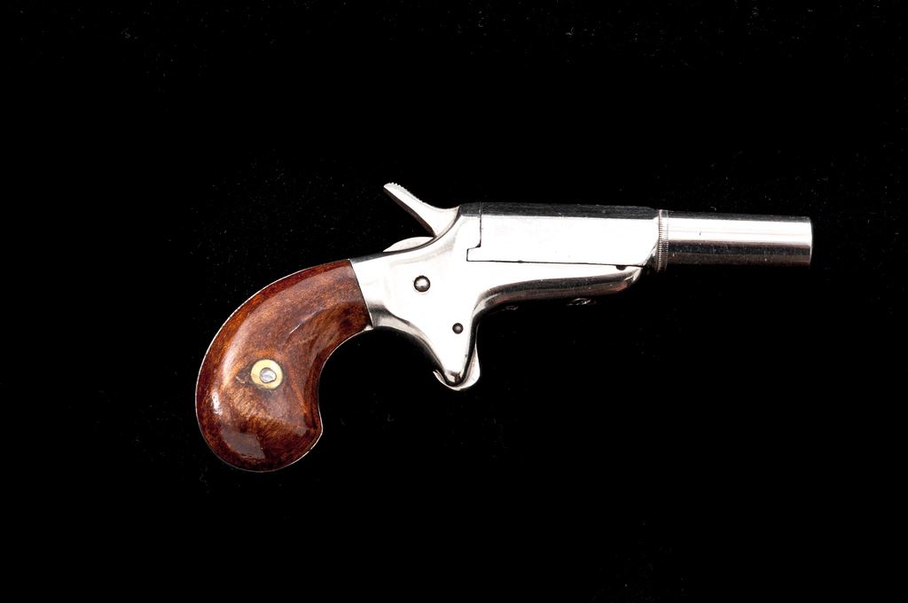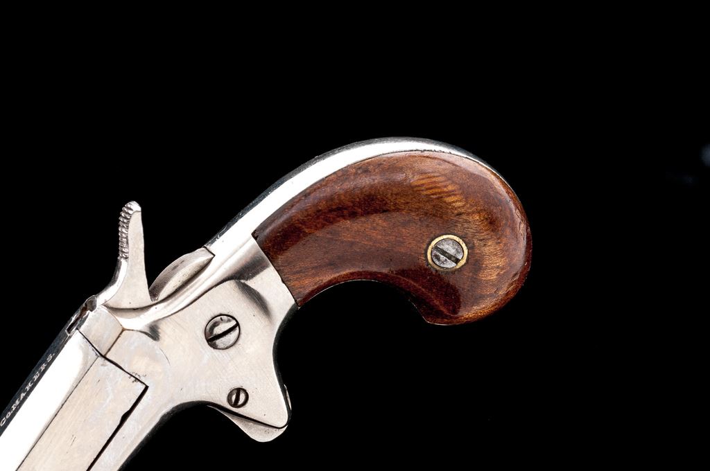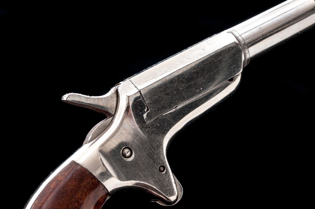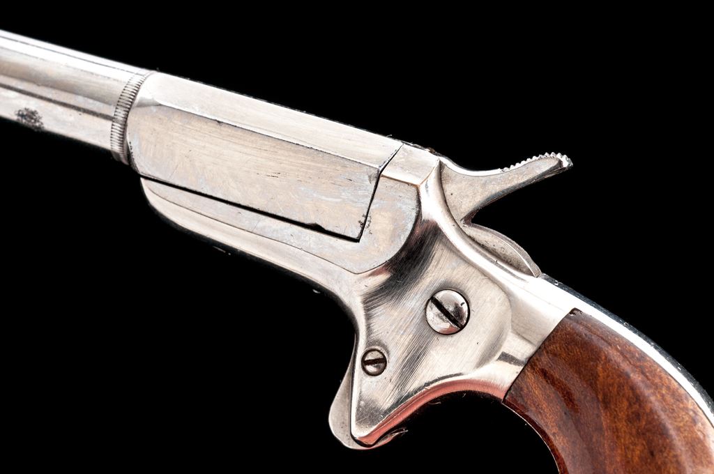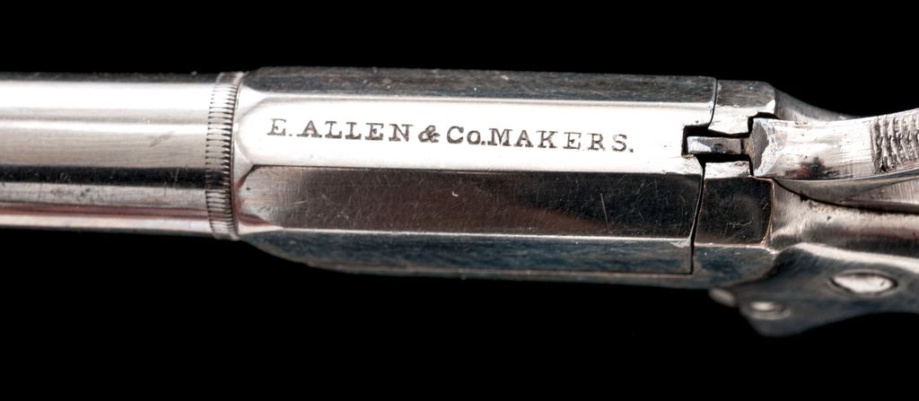 Antique E. Allen & Co. ''Vest Pocket'' Single Shot Spurtrigger Derringer, #26487, .22 RF cal., 2.25'' round-to-octagonal barrel has a tiny knurled ring at juncture and no sights, pivots right for loading/extraction, marked ''E. Allen & Co. Makers'' on top flat; frame with integral spurtrigger sheath and ''bird's head'' grip straps two-piece varnished walnut grips. Mfg'd ca. 1869-71, originally with full nickel-plate finish. Condition is excellent retaining approx. 97% original smooth and bright nickel, with one 1/8'' spot at left barrel side. Grips shows very light highpoint wear and most original varnish. Action is smooth and tight; smoothbore is bright with very light erosion toward muzzle; barrel hinge is sound. Est.: $600-$800. (Antique)*