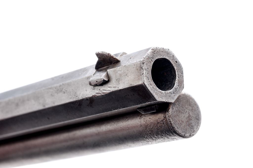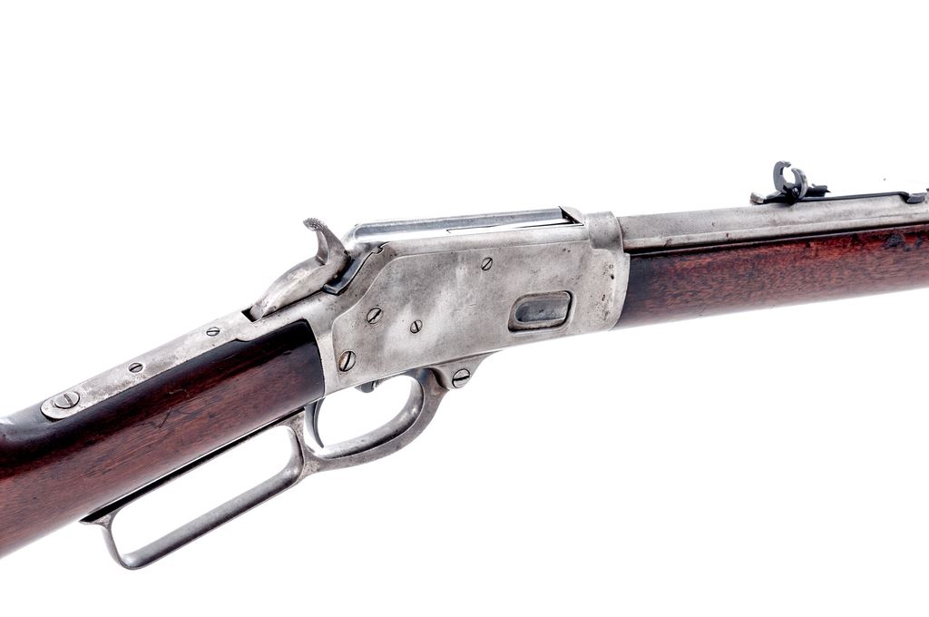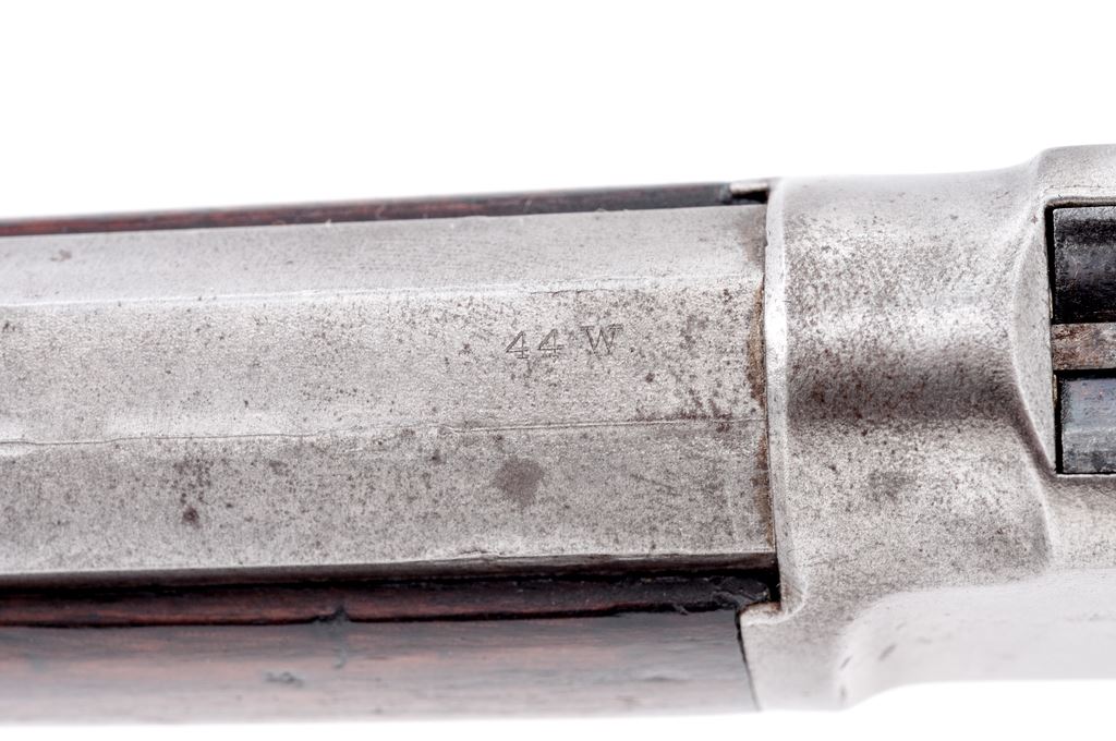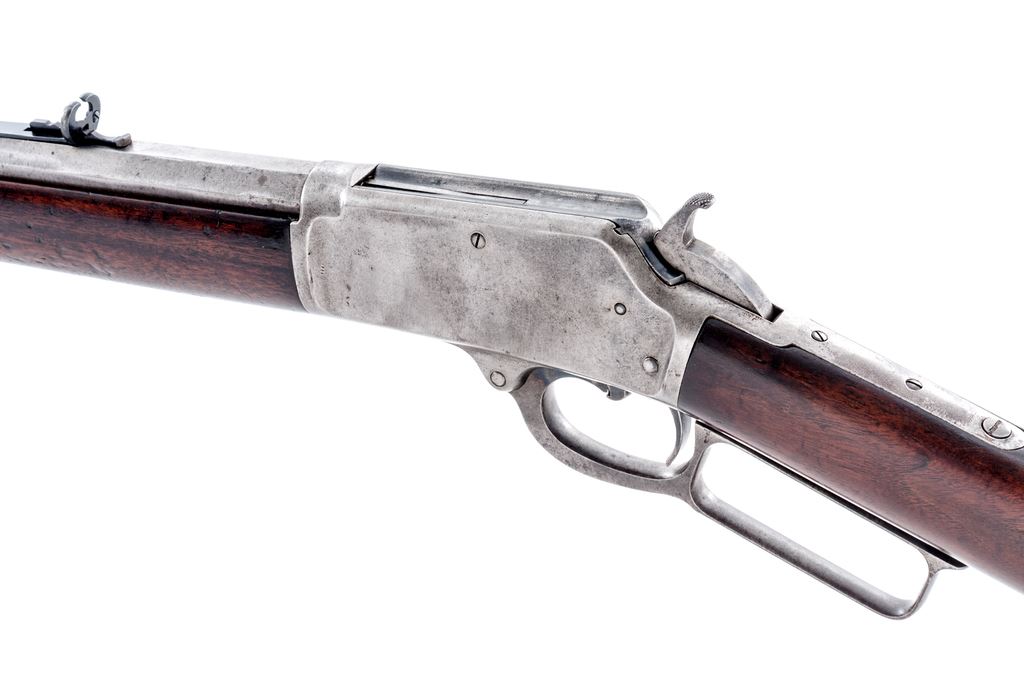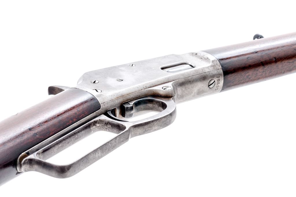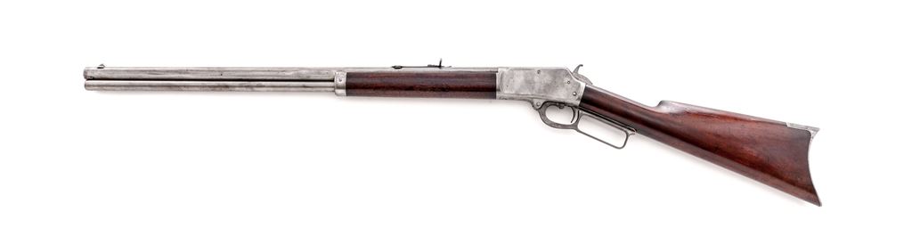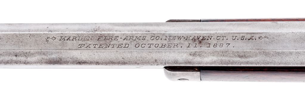 Antique Marlin Model 1888 Lever Action Rifle, #19680 (very early 1st year production, as numbers began with #19559), .44 W (.44-40) CF cal., 24'' octagonal barrel with dovetailed blade front and buckhorn-style rear sights, marked with maker's name, address and 1887 patent date on top flat; 13-round mag tube; receiver with early top ejection. Originally in blued finish, with case hardened hammer, loop operating lever, and crescent buttplate; oil-stained walnut forend and buttstock. Mfg'd 1888. Condition is very good. Metal shows no original finish but is smooth gunmetal gray. Stocks are sound with only minor use/handling marks, nice grain and color, and perhaps an added coat of finish. Action is smooth; bore is lightly etched but clean with distinct rifling. Est.: $750-$1,000. (Antique)*