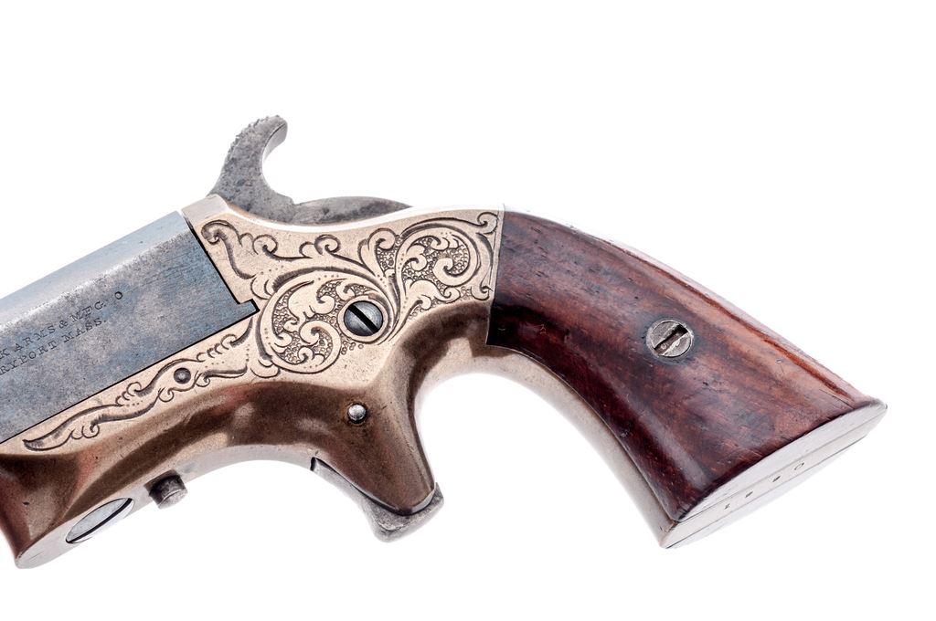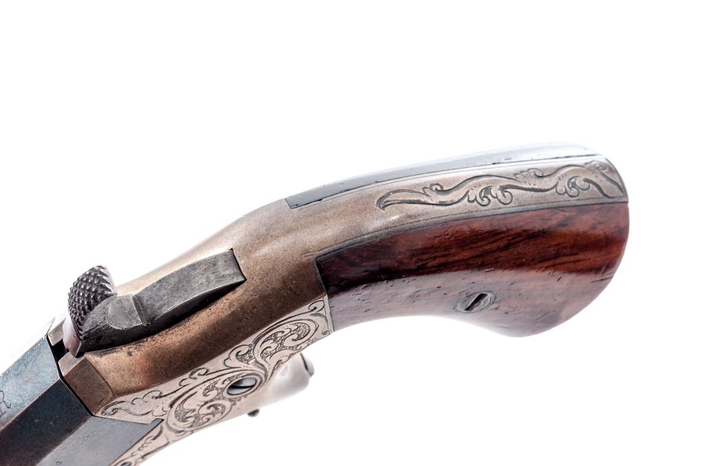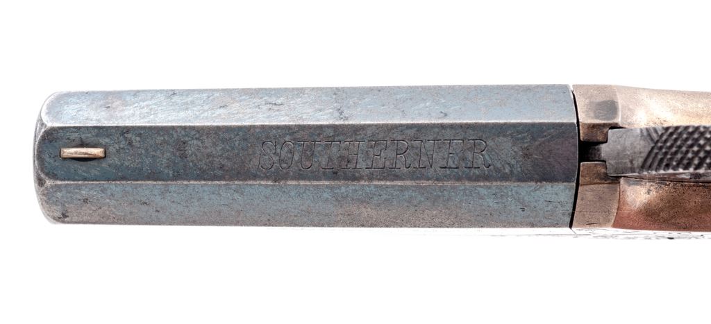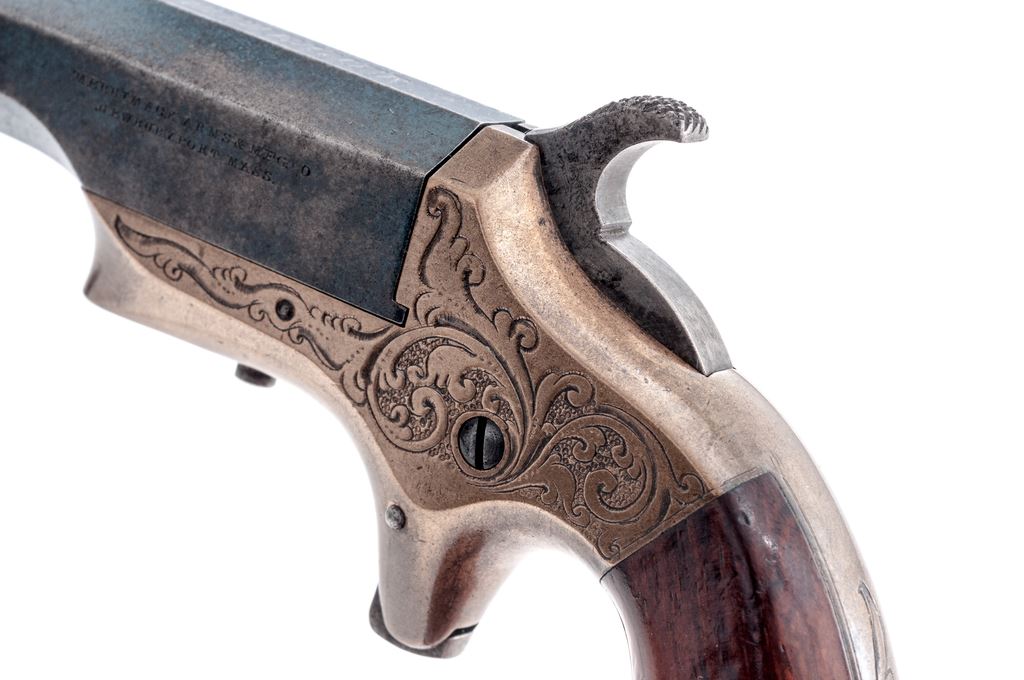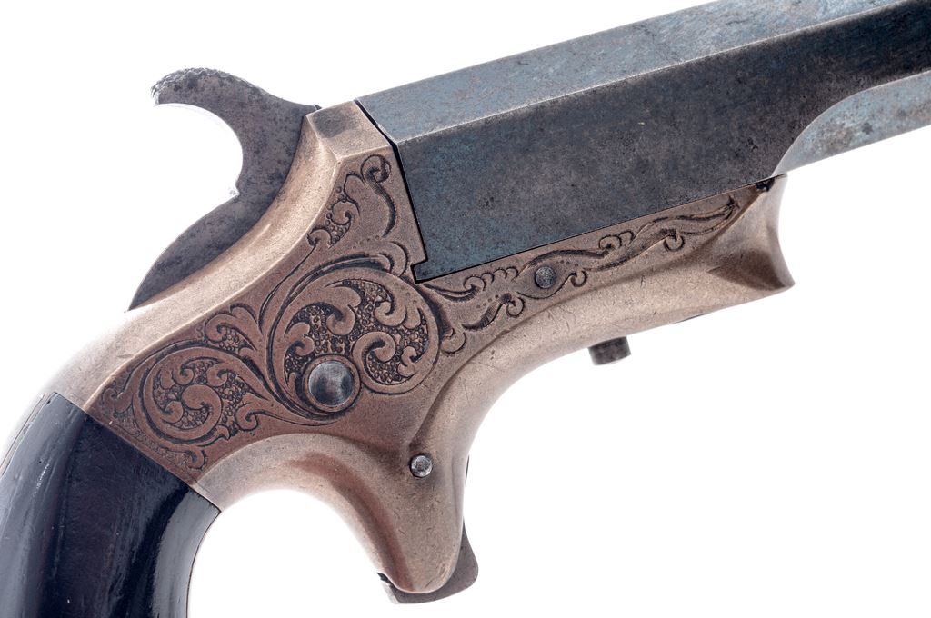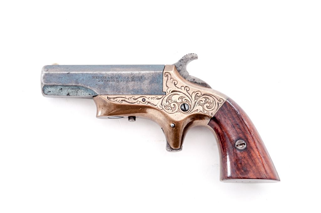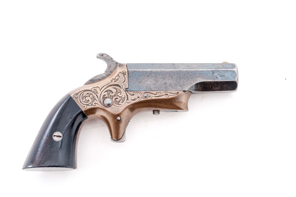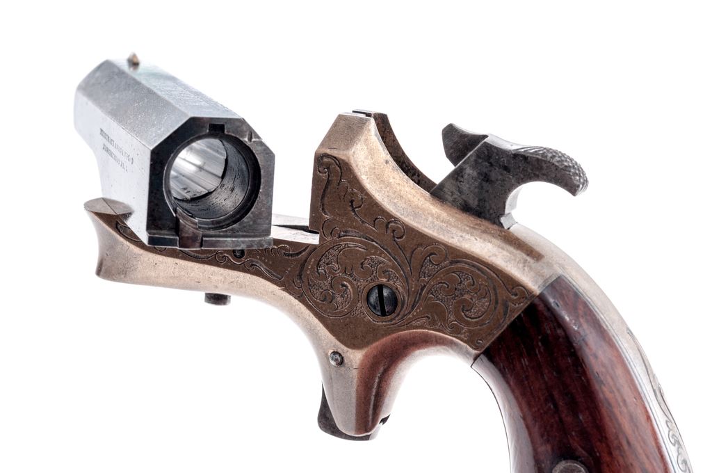 Antique Merrimack Arms Co. ''Southerner'' Spurtrigger Derringer, #1990, .41 RF cal., blued 2.5'' octagonal barrel with a tiny blade front sight, marked ''Southerner'' on top and ''Merrimack Arms & Mfg. Co./Newburyport, Mass.'' on left side, pivots sideways for cartridge loading/auto extraction; brass (or bronze) frame with integral spurtrigger sheath and grip straps, is engraved in floral scrolls on both sides and marked ''1990'' on butt; two-piece varnished rosewood grips. Mfg'd 1866-69, originally with blued barrel and silver-plated frame. Condition is very good. Barrel retains approx. 50% smooth original blue; frame is smooth lightly-toned brass with sharp engraving, edges and markings; grips are sound with light edge wear and perhaps added finish. Action is tight and smooth; bore is bright with one spot of etching and sharp rifling; barrel hinge is sound. Southerner derringers are seldom found engraved and in this nice condition. Est.: $600-$800. (Antique)