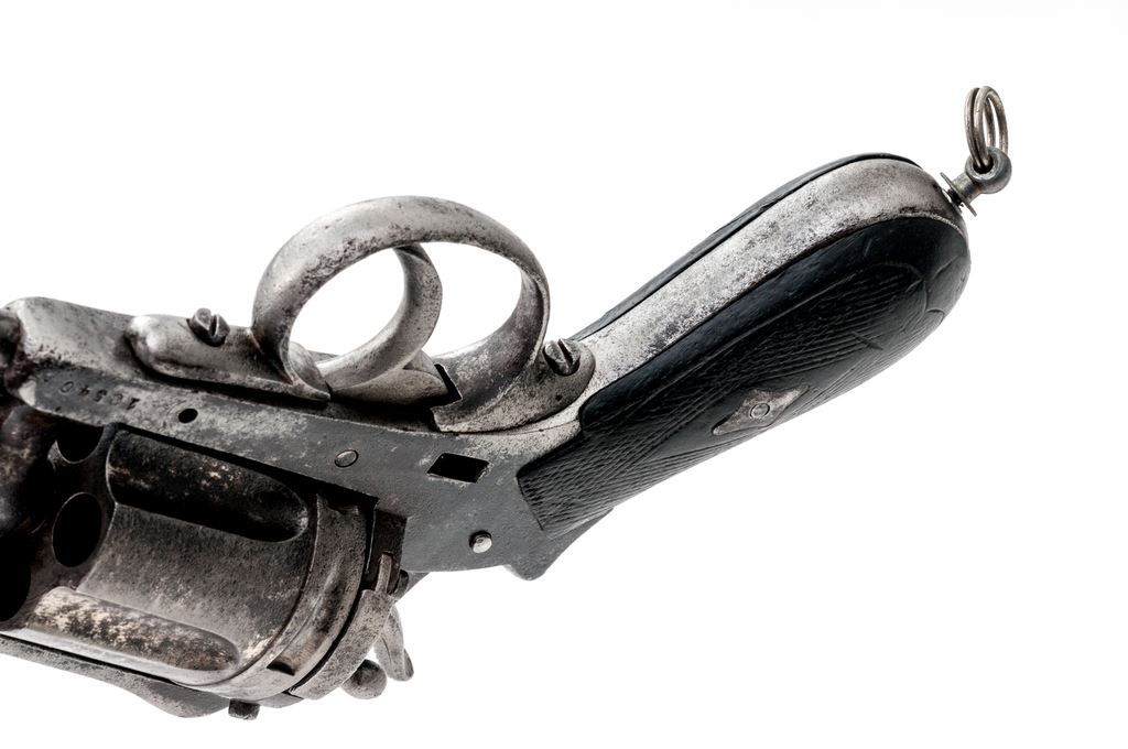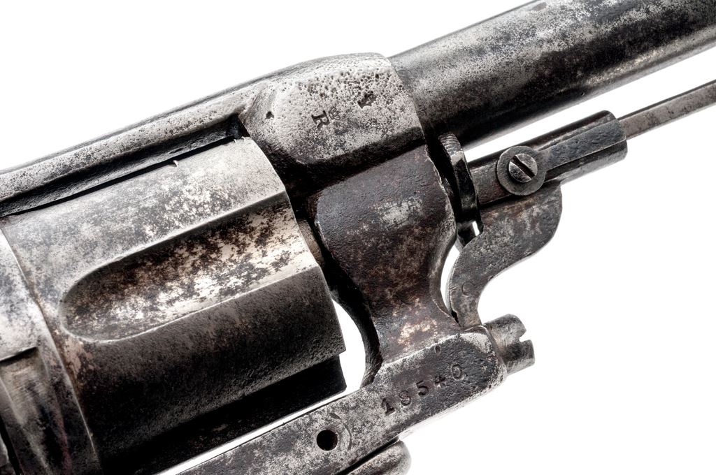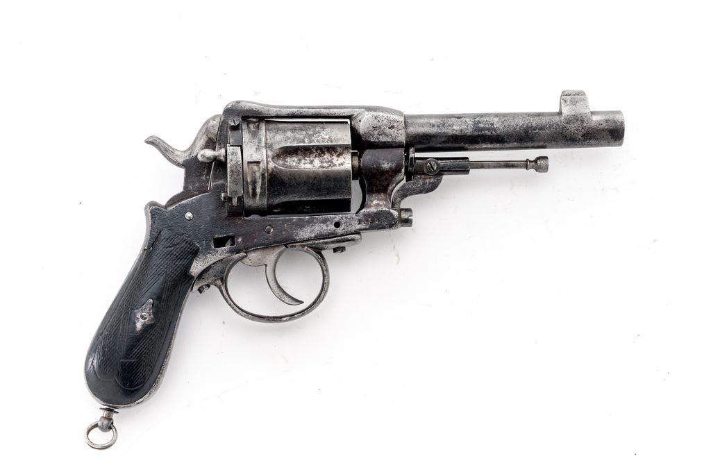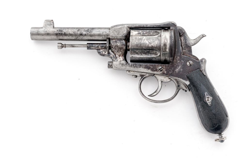 Antique Montenegrin Model 1870 Gasser Double Action Military Revolver, by Leopold Gasser of Wien, Austria, #18540, 11.2mm CF cal., 5" round barrel has tall bead front sight and hinged ejector rod assembly (marked "48"); fluted 5-shot round cylinder (marked "48") has long lead-in slots; solid frame marked "(crown)/NI" (King Nicholas I of Montenegro) at top strap, "L. Gasser/Wien/Patent/Neu Modell" over "(apple pierced by an arrow)" over "Guss Stahl" (cast steel) at left lug, "(star)/Y", "(crown/R" and "18540" right lug, has right-side hinged loading gate, separate loop trigger guard, integral bag-shaped gripstraps with lanyard ring at butt, 2-pc. checkered walnut grips. Mfg'd ca. 1880s. Condition is good retaining no original finish, being overall gunmetal gray with scattered erosion, dings and mostly legible markings. Grips show much wear to checkering; lanyard ring replaced. Action functions single-action only but does not turn cylinder; bore shows general light erosion and very good rifling. Est.: $700-$900. (Antique)
