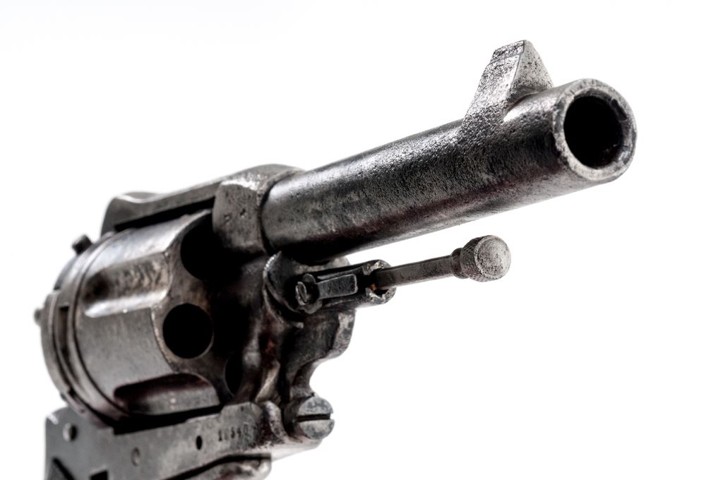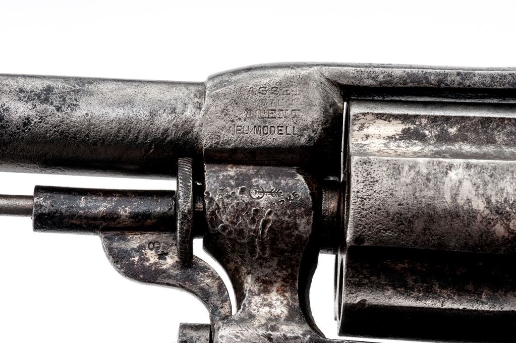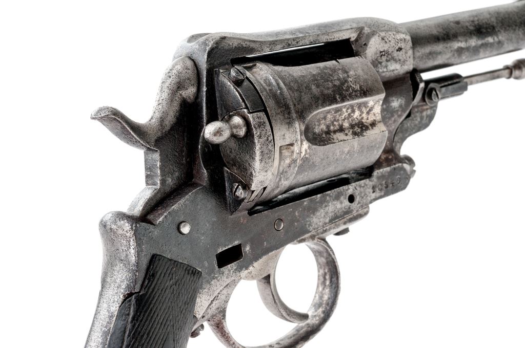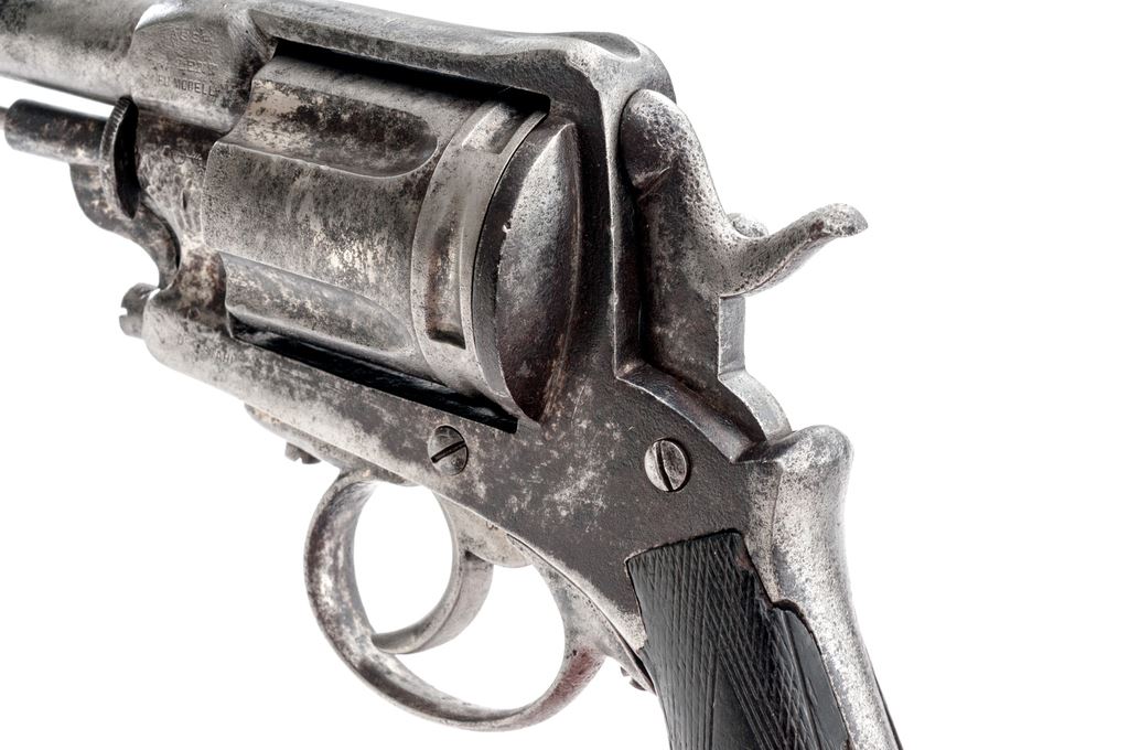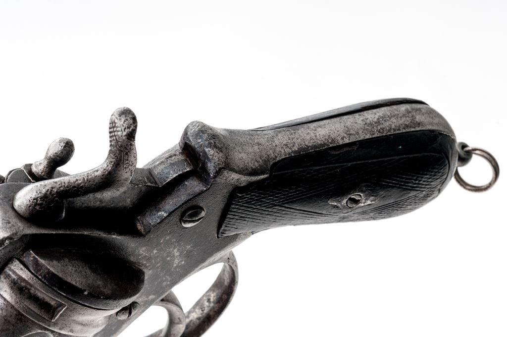 Antique Montenegrin Model 1870 Gasser Double Action Military Revolver, by Leopold Gasser of Wien, Austria, #18540, 11.2mm CF cal., 5" round barrel has tall bead front sight and hinged ejector rod assembly (marked "48"); fluted 5-shot round cylinder (marked "48") has long lead-in slots; solid frame marked "(crown)/NI" (King Nicholas I of Montenegro) at top strap, "L. Gasser/Wien/Patent/Neu Modell" over "(apple pierced by an arrow)" over "Guss Stahl" (cast steel) at left lug, "(star)/Y", "(crown/R" and "18540" right lug, has right-side hinged loading gate, separate loop trigger guard, integral bag-shaped gripstraps with lanyard ring at butt, 2-pc. checkered walnut grips. Mfg'd ca. 1880s. Condition is good retaining no original finish, being overall gunmetal gray with scattered erosion, dings and mostly legible markings. Grips show much wear to checkering; lanyard ring replaced. Action functions single-action only but does not turn cylinder; bore shows general light erosion and very good rifling. Est.: $700-$900. (Antique)