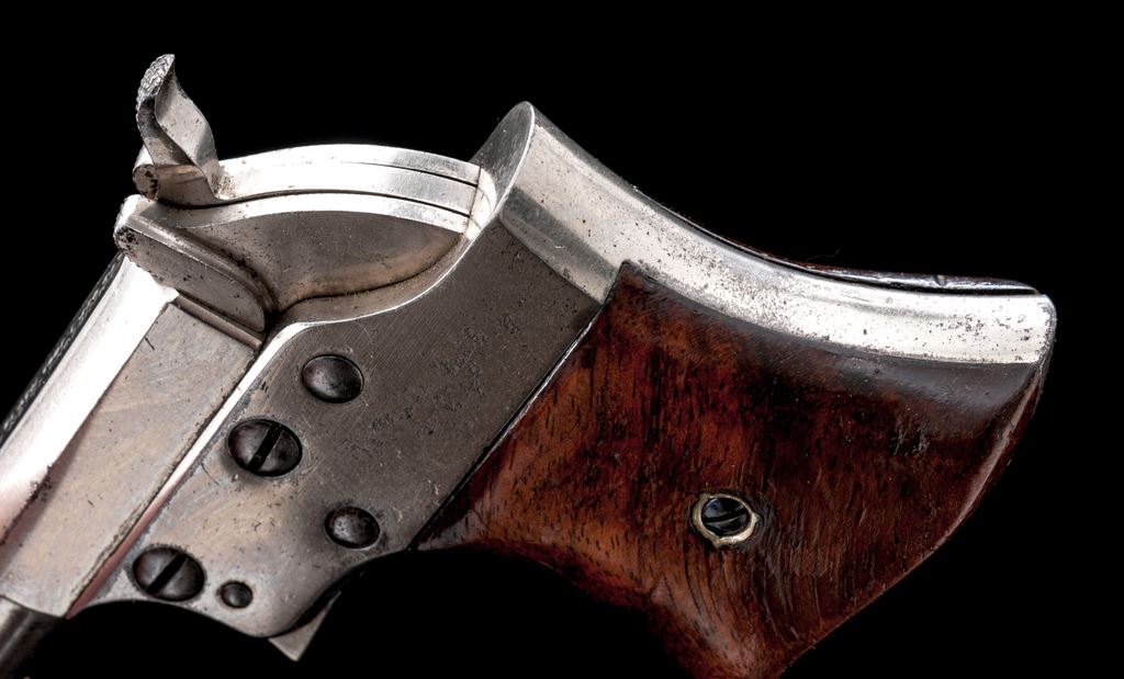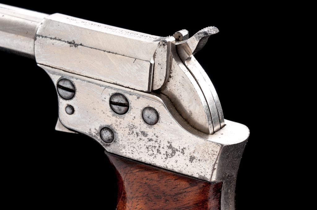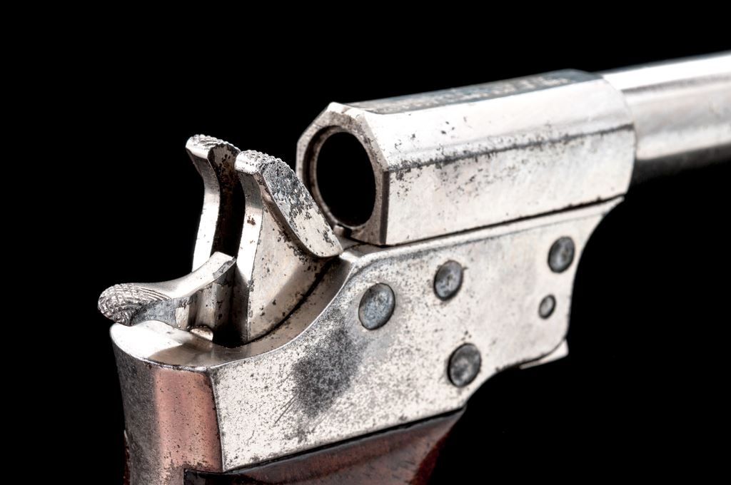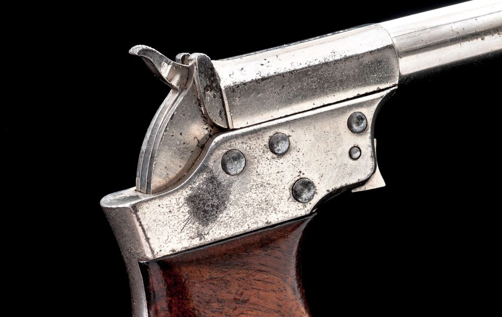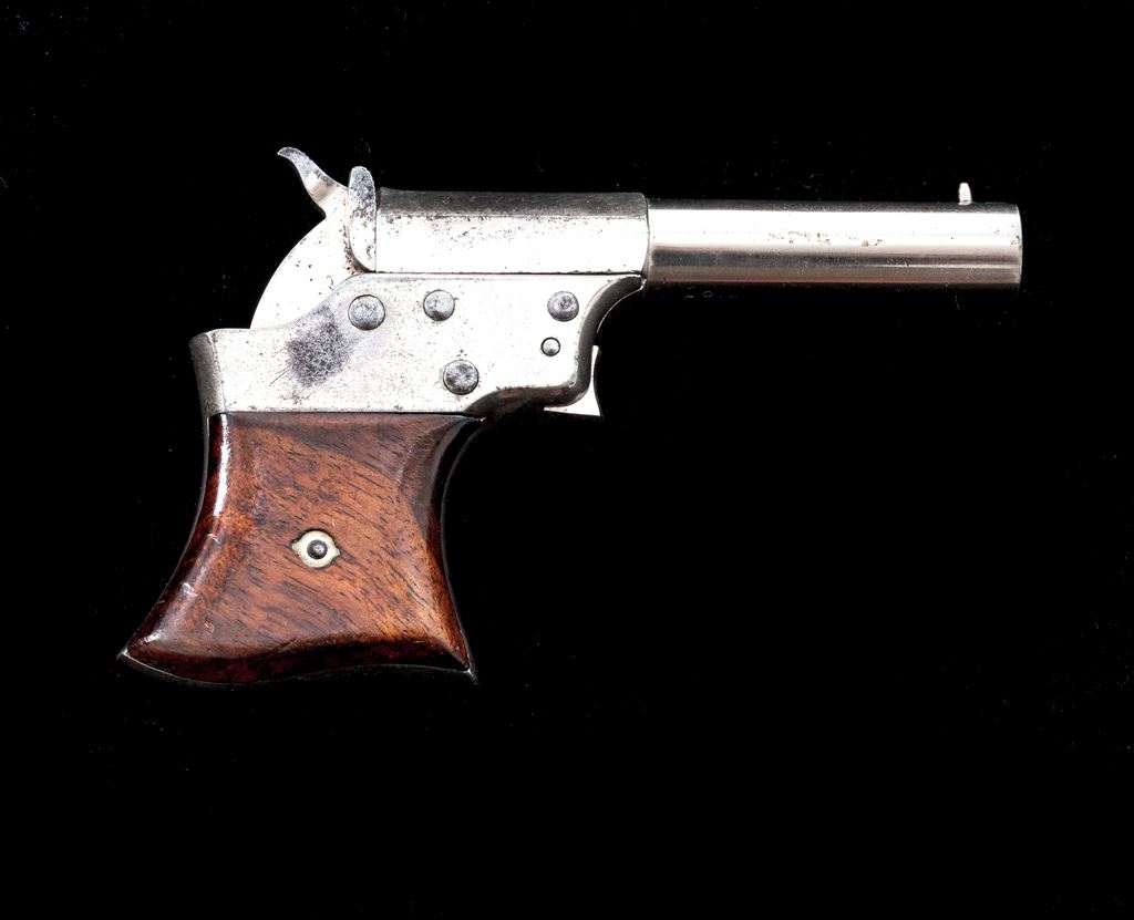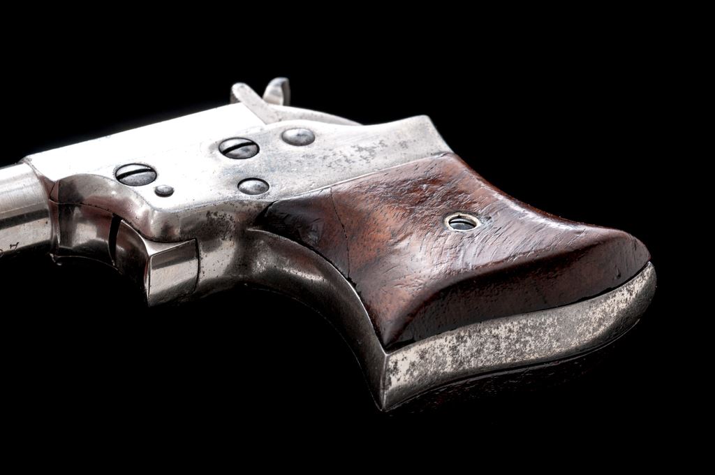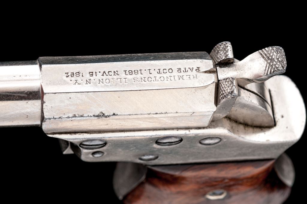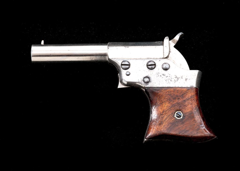 Antique Remington Vest Pocket Single Shot Spurtrigger Derringer, #4107, .41 RF cal., 3.75'' round-to-octagonal barrel with pin front sight, marked with maker's name, address and 1861-64 patent dates in two lines on top flat; No. 3 size frame with unique hinged ''split breech'', auto extraction, central hammer, and integral spurtrigger sheath and gripstraps; varnished two-piece rosewood grips. Mfg'd ca. 1865-88, originally with full nickel-plated finish. Condition is very good. Metal surfaces retain approx. 85% bright original nickel with a quarter-inch patch missing on right frame and discoloration/minor finish etching to hammer and frame, split breech and gripstraps, light knackering to butt. Grips are sound and smooth with a later coat of linseed oil. Action is smooth; bore is clean with light etching and pronounced rifling. Est.: $600-$900. (Antique)