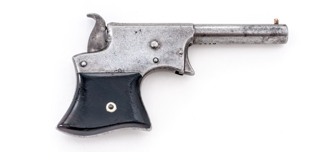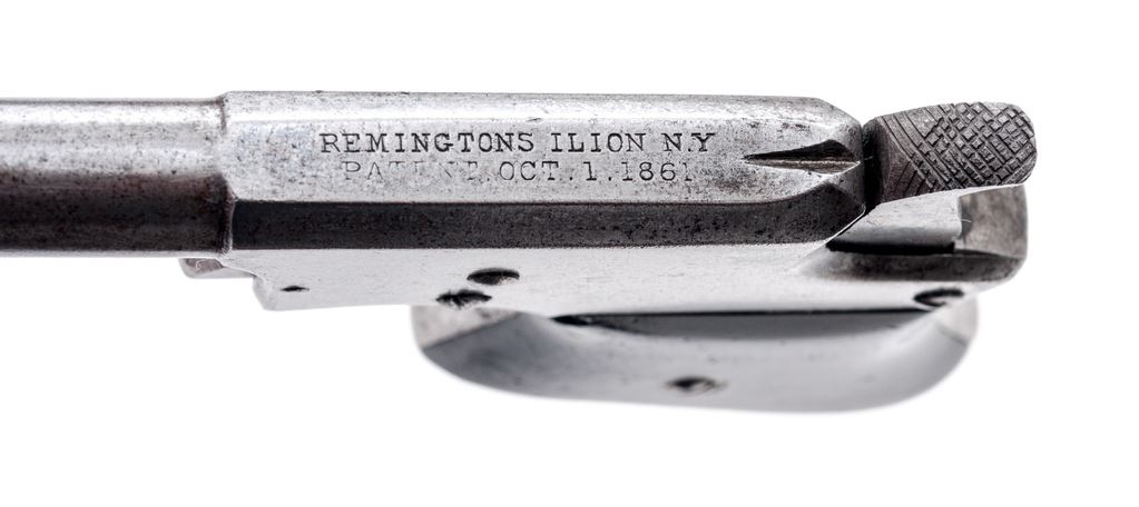 Antique Remington ''Vest Pocket'' Single Shot Spurtrigger Pistol, with two-piece box, #8418, .22 RF cal., 3.25'' round-to-octagonal barrel with pin front sight, marked with maker's name, address and 1861 patent date on top flat; ''No. 1'' size frame with central hammer, integral spurtrigger sheath and ''saw handle'' gripstraps; varnished two-piece walnut grips. Mfg'd ca. 1865-88. Condition is very good. Metal surfaces retain no original finish but are smooth gunmetal gray. Grips are sound and smooth with most original finish. Action is crisp; bore is clean with fine rifling. Modern two-piece pasteboard box has a reproduction Remington label inside its lid, another on bottom, and is in fine condition. Est.: $350-$650. (Antique)*