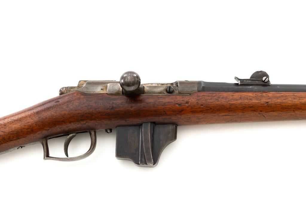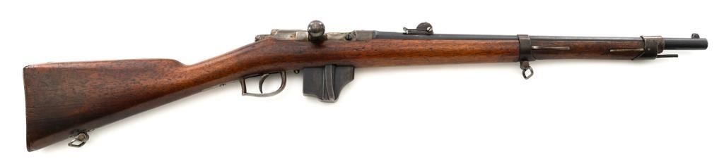 Antique Shortened Dutch M1871/88 Beaumont-Vitali Bolt Action Rifle, #NVSN, 11x52Rmm cal., 20.5" barrel, blued finish, hardwood stock, dovetailed blade front sight, and adjustable rear sight with "V"-notched groove, graduated to 700 meters. Tip of the steel cleaning rod is broken off. Left side of the receiver is marked "P.STEVENS/MAASTRICHT", with inspection marks and dated "1874" on the barrel shank. There are no markings on the buttstock. Matching part numbers (Z442) on the receiver and bolt assembly. Condition overall is good. Metal shows general thinning and brown toning. Except the barrel, which retains much of the blued finish. Wood is good, showing applied varnish, handling marks, and scratches. Action operates smoothly. There is an area of fouling at the chamber that may clean better, otherwise the bore rates good with defined rifling. Rifle was possibly shortened by the Dutch military for use in the East Indies. Est.: $300-$500. (Antique)