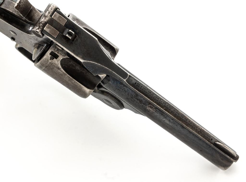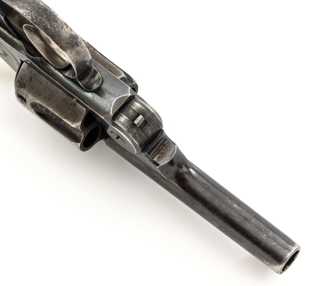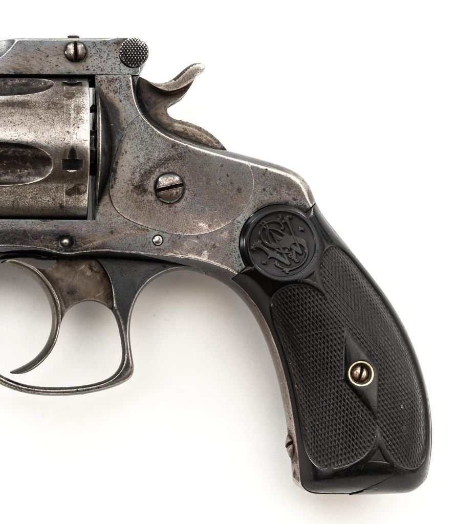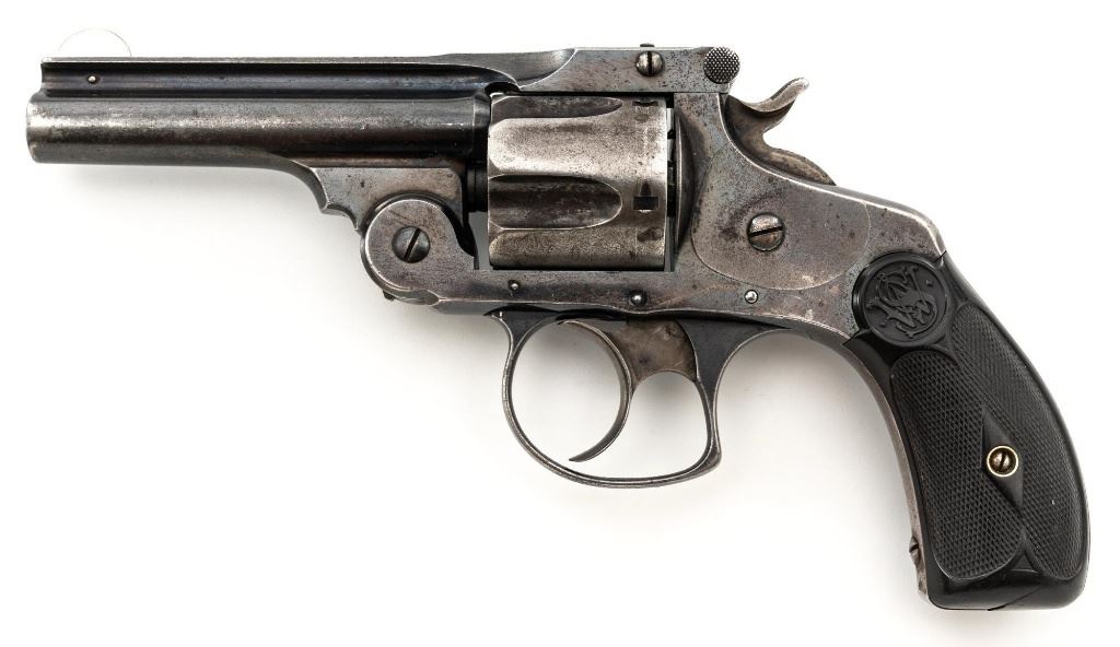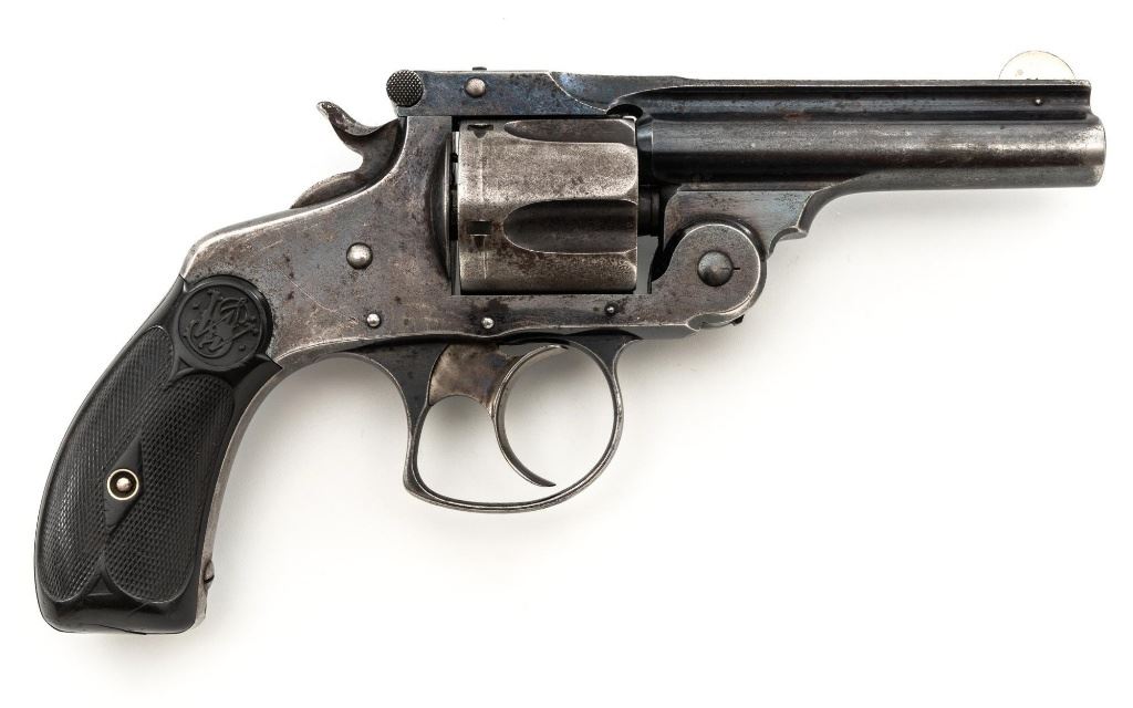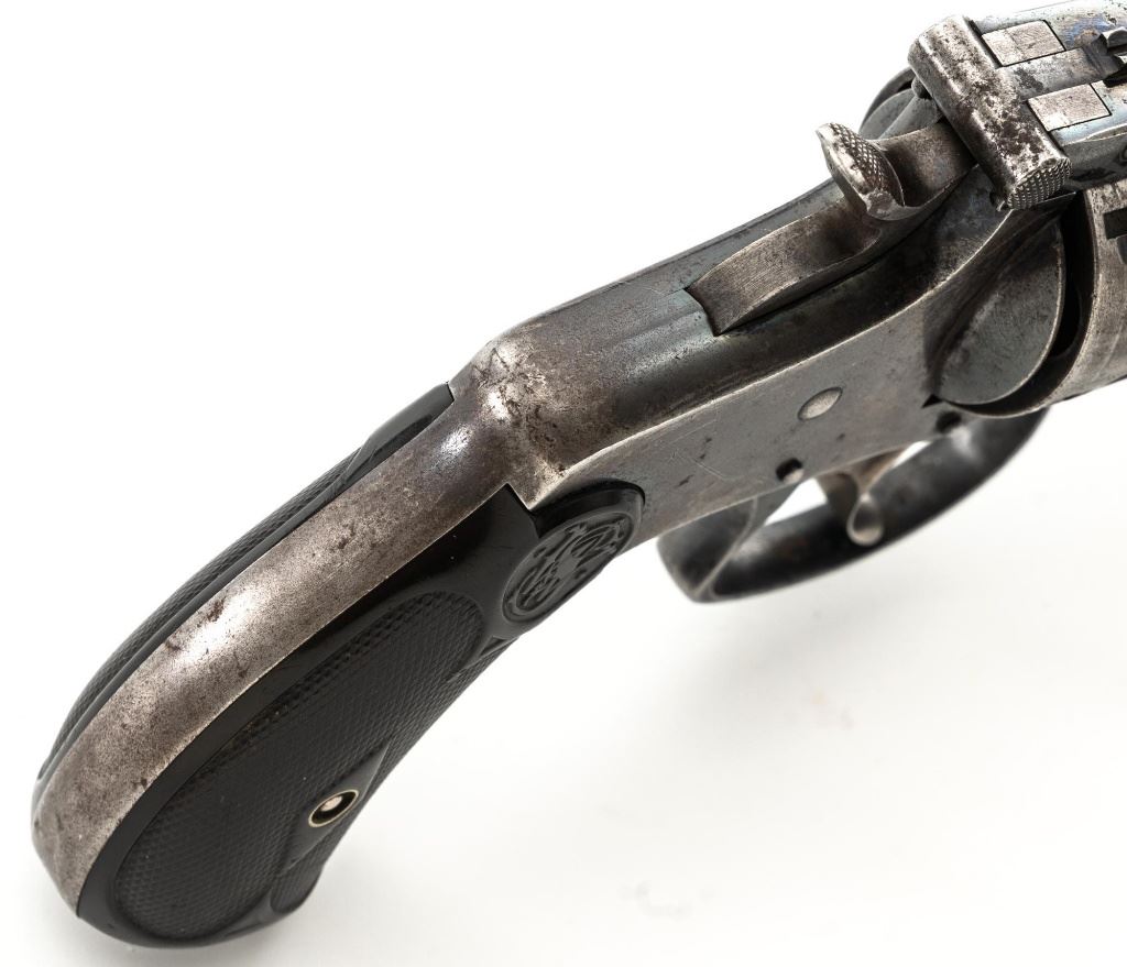 Antique Smith & Wesson .38 Double Action 3rd Model Top Break Revolver, #169037, .38 S&W cal., 3.25" ribbed barrel, blue finish, checkered hard rubber two-piece S&W monogram grips, half-round blade front and fixed "U"-notch rear sights, with 5-shot fluted cylinder, and square back trigger guard. Mfgd circa 1884-1895. Revolver is in very good overall condition, retaining approx. 50%-60% flaking factory finish, with some areas of light surface erosion. Cylinder is mostly gray with traces of original finish in the protected areas. Hammer and trigger show silvered color case hardened finish. Front and backstrap have worn to gray, while the trigger guard retains considerable original finish. Factory markings are clear. Grips have hairline cracks on the bases of both panels and are otherwise very good, showing expected wear and marks. Action functions well and locks up securely. Bore is very good with areas of light erosion and well-defined rifling. Est.: $200-$400. (Antique)