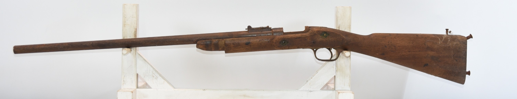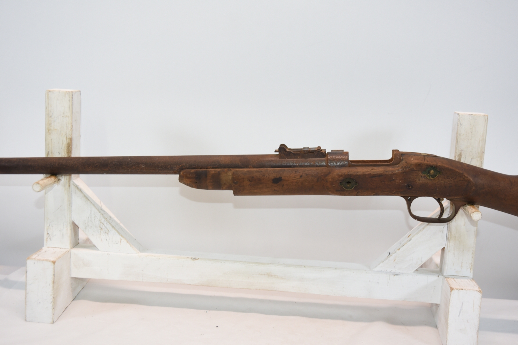 Wood stock shows finish wear, missing forearms sections, barrel bands, shows markings, scratches and scuffs; condition is fair.