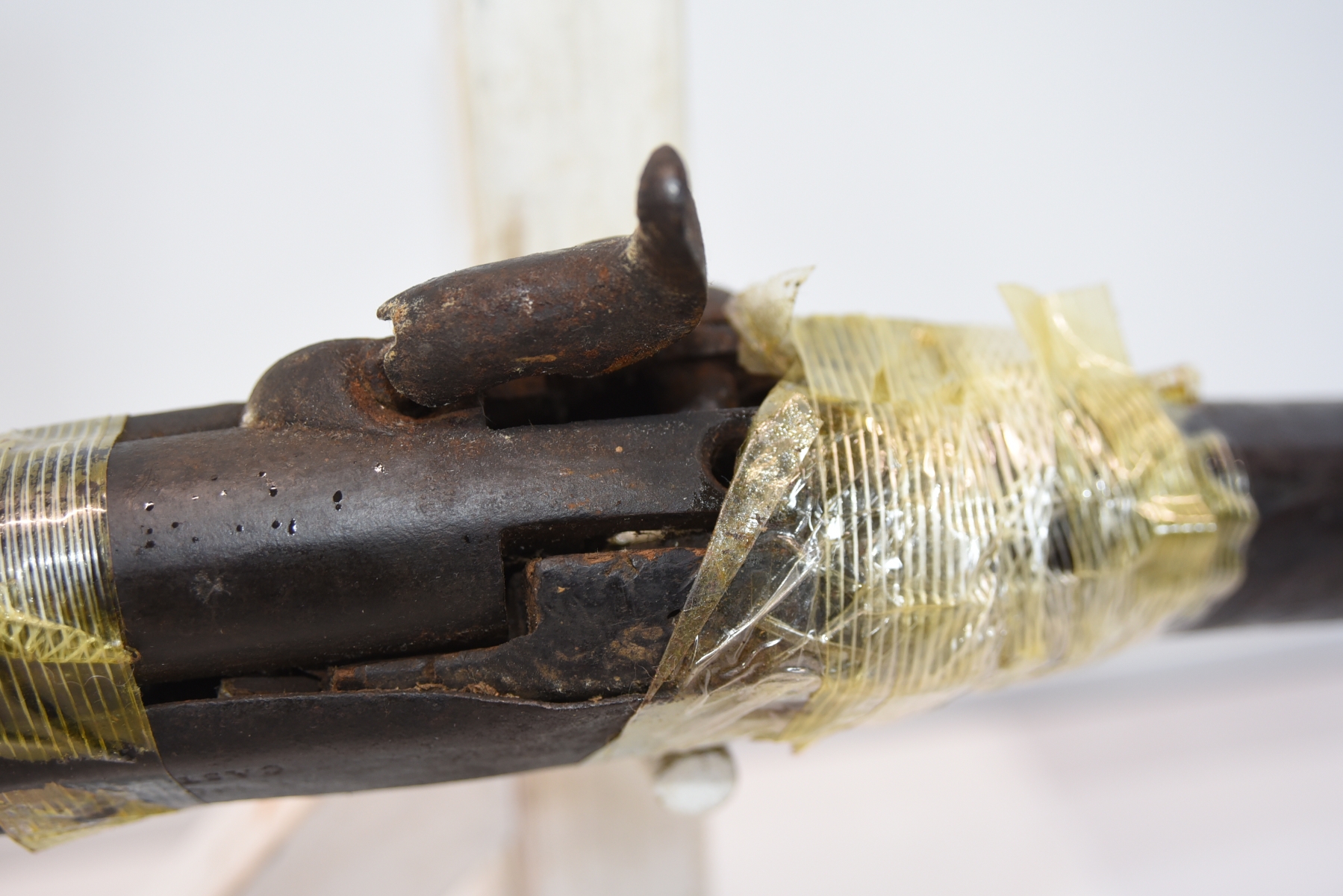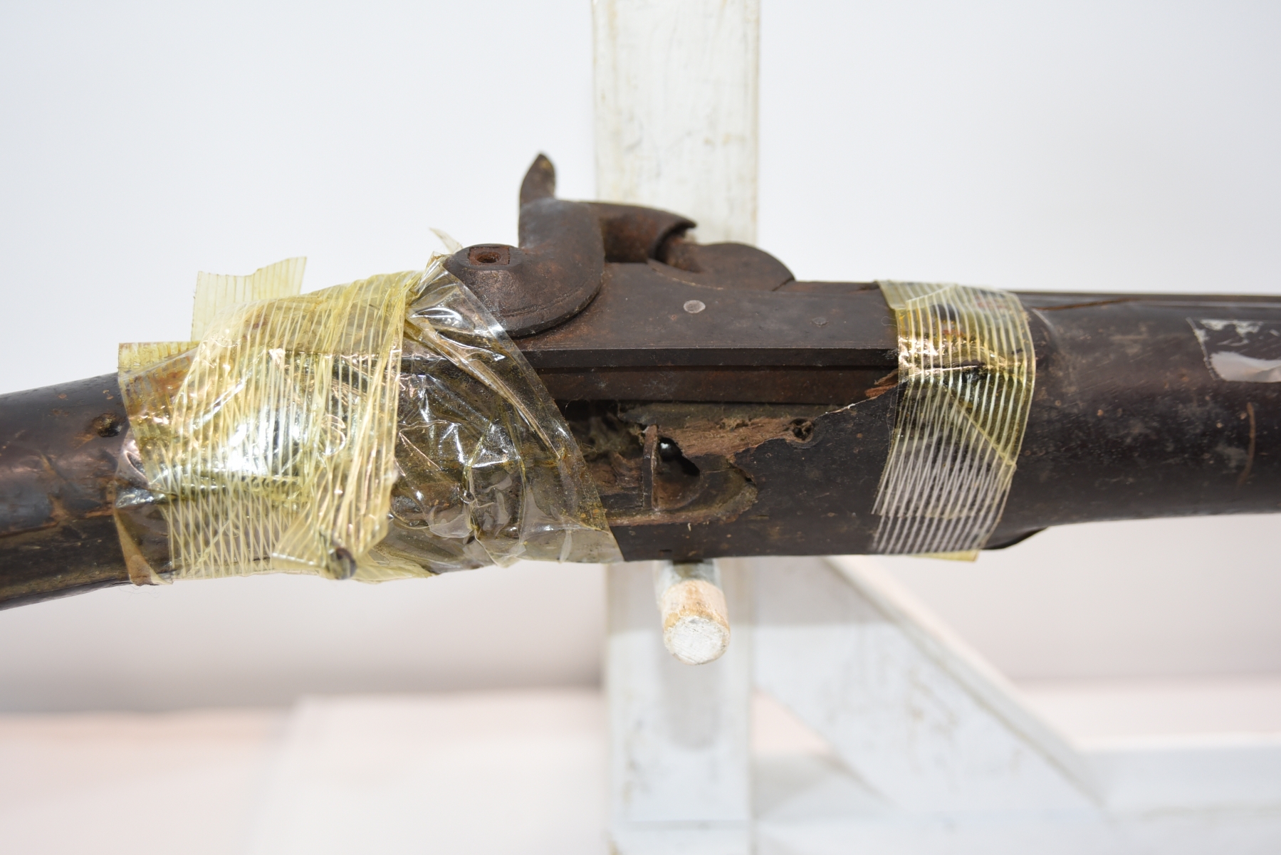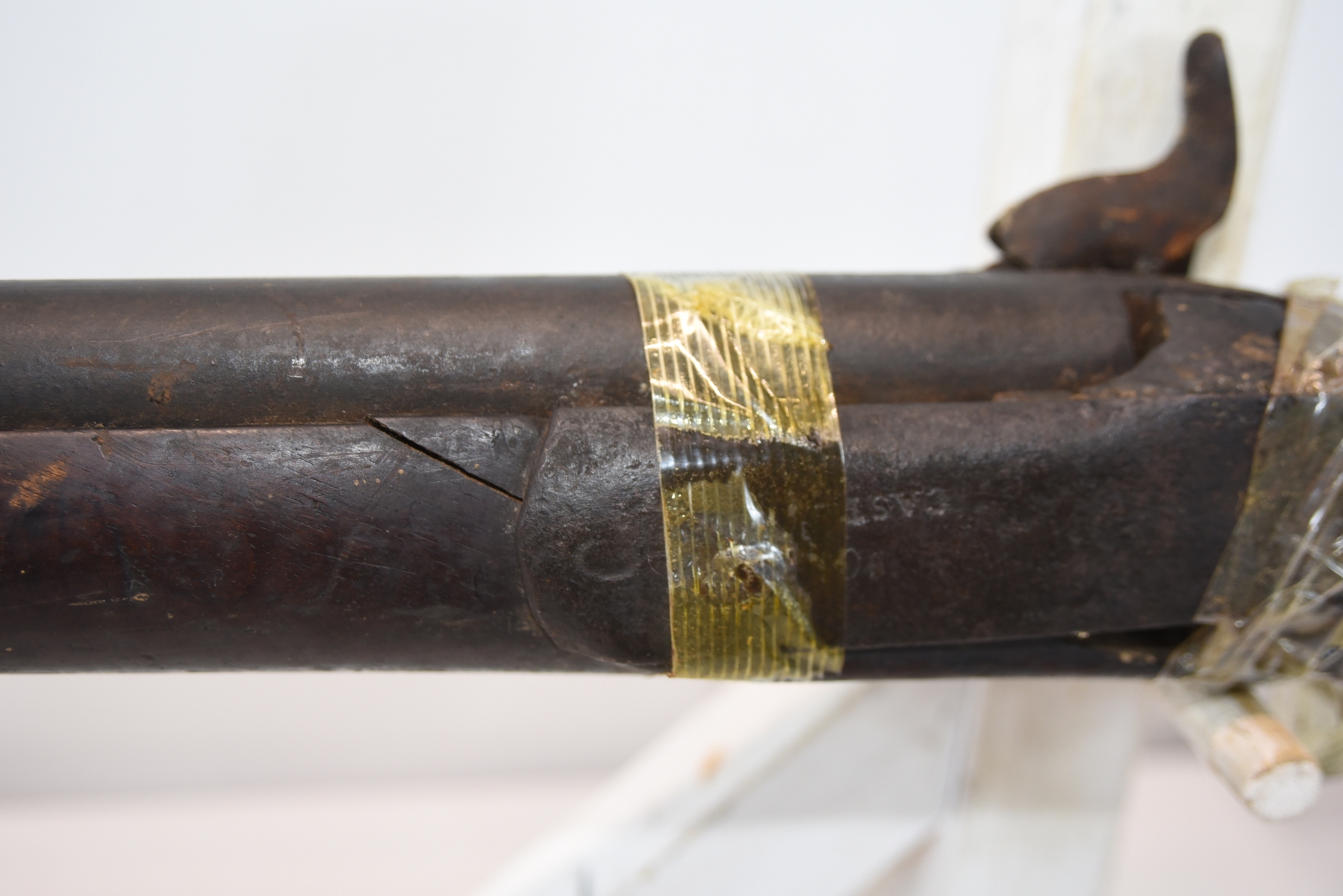 Wood stock is broken in several places with cracks in other, there is tape in the lock plate area; condition is poor.