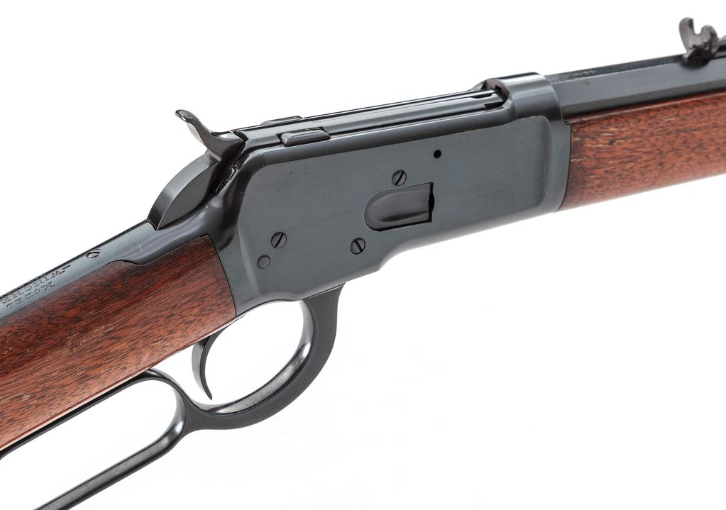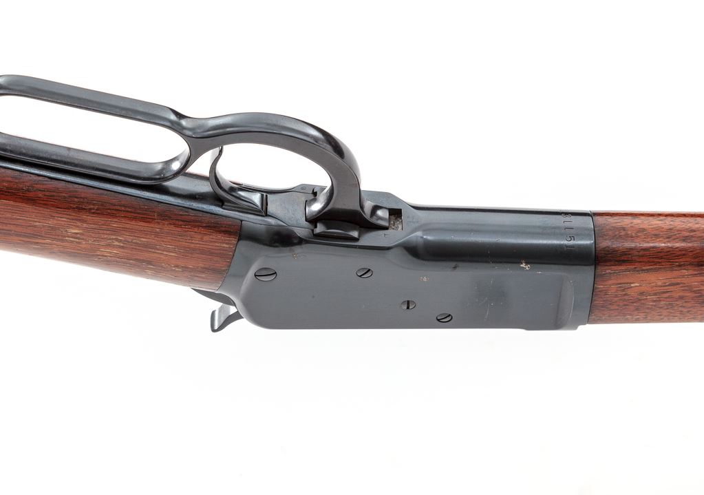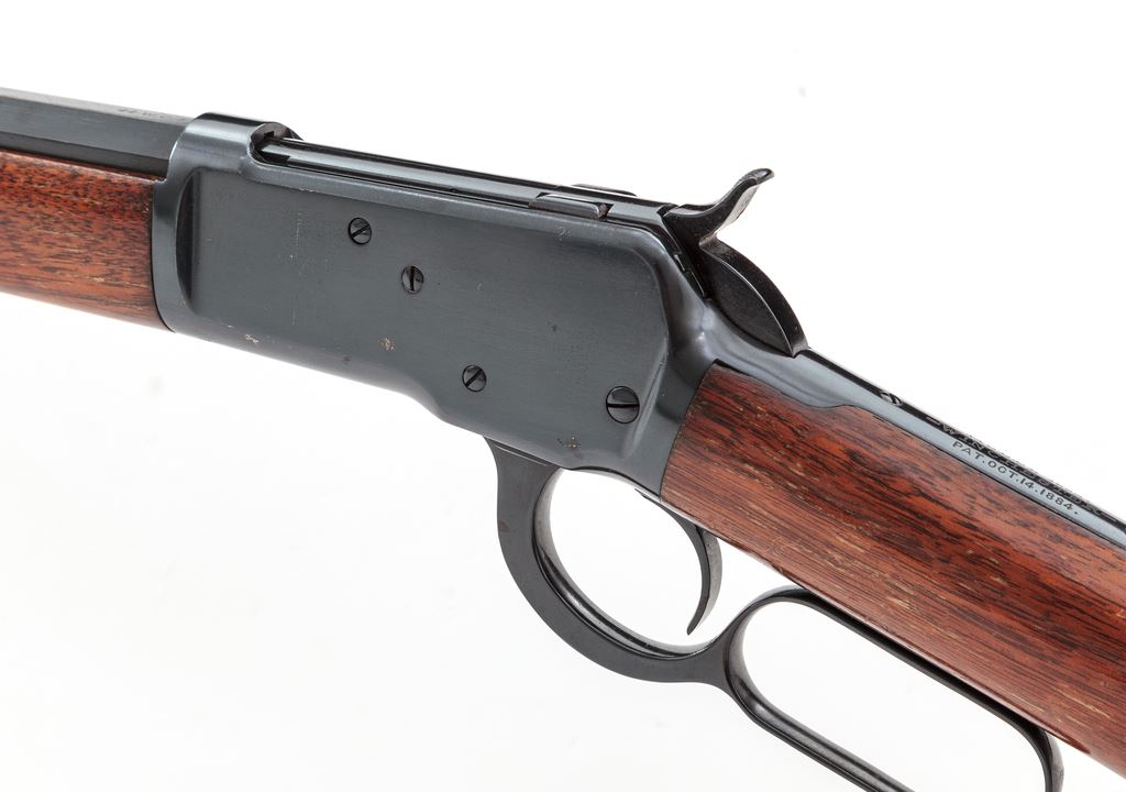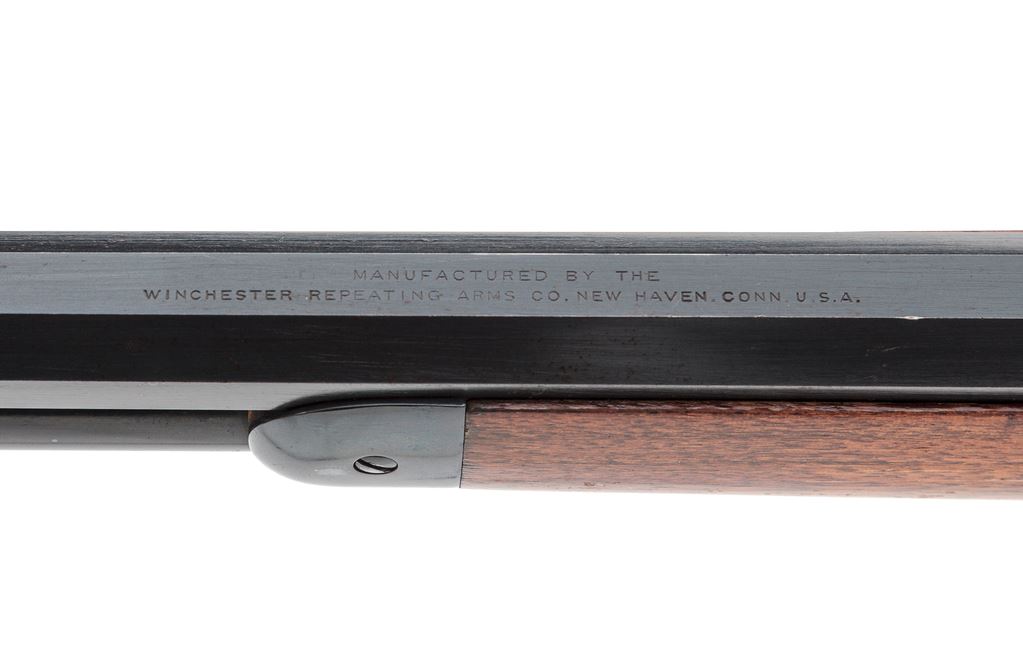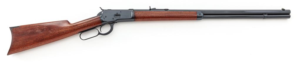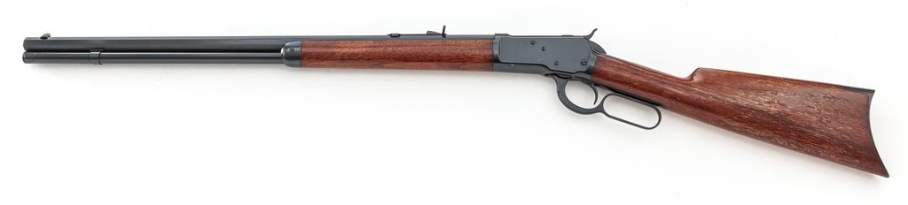 Antique Winchester Model 1892 Lever Action Rifle, #131151, .44 W.C.F. (.44-40) cal., 24'' octagonal barrel, standard open rifle sights, marked with maker's name and address on top and caliber at breech; full-length mag tube beneath; receiver has loop operating lever that opens breech for auto cartridge chambering-top ejection, marked ''Model 1892/Wincheste /Pat. Oct. 14, 1884'' on top tang and ser. no. at bottom front; oil-finished walnut forearm with steel nosecap and matching buttstock with steel crescent buttplate. Mfg'd ca. 1896, in full blued finish. Condition is good to very good as partially refinished. Barrel retains approx. 97% of what appears to be original blue, with sharp edges and markings; balance of the metal has been refinished in a later-style black-blue. Stocks are solid and smooth and virtually unmarked, having a later varnish finish that has flaking/losses to sides of buttstock. Action is crisp; bore is bright showing black-powder etching toward breech and sharp rifling. Est.: $800-$1,000. (Antique)*