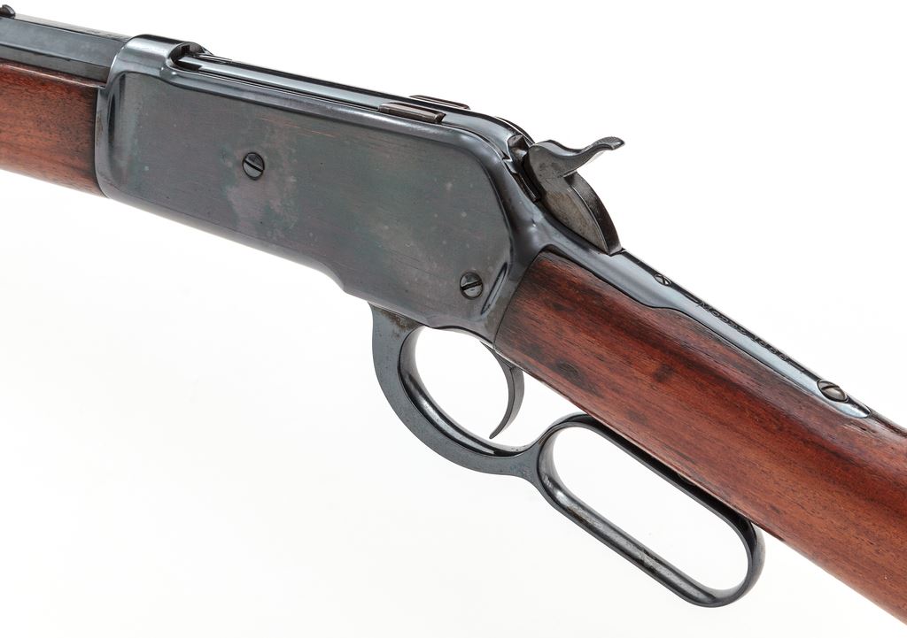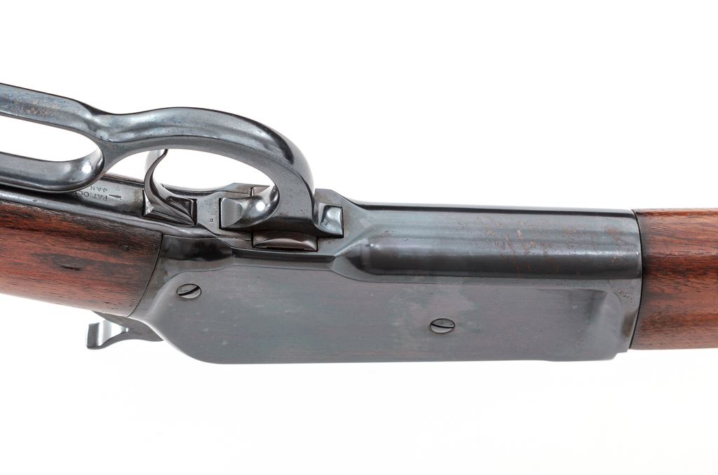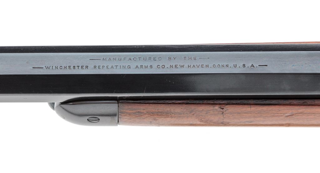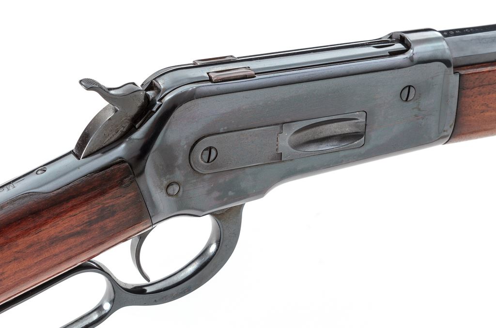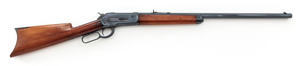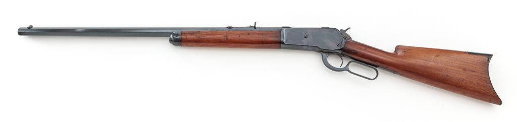 Antique Winchester Model 1886 Lever Action Rifle, #34758, .45-90 CF cal., 26'' octagonal (perhaps No. 2) barrel, buckhorn type rifle sights, marked with maker's name and address on top and caliber at breech, has button mag tube beneath; receiver with loop operating lever that drops action open for cartridge chambering-top ejection, marked ''Model 1886'' on upper tang, two-line 1884-85 patent dates and ser. no. on lower; two-piece oil-stained walnut stocks, forend with steel nosecap, buttstock with steel crescent buttplate. Mfg'd ca. 1889, originally with blued barrel and mag tube, case hardened receiver, lever, nosecap and buttplate. Condition is about good as completely refinished in deep black-blue. Stocks are smooth and solid with an added thin coat of varnish. Action is crisp; bore shows overall black-powder etching and defined rifling. Est.: $900-$1,200. (Antique)