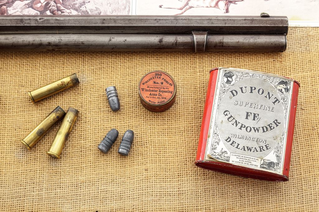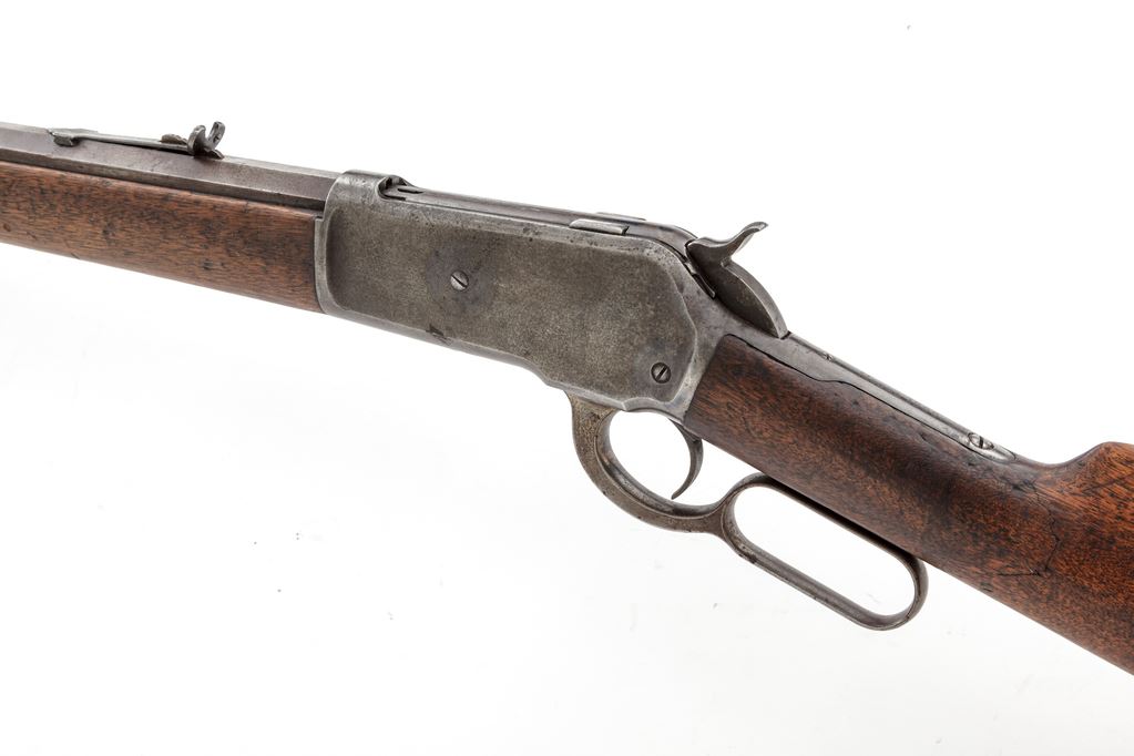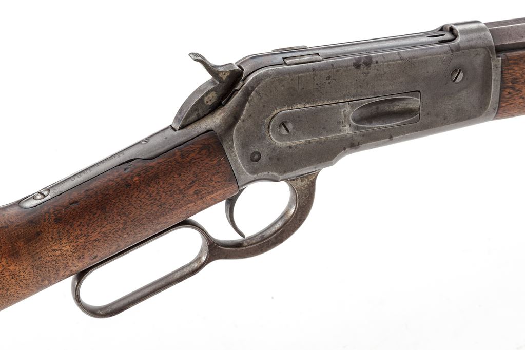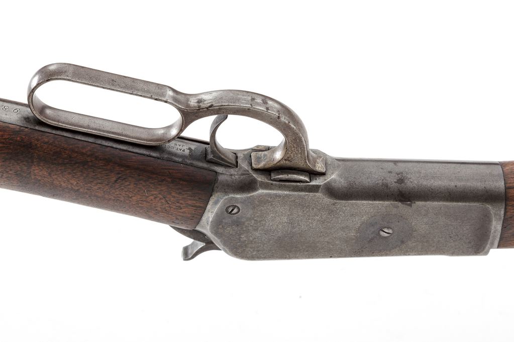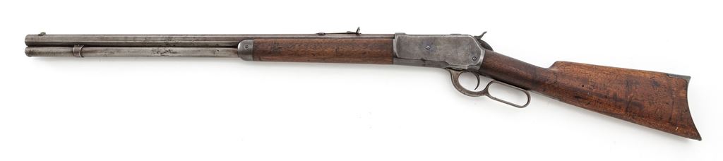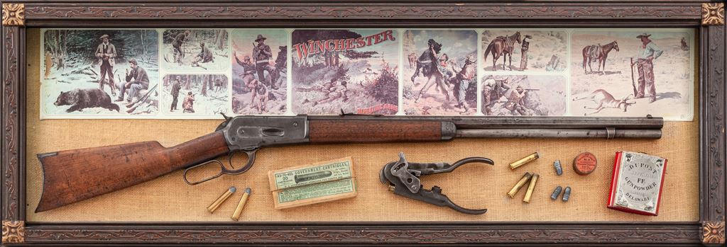 Antique Winchester Model 1886 Lever Action Rifle, with glass-top display case, reloading tool, empty cartridge box, powder can, primer tin and several large-caliber cartridges, #98019, .38-56 W.C.F. cal., 26'' octagonal barrel with buckhorn sights, marked with maker's name and address on top flat, caliber at breech, full-length mag tube below; receiver has top ejection, bottom operating lever, ''Model 1886'' at top tang; two-piece oil-finished walnut stocks, the forend retained by a steel nosecap, the buttstock with crescent buttplate. Mfg'd ca. 1895, with blued barrel, the balance case hardened. Condition is very good retaining no original finishes (small traces of barrel blue) but a generally smooth gunmetal gray/brown, mag tube has 1/16'' hole drilled at left side, bottom dented midway along length, with corresponding dings to both sides of barrel. Stocks are sound with a secure crack at left wrist and a 1/16'' hole drilled in left side at mid-buttstock, showing scattered marks. Action is smooth but does not hold full-cock; bore is clean with light overall frosting and deep spiral rifling. Display case and accoutrements are very good. Est.: $1,200-$1,800. (Antique)(Special packaging required.)