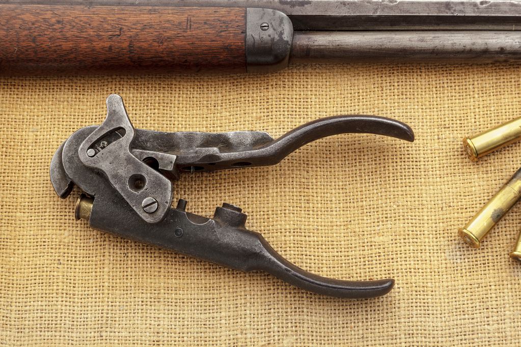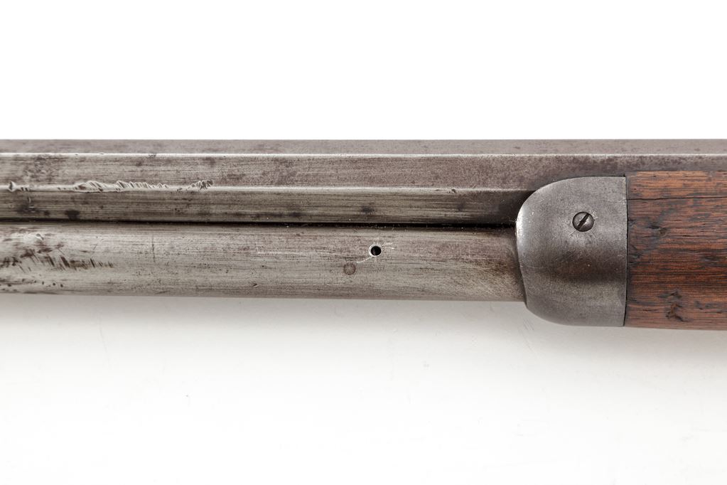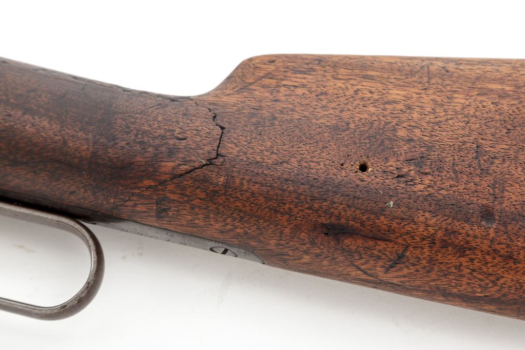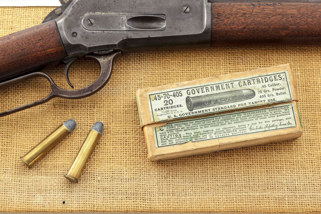 Antique Winchester Model 1886 Lever Action Rifle, with glass-top display case, reloading tool, empty cartridge box, powder can, primer tin and several large-caliber cartridges, #98019, .38-56 W.C.F. cal., 26'' octagonal barrel with buckhorn sights, marked with maker's name and address on top flat, caliber at breech, full-length mag tube below; receiver has top ejection, bottom operating lever, ''Model 1886'' at top tang; two-piece oil-finished walnut stocks, the forend retained by a steel nosecap, the buttstock with crescent buttplate. Mfg'd ca. 1895, with blued barrel, the balance case hardened. Condition is very good retaining no original finishes (small traces of barrel blue) but a generally smooth gunmetal gray/brown, mag tube has 1/16'' hole drilled at left side, bottom dented midway along length, with corresponding dings to both sides of barrel. Stocks are sound with a secure crack at left wrist and a 1/16'' hole drilled in left side at mid-buttstock, showing scattered marks. Action is smooth but does not hold full-cock; bore is clean with light overall frosting and deep spiral rifling. Display case and accoutrements are very good. Est.: $1,200-$1,800. (Antique)(Special packaging required.)