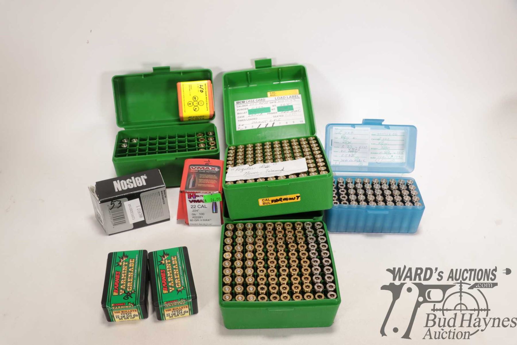 Apprx 260 .222 brass and a selection of bullets including 136 count of Barnes .22 cal 36gr HP, 76 count box of Hornady .22 cal 60gr V-Max, 53 count box of Nosler 40gr Spitzer, and a 40 count box of Berger .22 cal 40gr